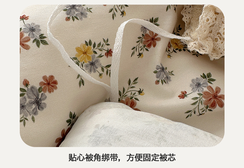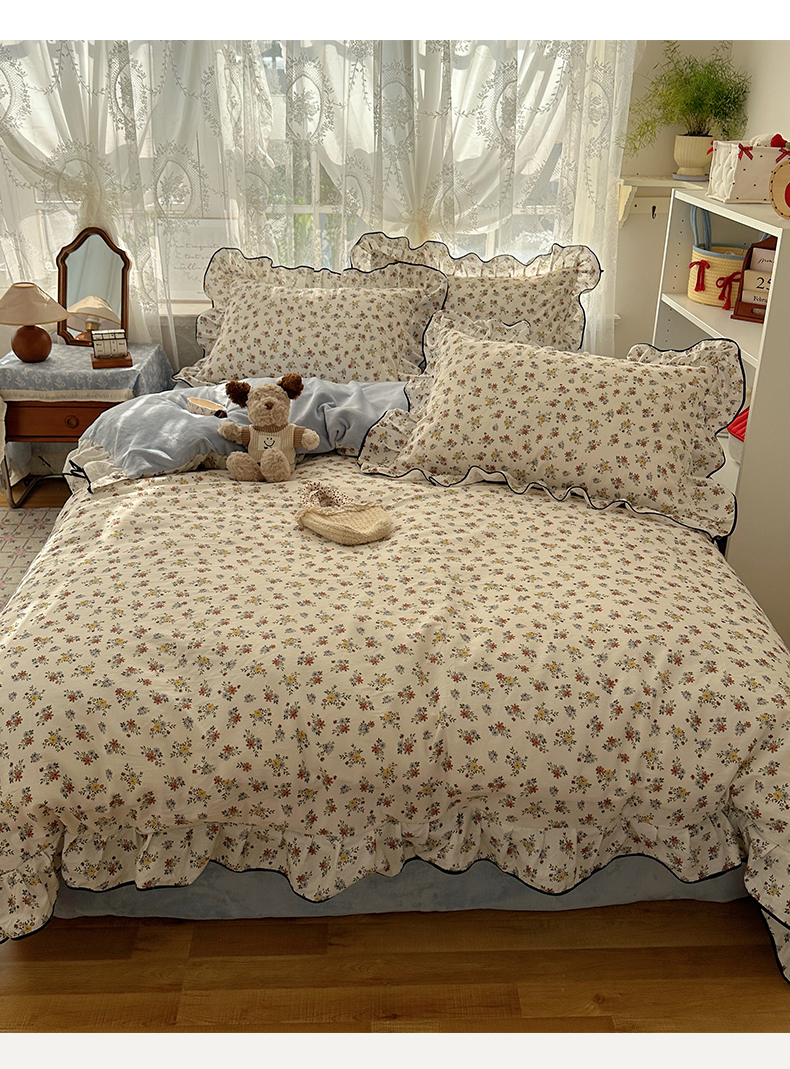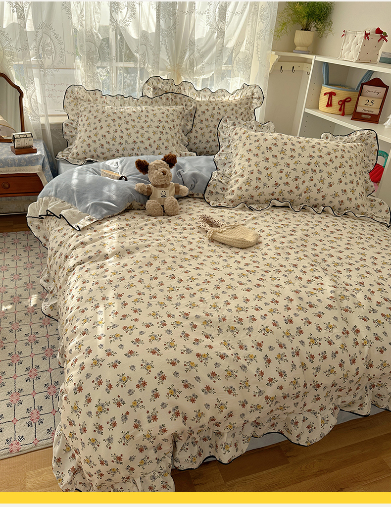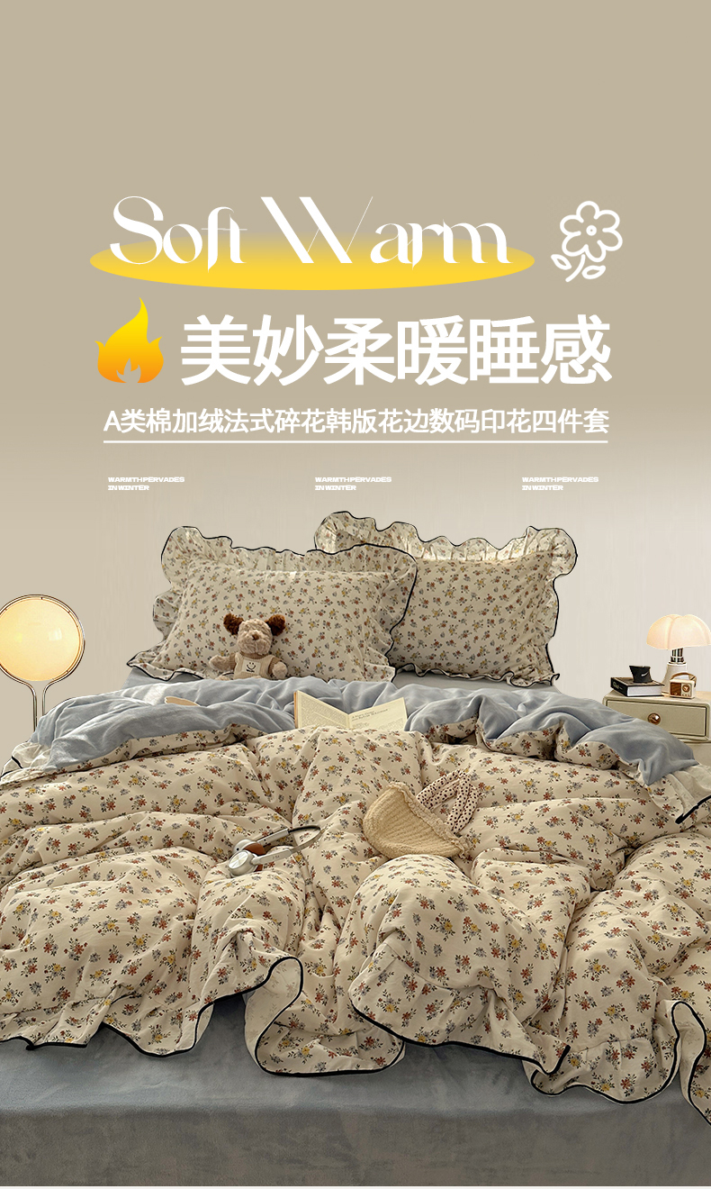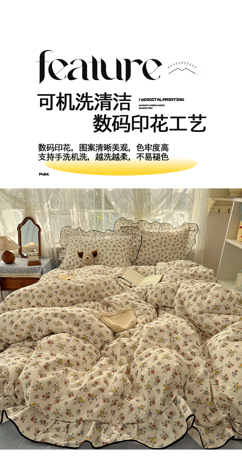 商品名称:桃子家居 2025新款A类纯棉数码印花法式碎花棉加绒韩版花边碎花加厚牛奶绒四件套 棉加绒-花边素瑾