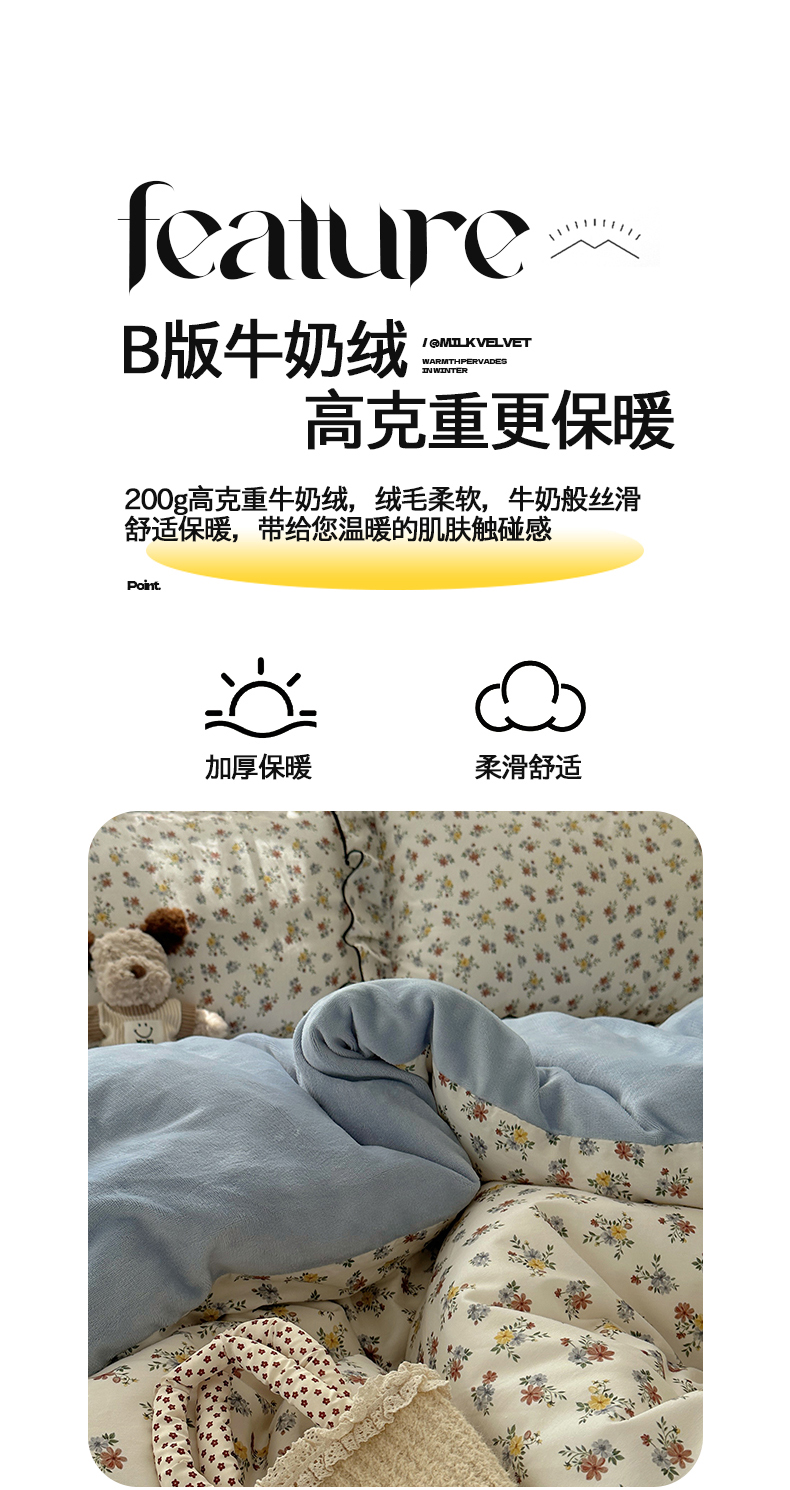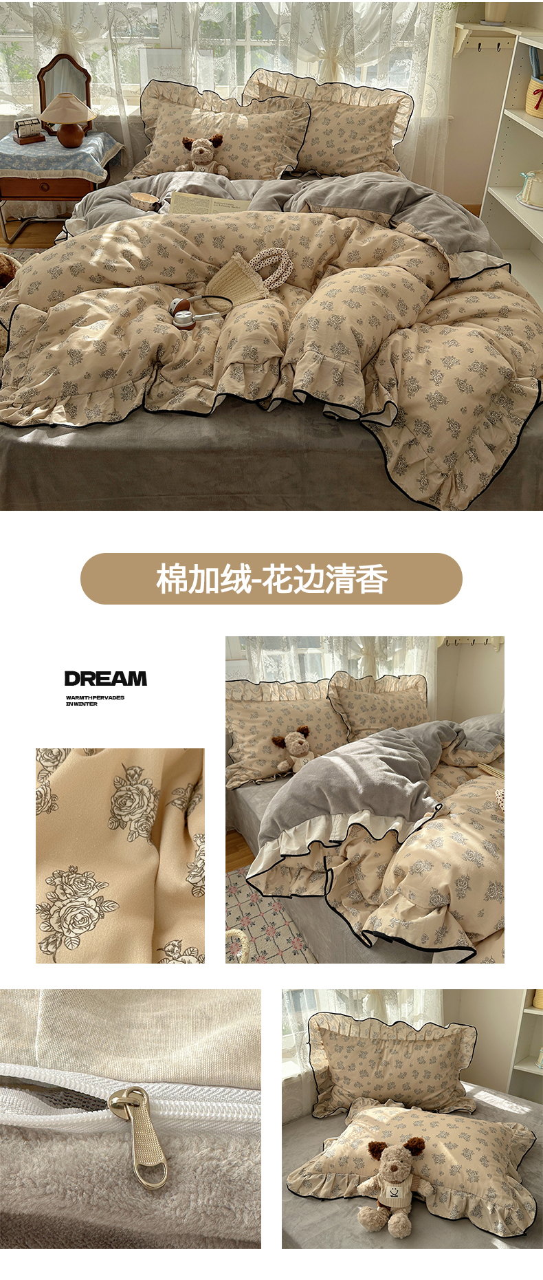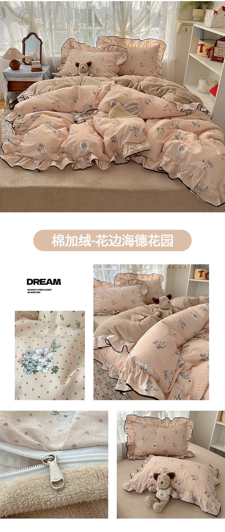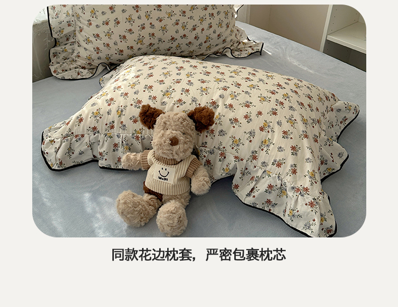 商品名称:桃子家居 2025新款A类纯棉数码印花法式碎花棉加绒韩版花边碎花加厚牛奶绒四件套 棉加绒-花边素瑾