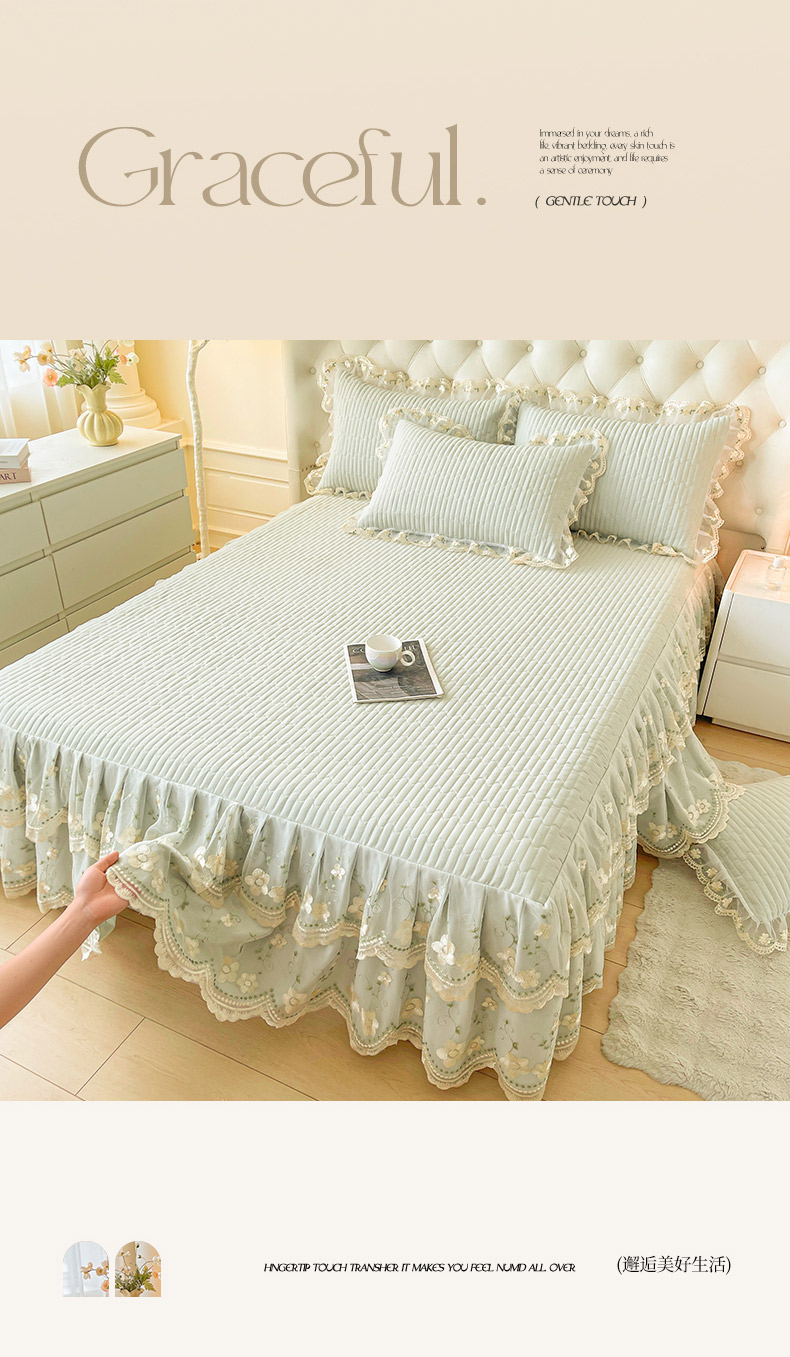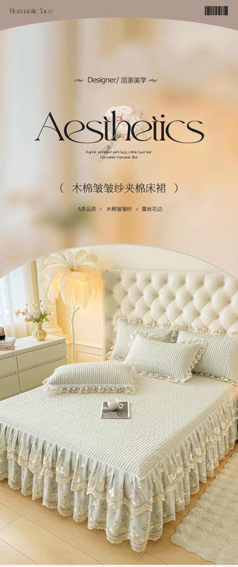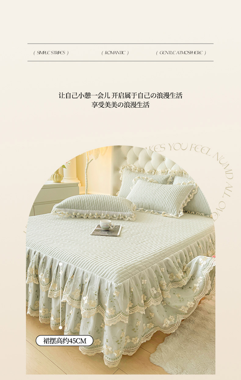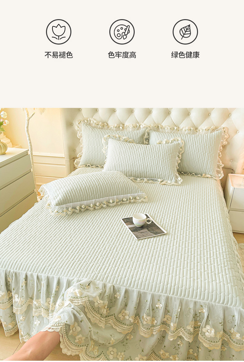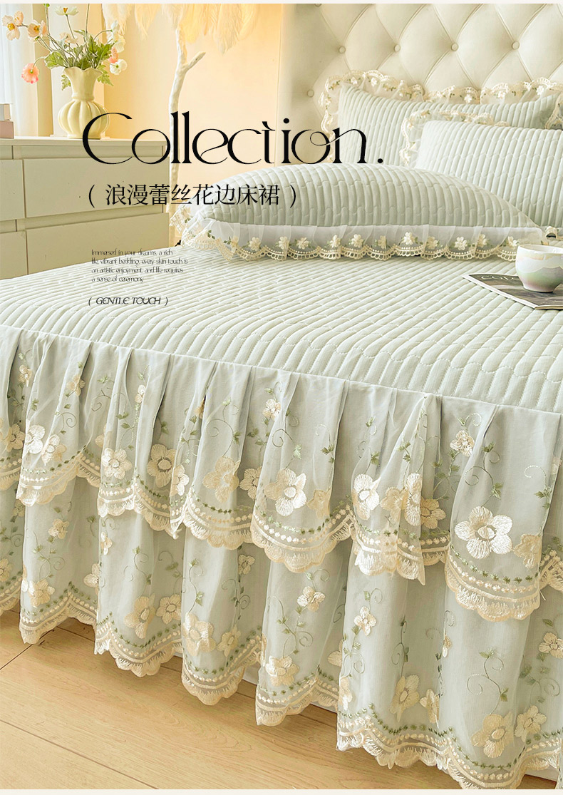 • 91家纺网 家纺一手货源 找家纺 鼎丰家纺 2025新款皱皱纱夹棉床裙三件套--晨曦系列 晨曦-嫩绿