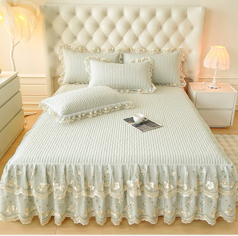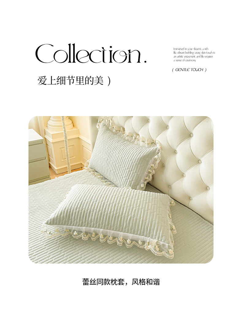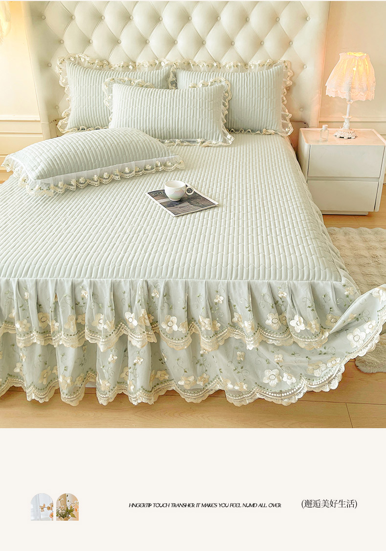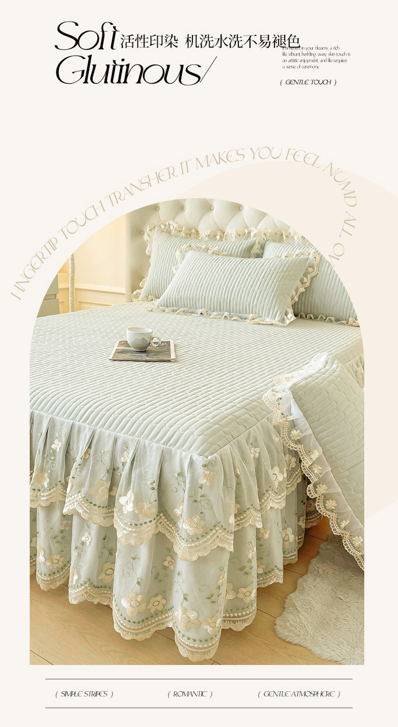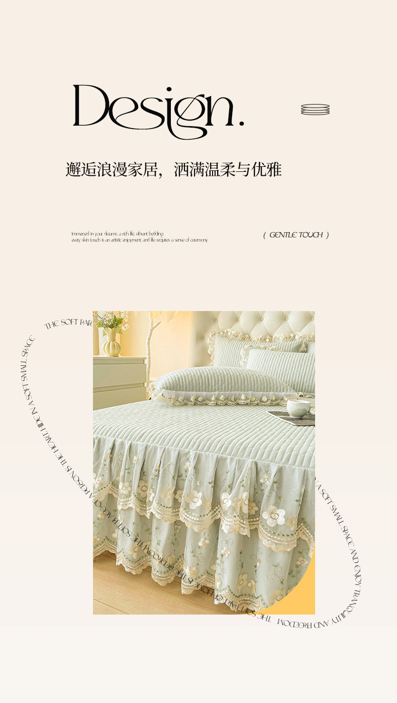 • 91家纺网 家纺一手货源 找家纺 鼎丰家纺 2025新款皱皱纱夹棉床裙三件套--晨曦系列 晨曦-嫩绿