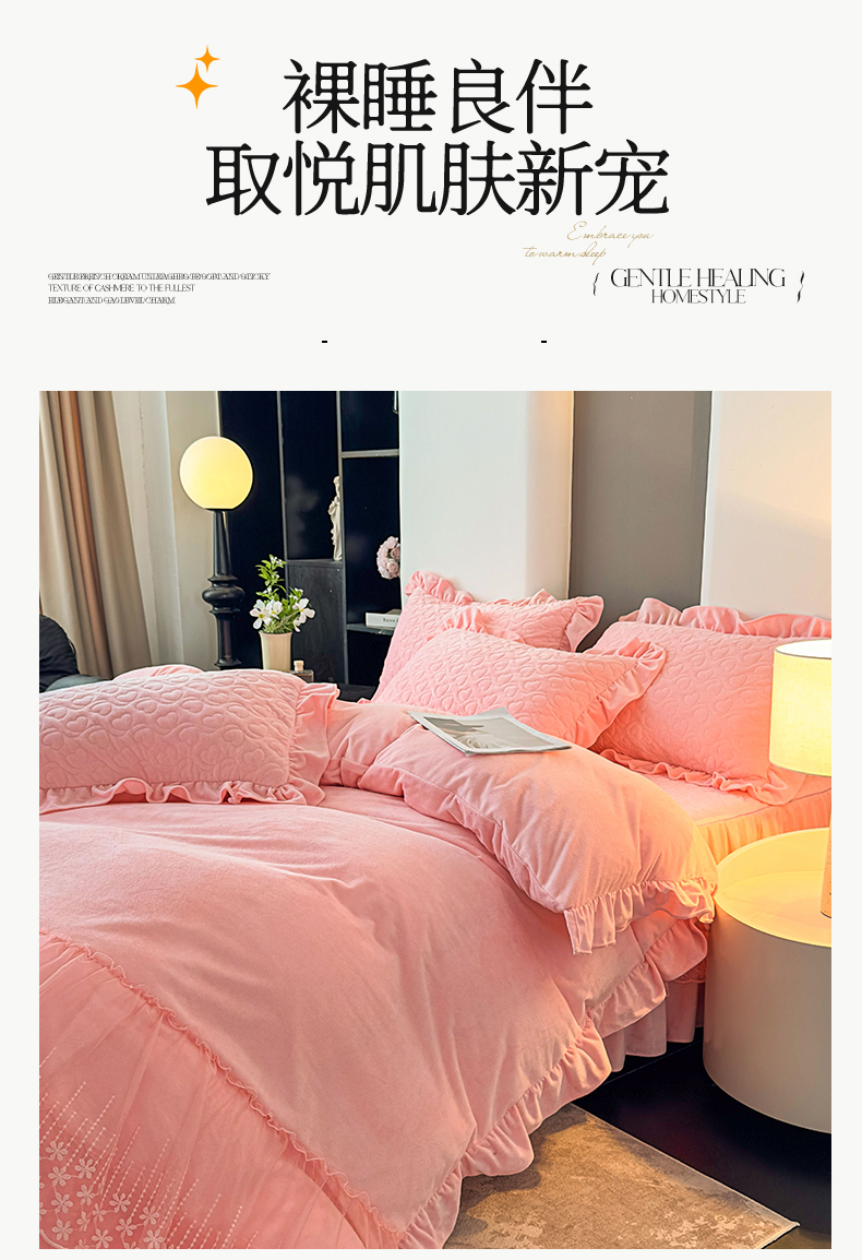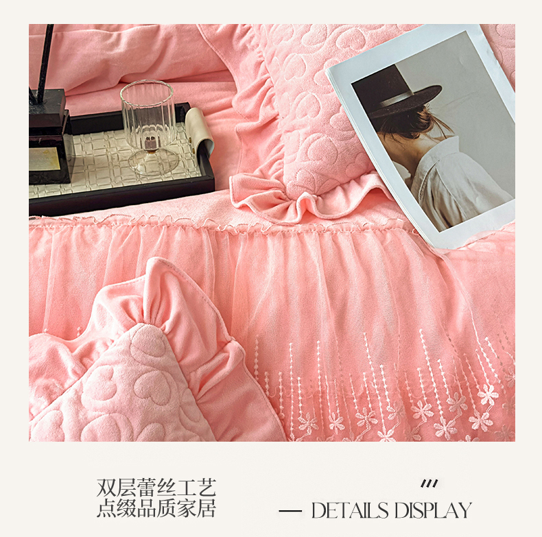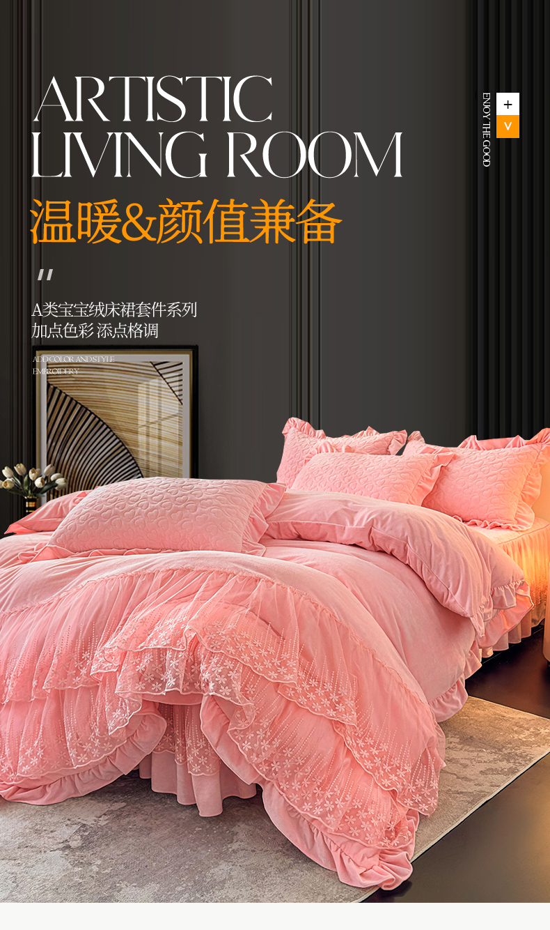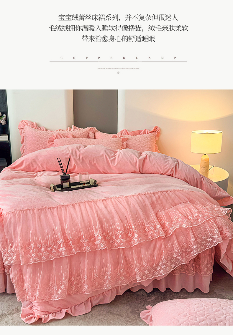当前位置: 91家纺网 > 商品网购 > 床品套件 > 四件套 > 其它四件套 > 恒爱家纺 2025新款宝宝绒紫陌听雪床裙款四件套终版 贵妃粉