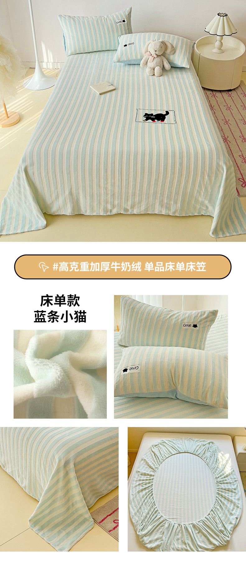 商品名称:繁花家居 2025新款经典条纹系列绣花牛奶绒单品床单床笠床单床笠单件 床单-蓝条小猫