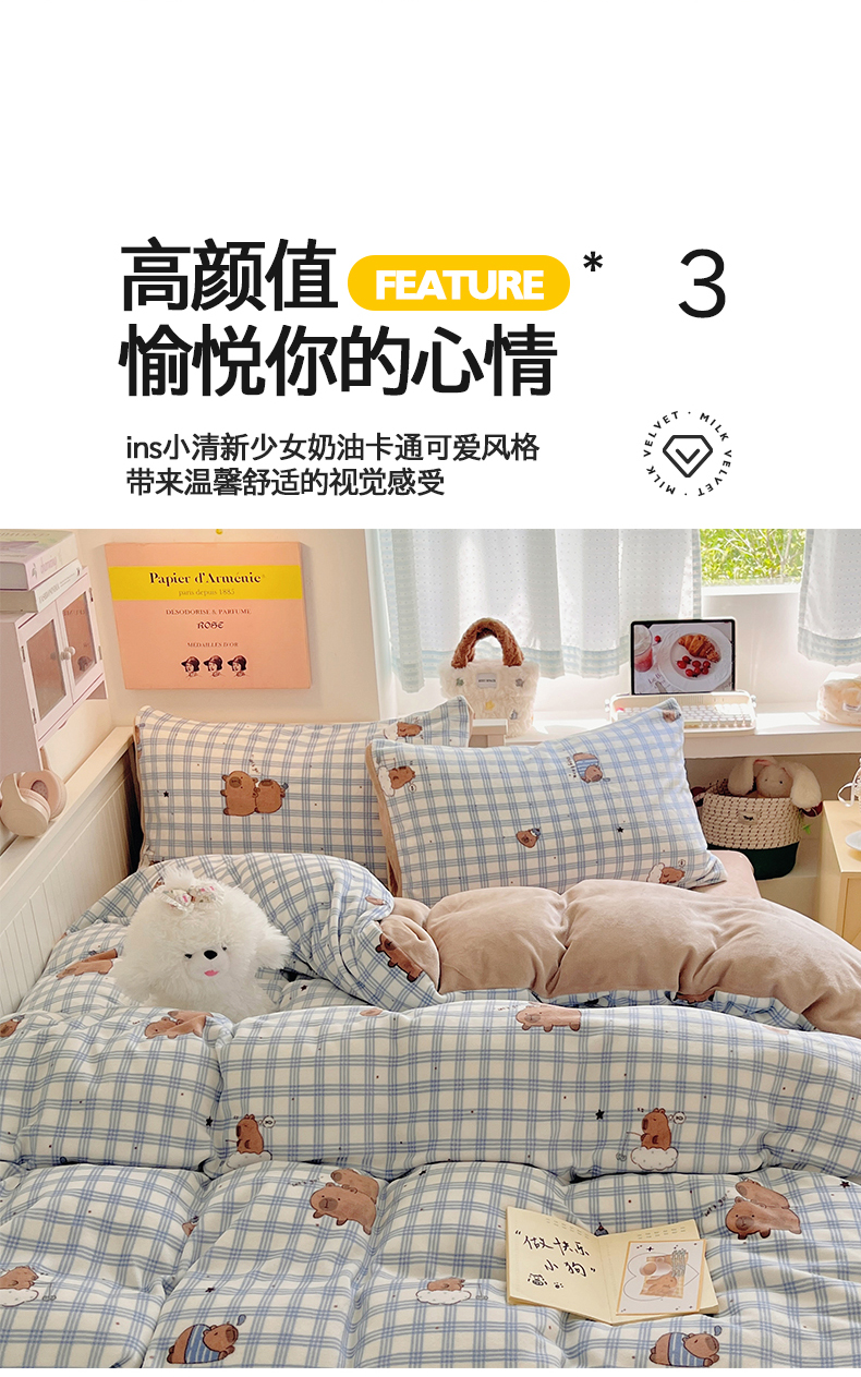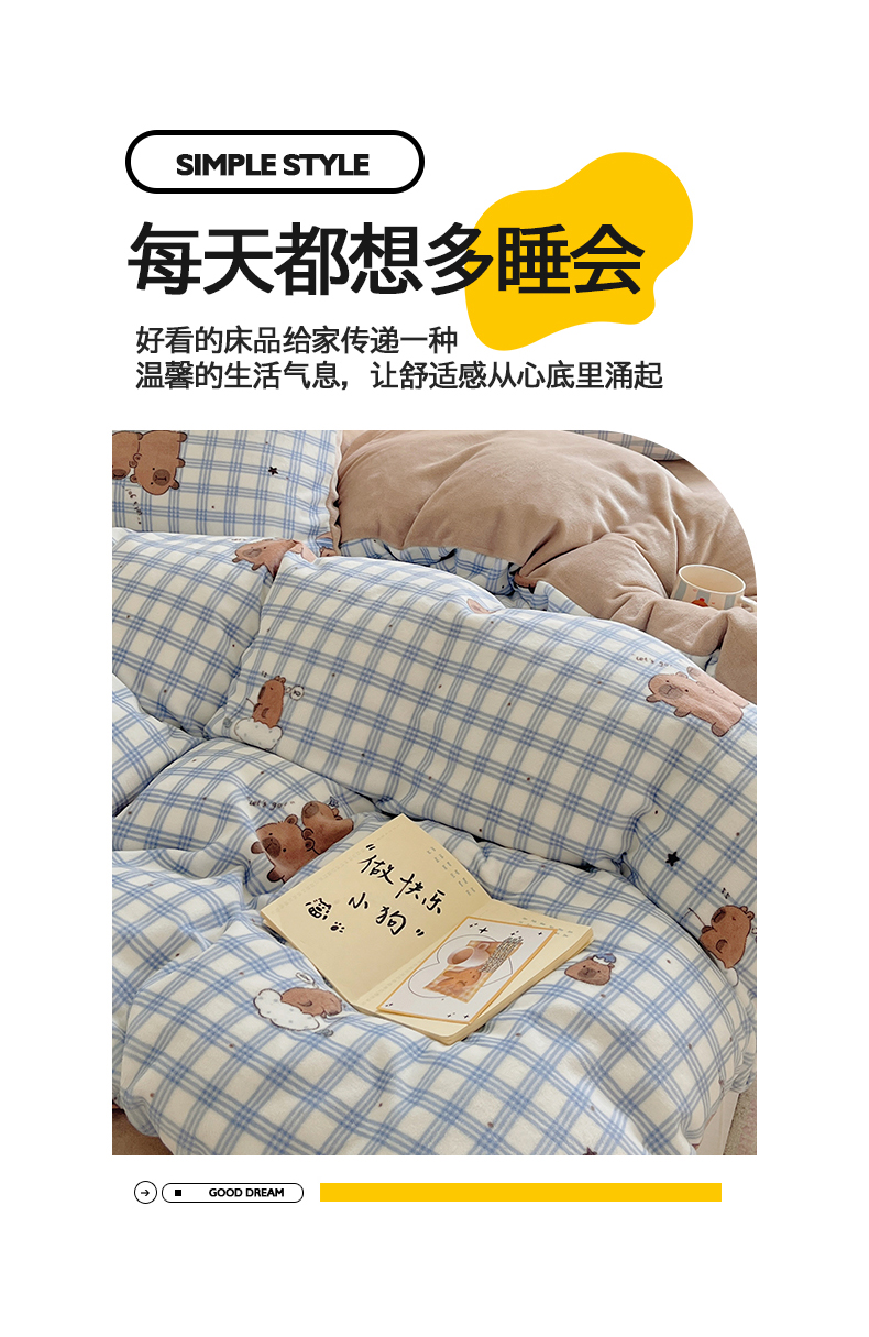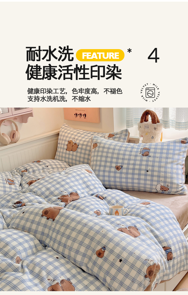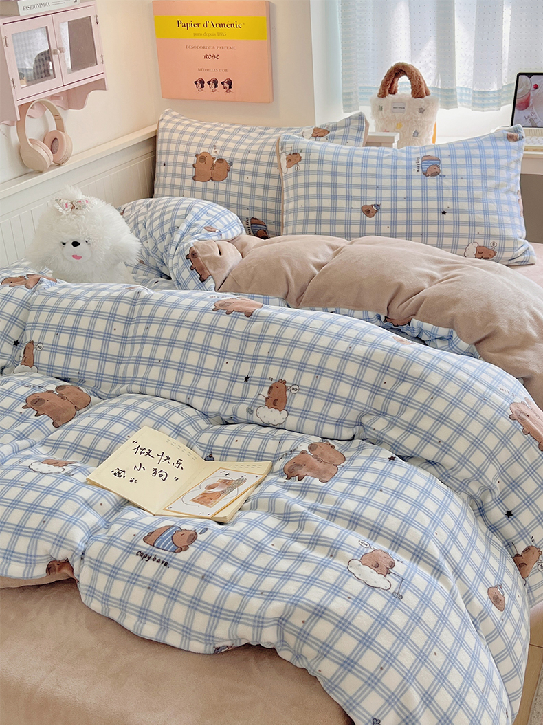 商品名称:金爱家 2025新款A类ins小清新少女奶油卡通可爱加厚牛奶绒四件套 绒-蓝格卡皮巴拉