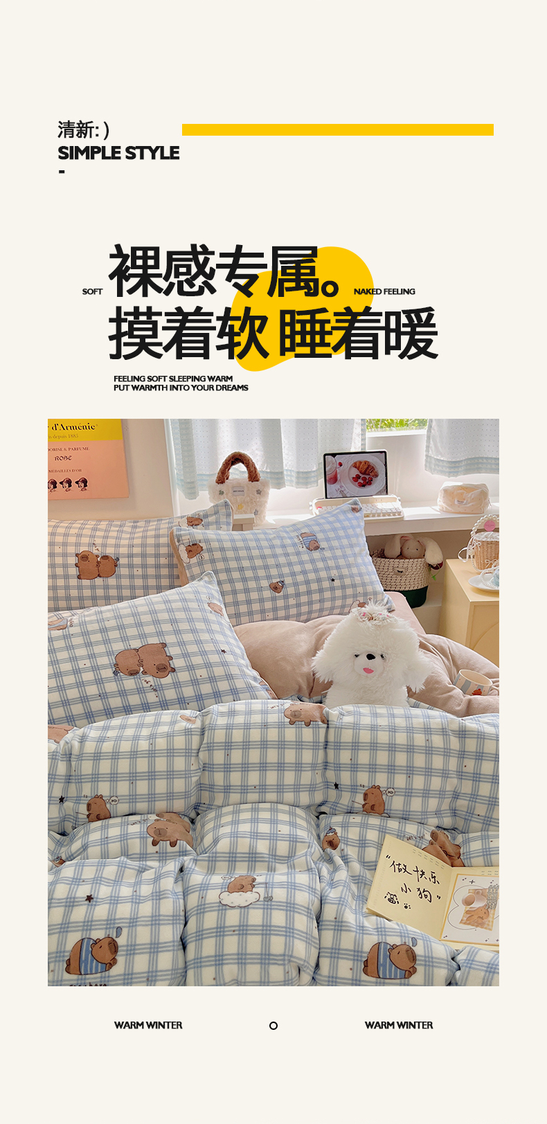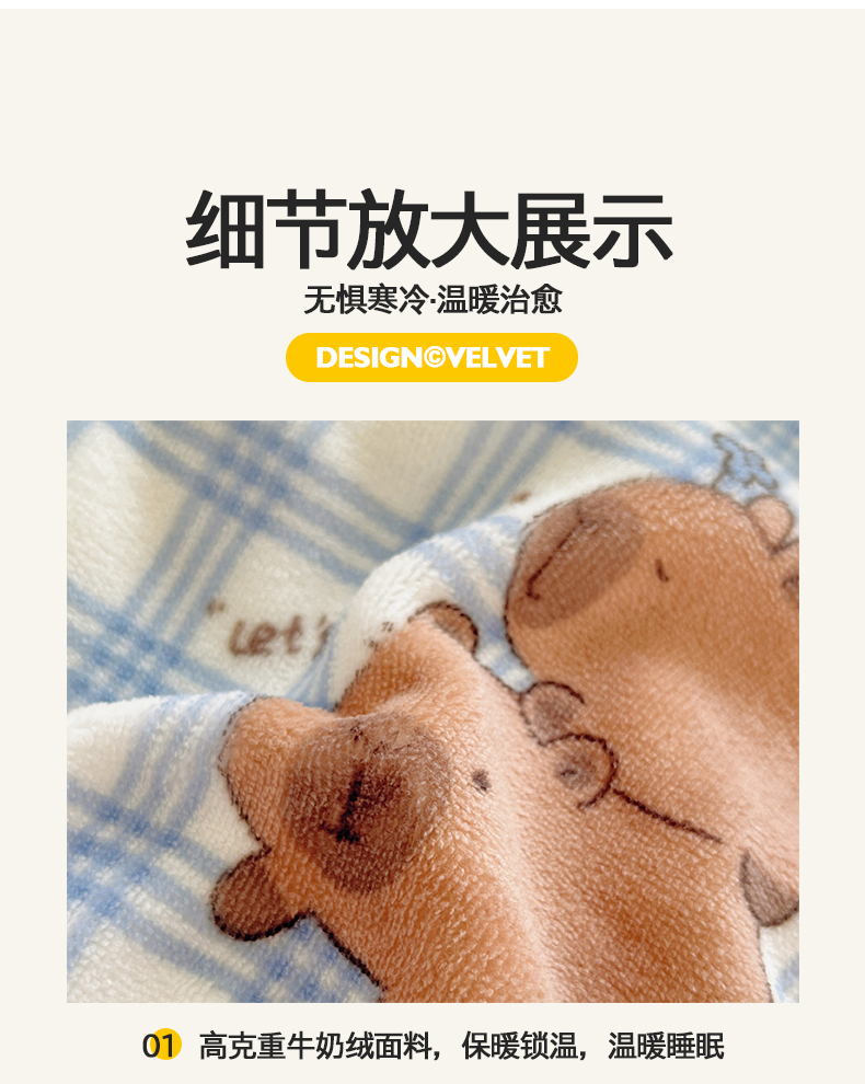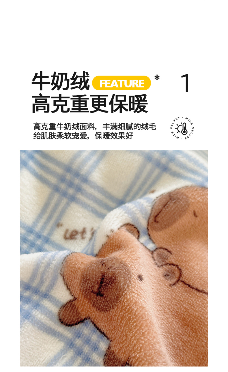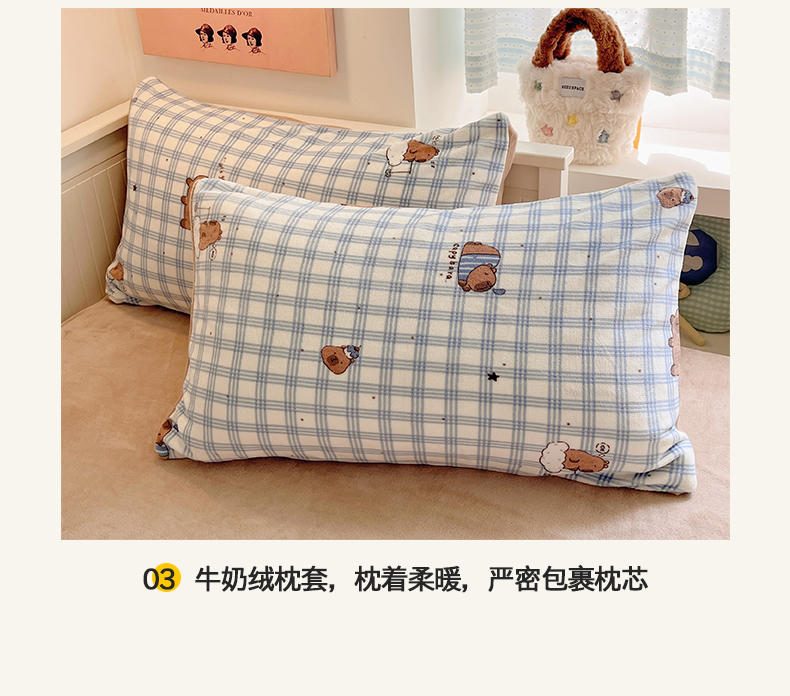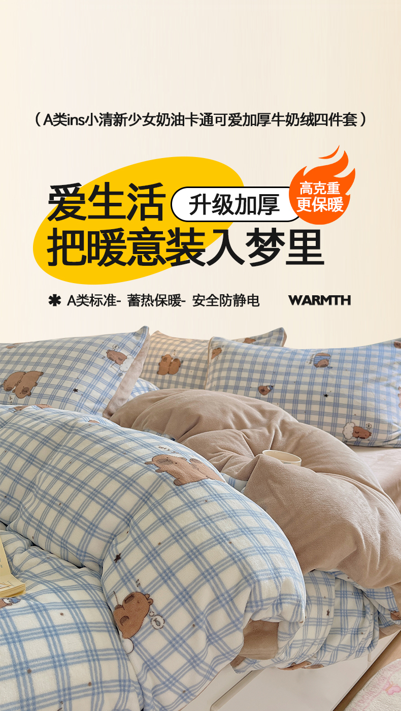 商品名称:金爱家 2025新款A类ins小清新少女奶油卡通可爱加厚牛奶绒四件套 绒-蓝格卡皮巴拉