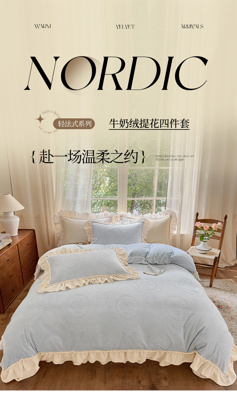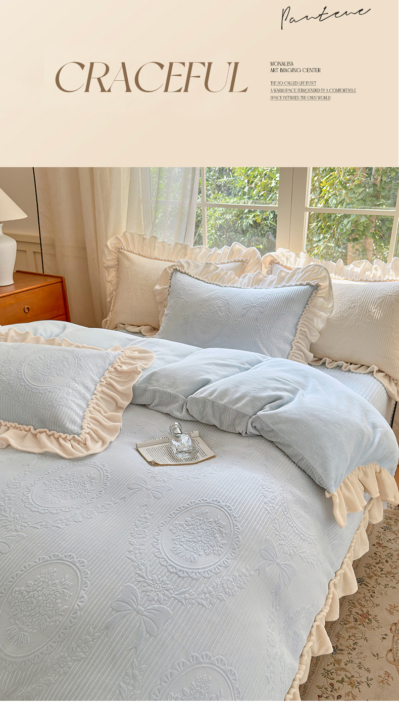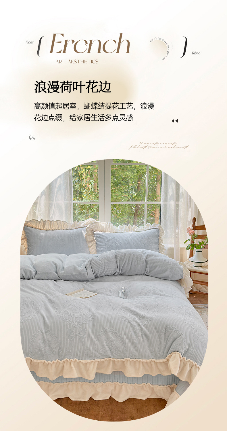 当前位置: 91家纺网 > 商品网购 > 床品套件 > 四件套 > 牛奶绒四件套 > 乐野家居 2025年新款轻法式甜心蝴蝶结高克重提花牛奶绒床盖四件套 甜心蝴蝶结-兰