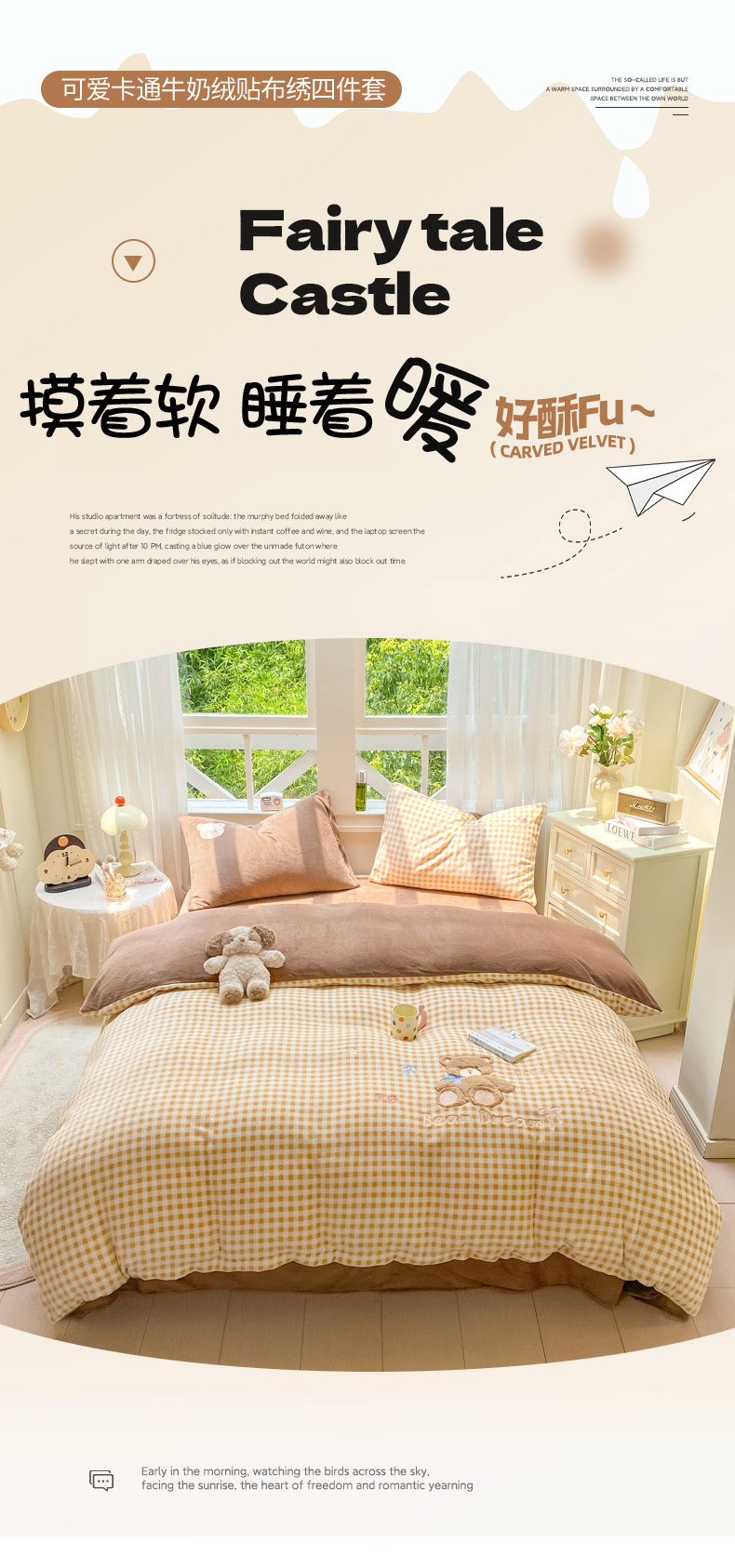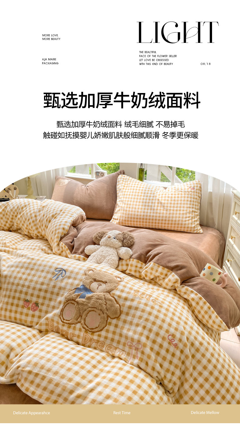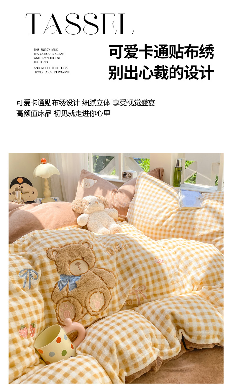 商品名称:雨帆家纺 2025新款可爱卡通牛奶绒贴布绣四件套 奶咖小熊