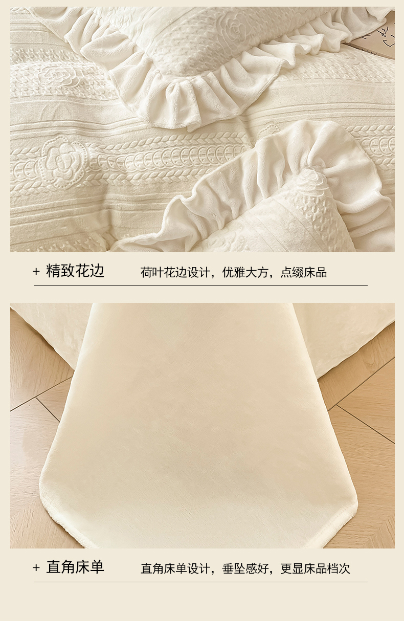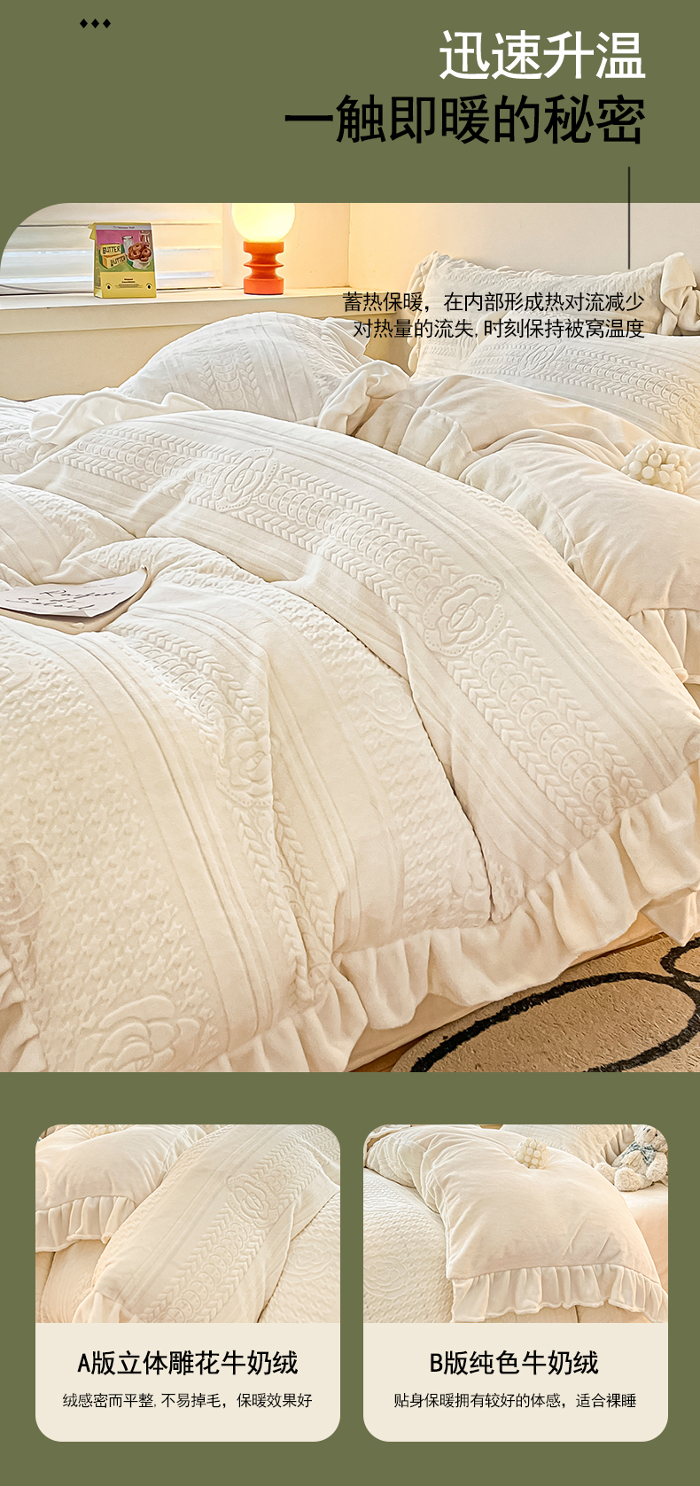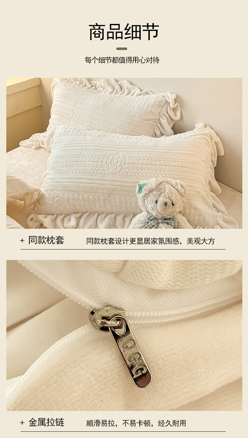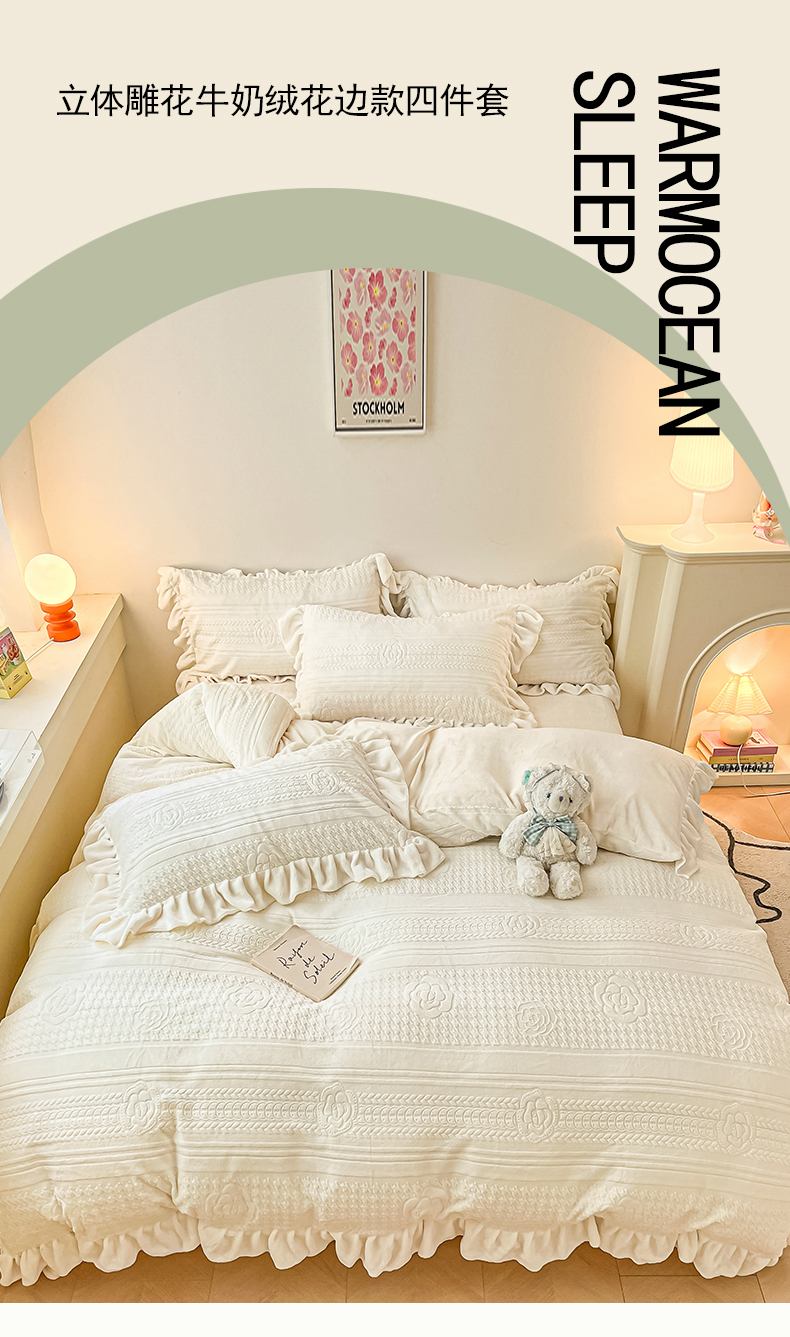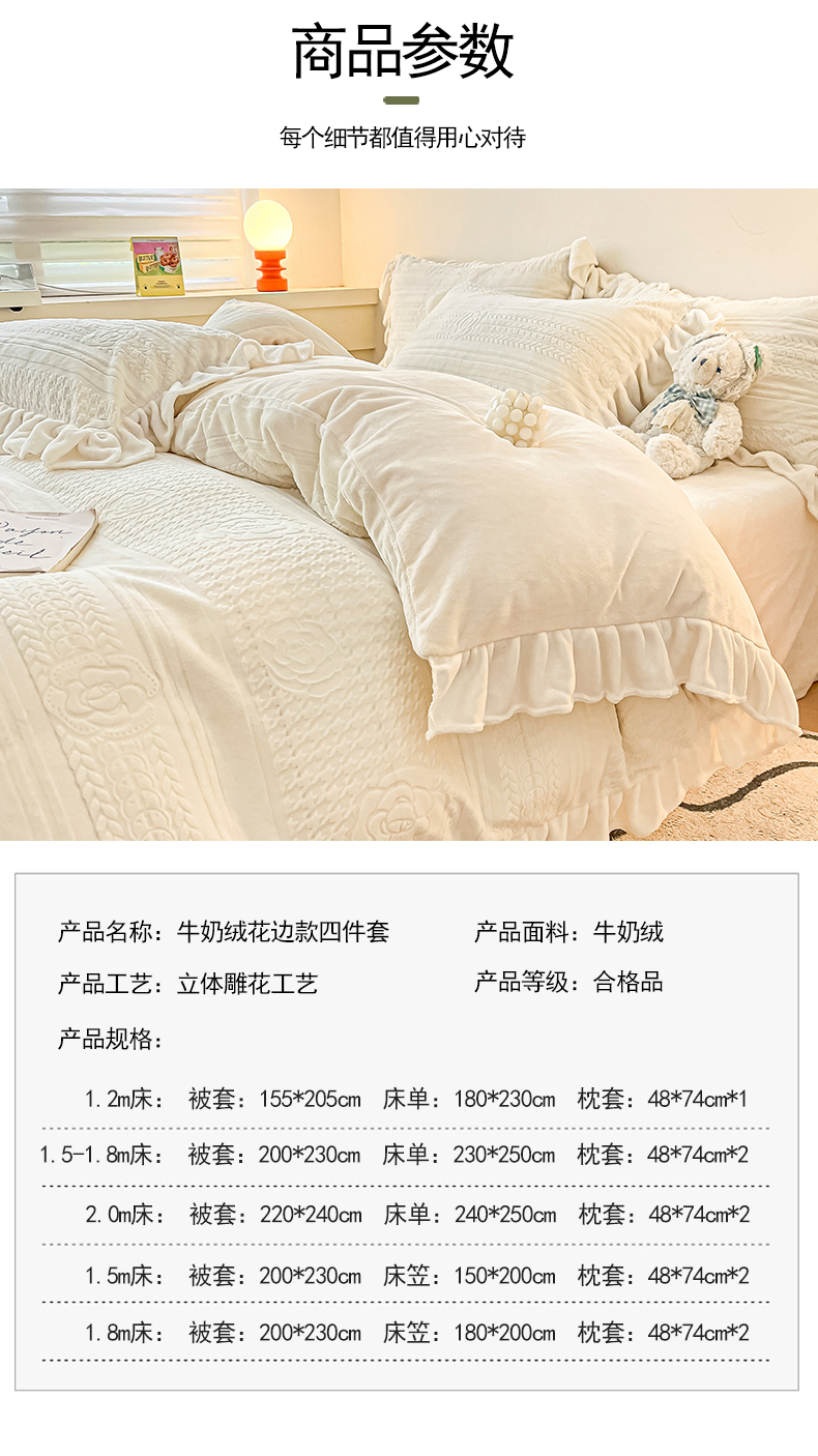 当前位置: 91家纺网 > 商品网购 > 床品套件 > 四件套 > 牛奶绒四件套 > 琪格格纺织 2025新款全消光小清新花边款雕花牛奶绒四件套 雕花绒花边 摩尔庄园 奶昔白