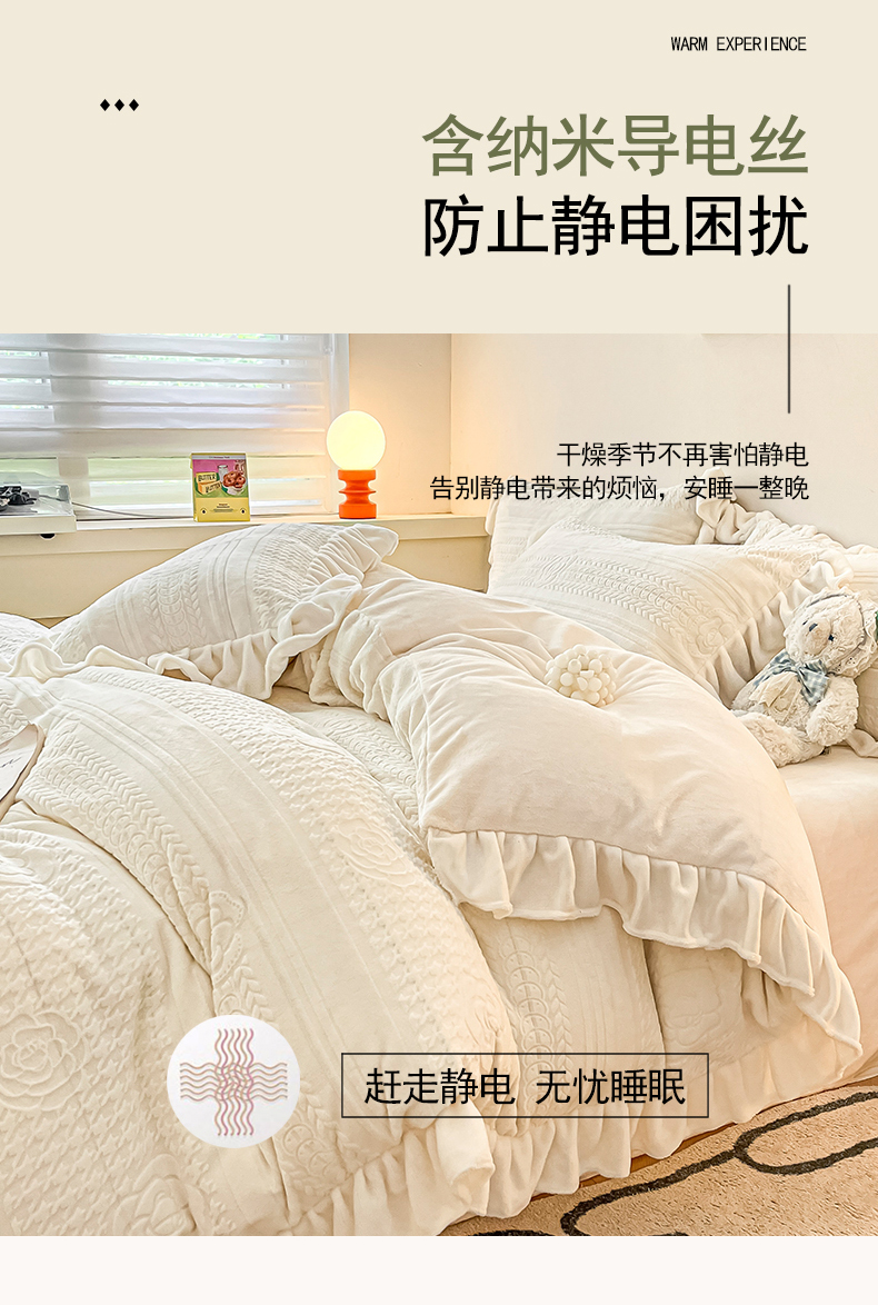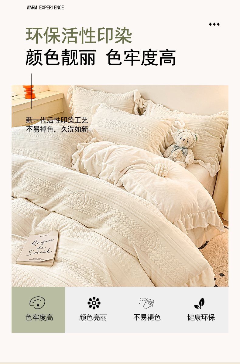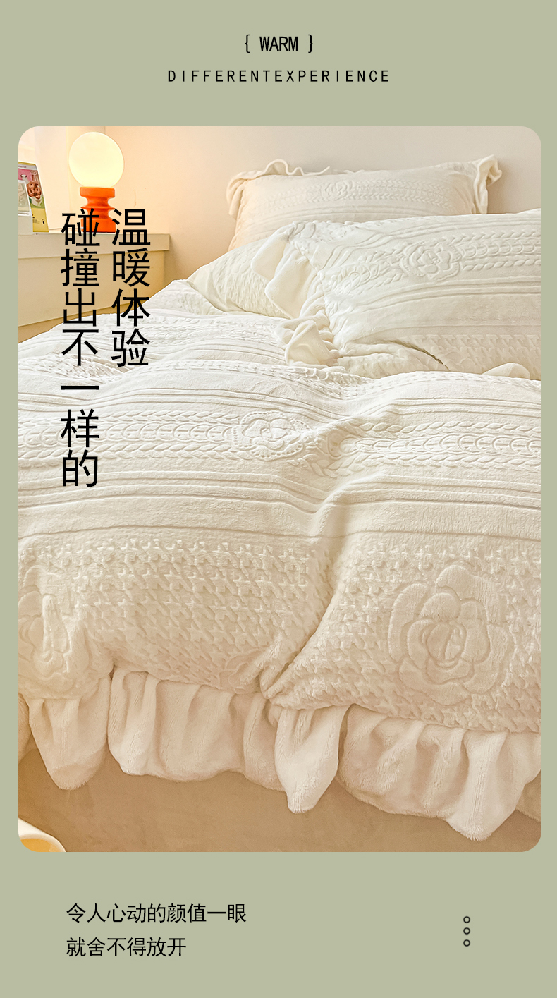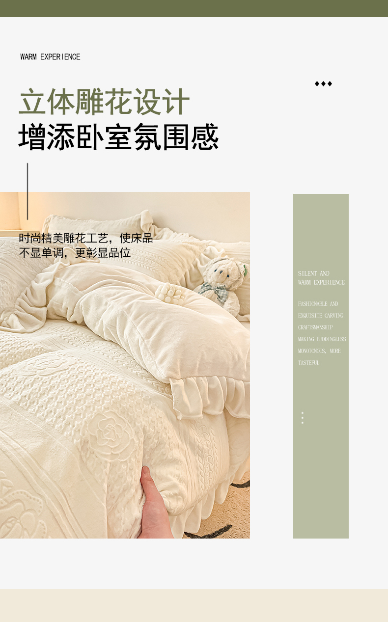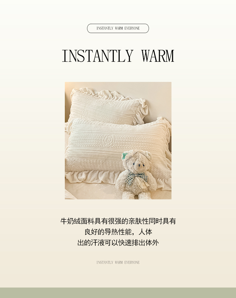 当前位置: 91家纺网 > 商品网购 > 床品套件 > 四件套 > 牛奶绒四件套 > 琪格格纺织 2025新款全消光小清新花边款雕花牛奶绒四件套 雕花绒花边 摩尔庄园 奶昔白