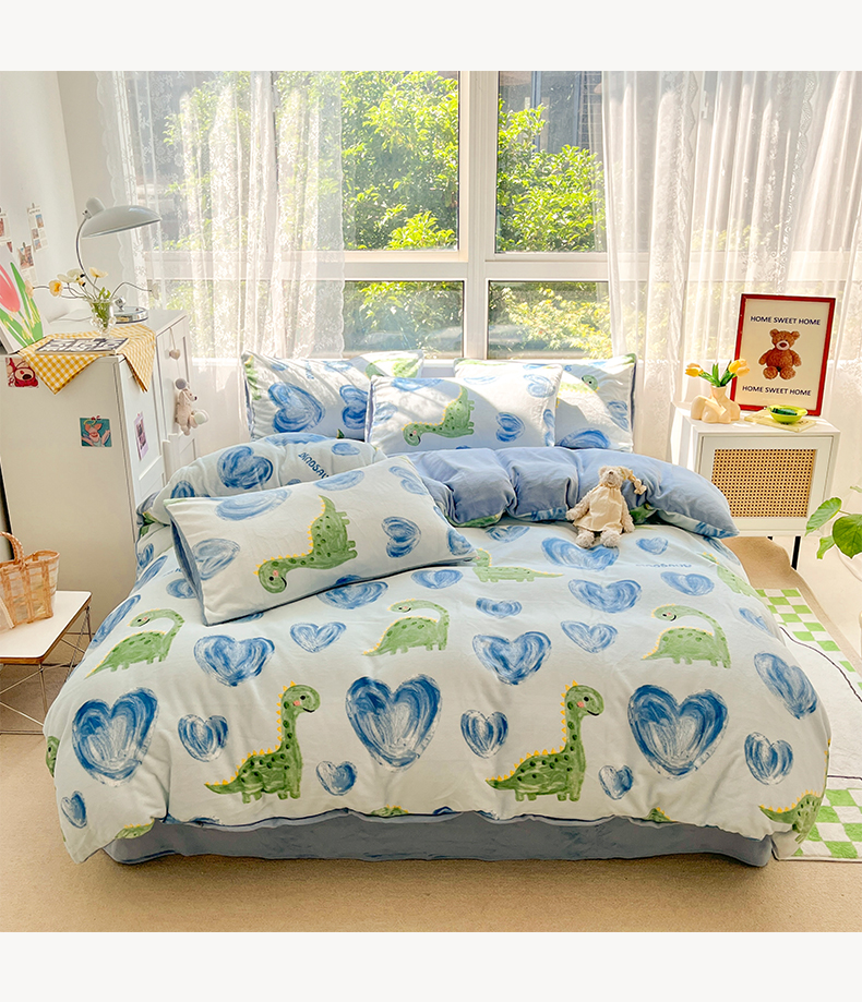 雅居纺家纺 2025新款高克重牛奶绒印花单被套 爱心恐龙