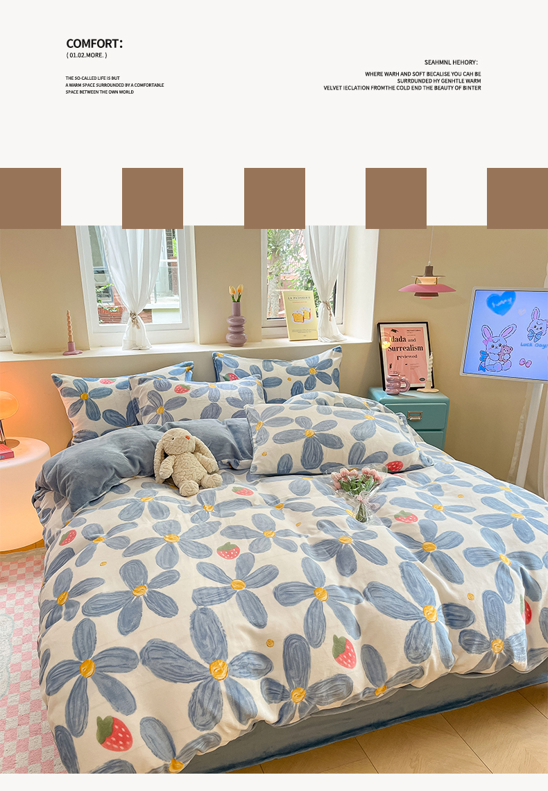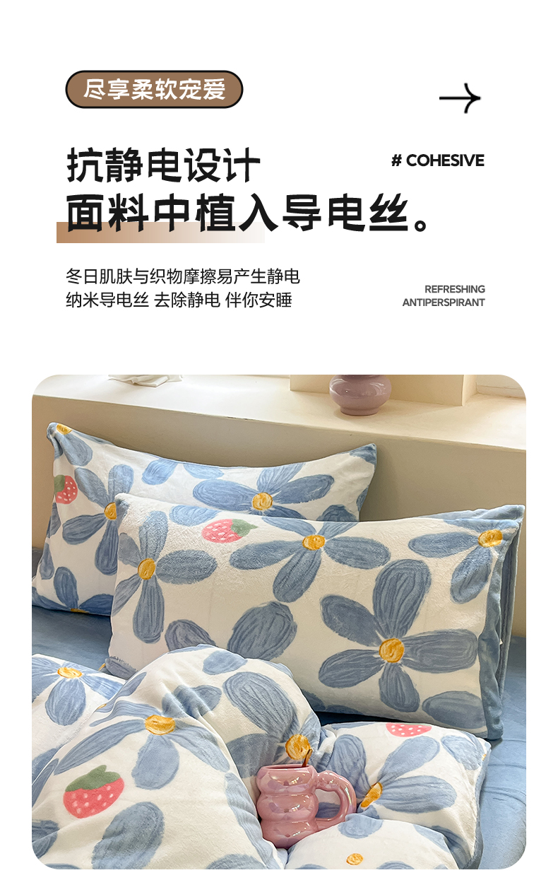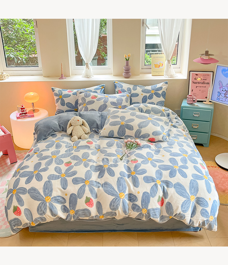商品名称:雅居纺家纺 2025新款高克重牛奶绒印花单被套 蓝墨花朵