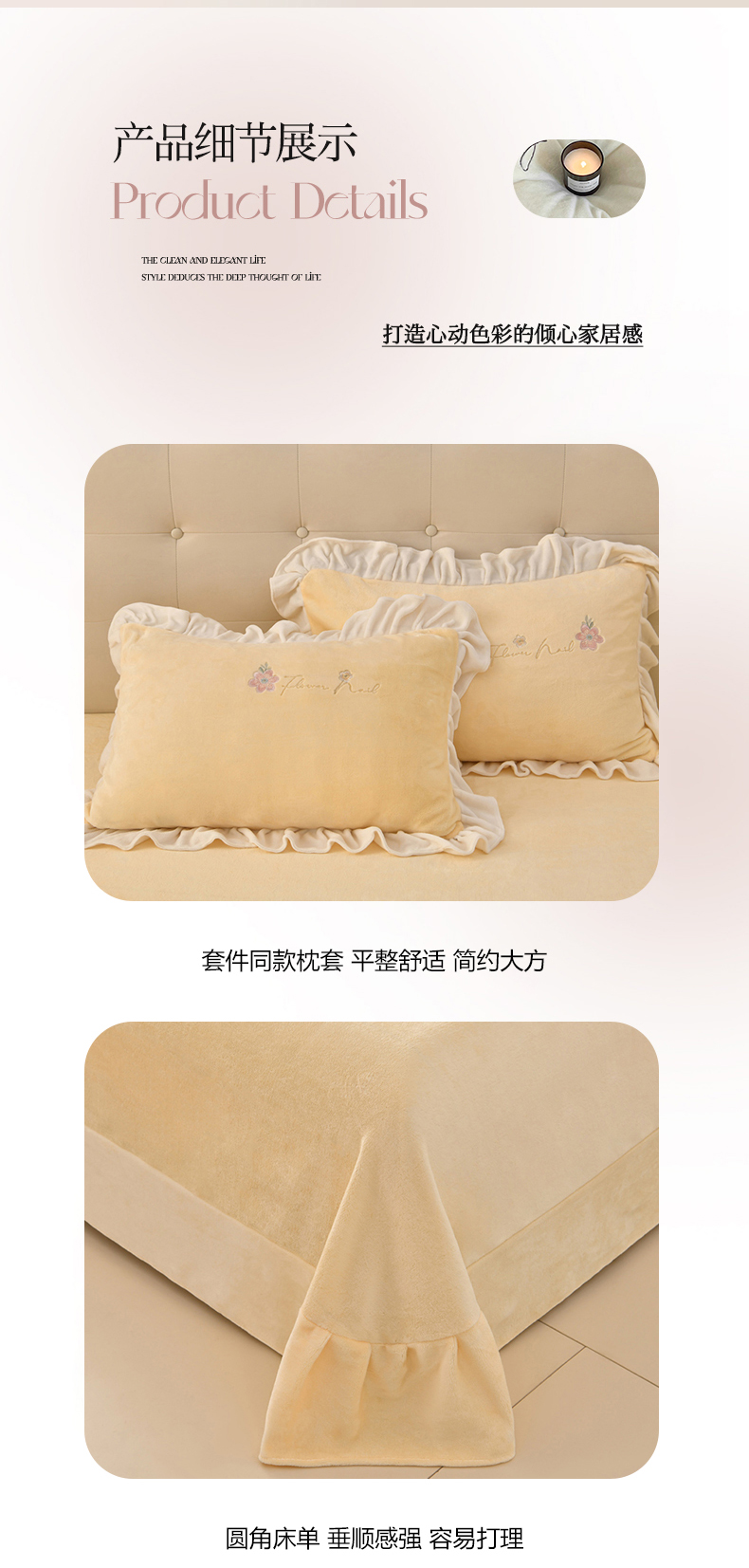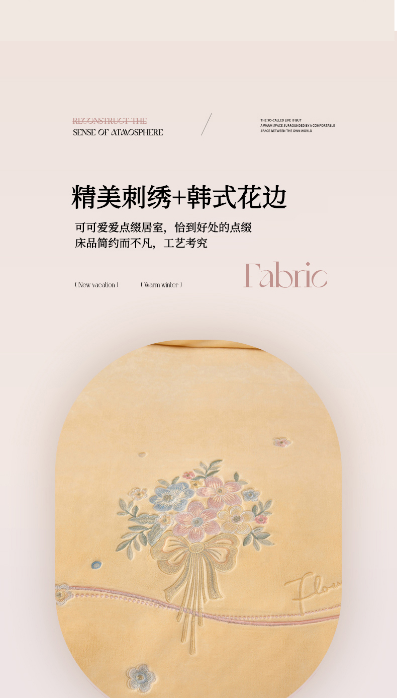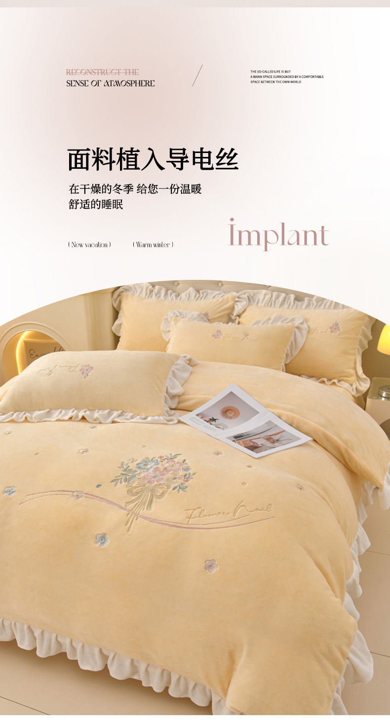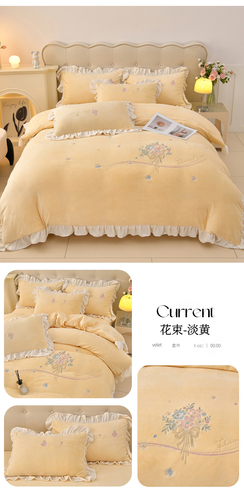 商品名称:畅畅家纺 2025新款亲肤舒适冬季刺绣花边保暖牛奶绒四件套-花束 花束-淡黄