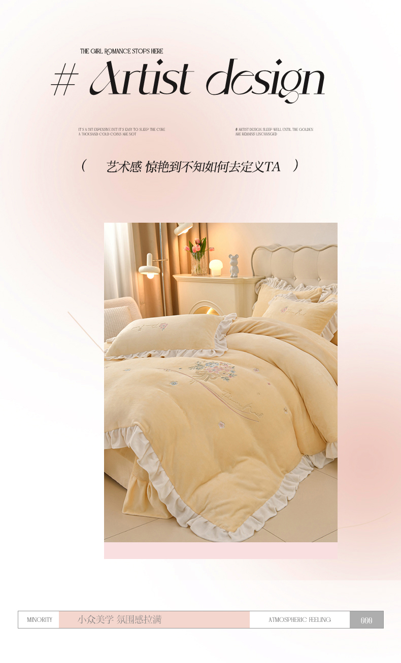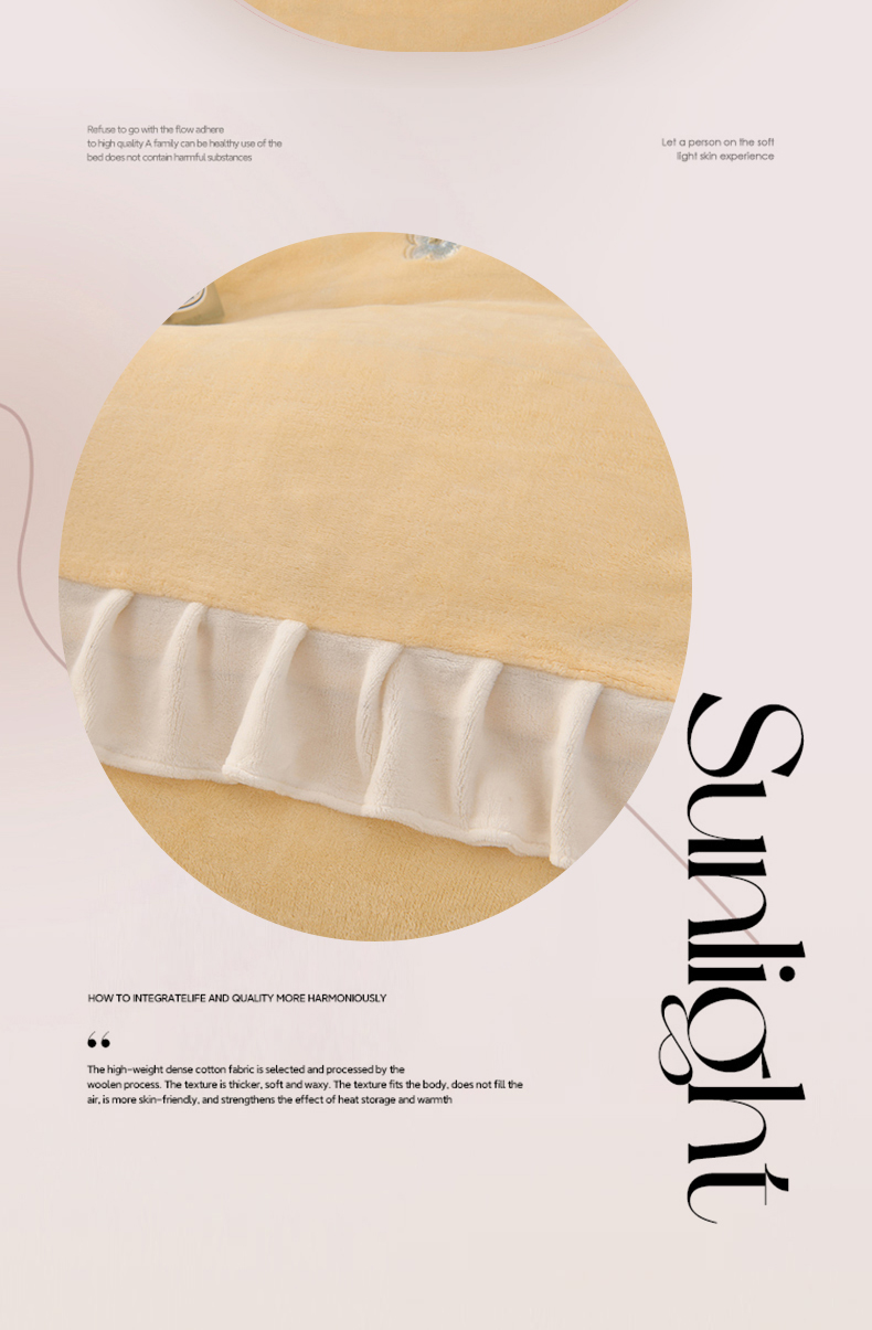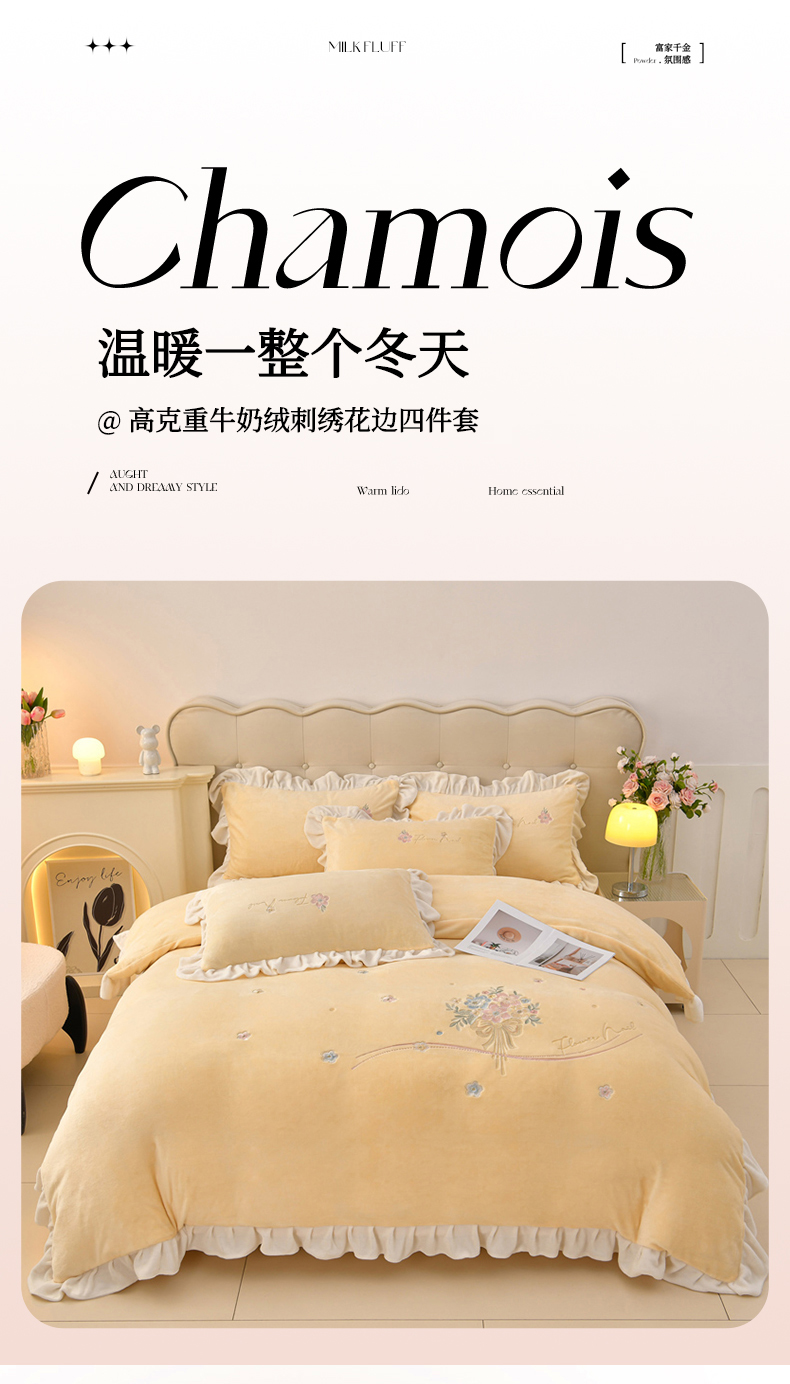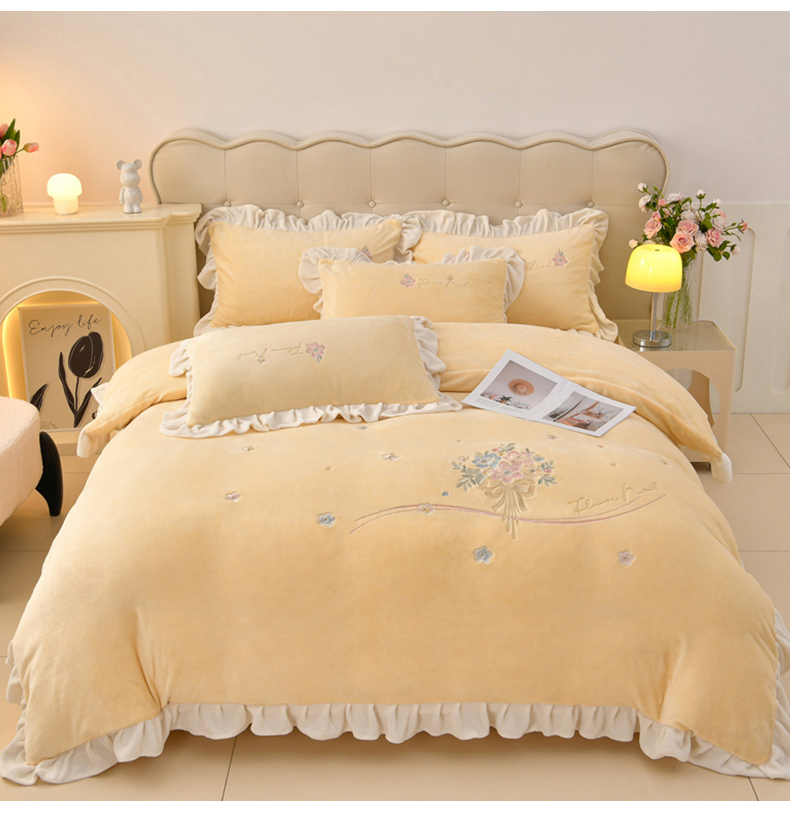 畅畅家纺 2025新款亲肤舒适冬季刺绣花边保暖牛奶绒四件套-花束 花束-淡黄