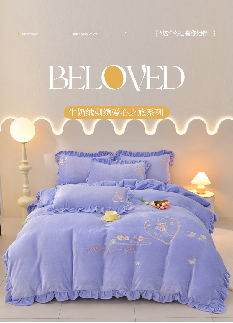商品名称:(总)畅畅家纺 2025新款亲肤舒适冬季刺绣花边保暖牛奶绒四件套-爱心之旅