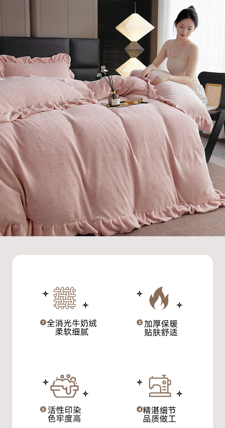 (总)找底底家纺 2025新款花边9-10斤牛奶绒床盖款四件套,花妖,梨花落,小樱桃,紫蔻