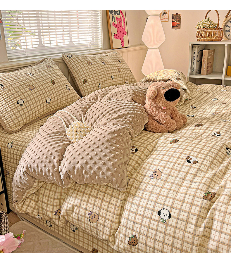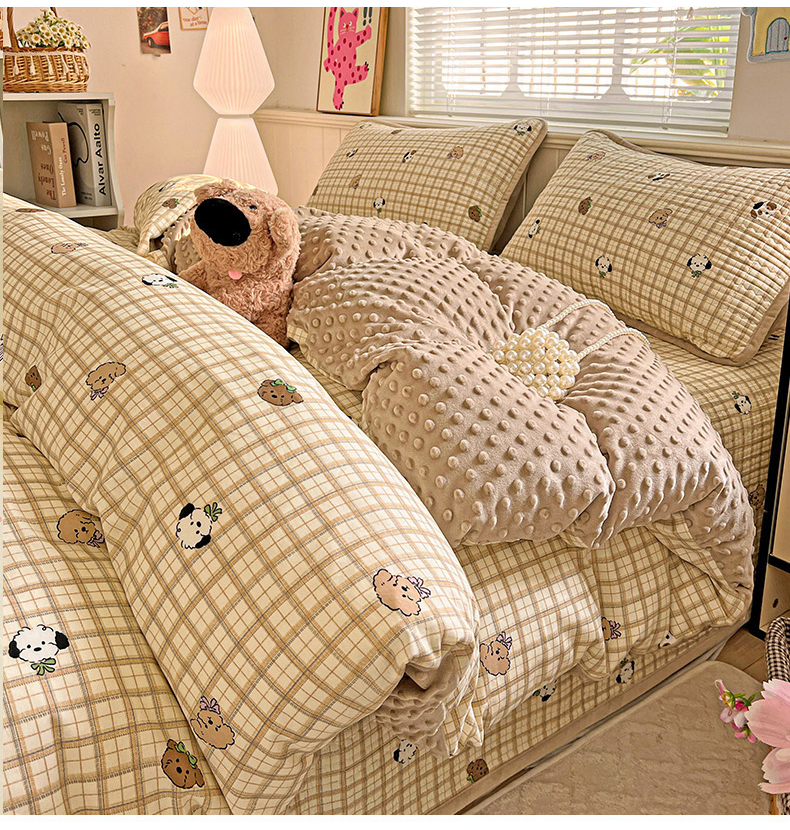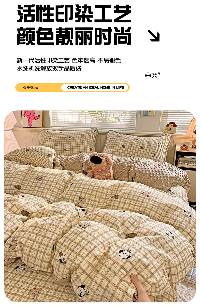 漫时光 2025新款正面纯棉反面宝宝绒印花夹棉砂洗床盖四件套 曲奇小狗