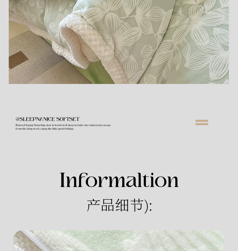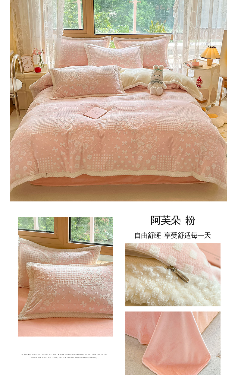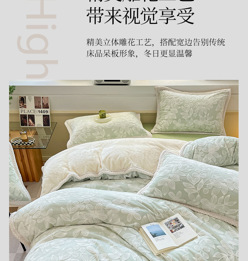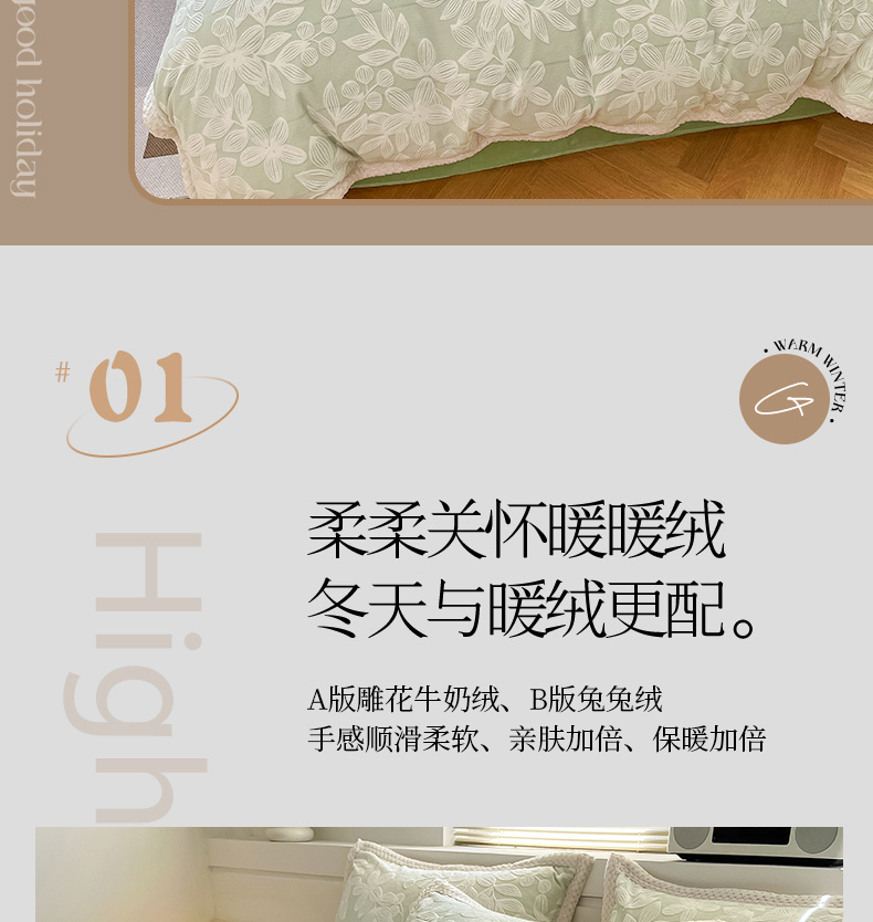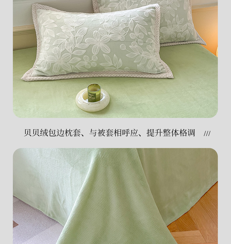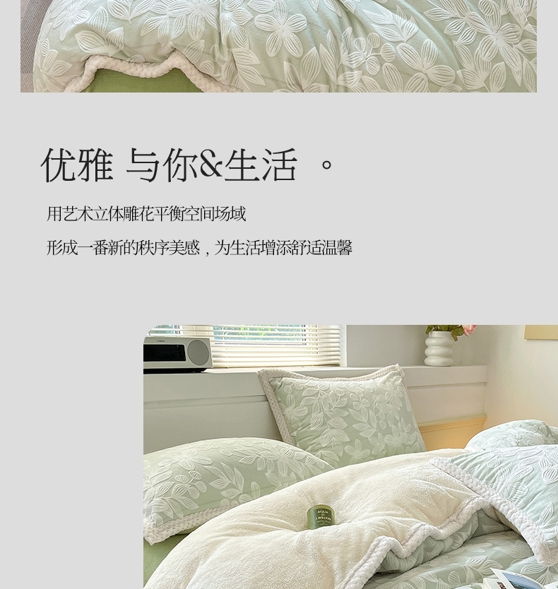 当前位置: 91家纺网 > 商品网购 > 床品套件 > 四件套 > 其它四件套 > 琪格格纺织 2025新款全消光包边立体简约清新雕花绒四件套 雕花包边-爱在秋冬 浅绿