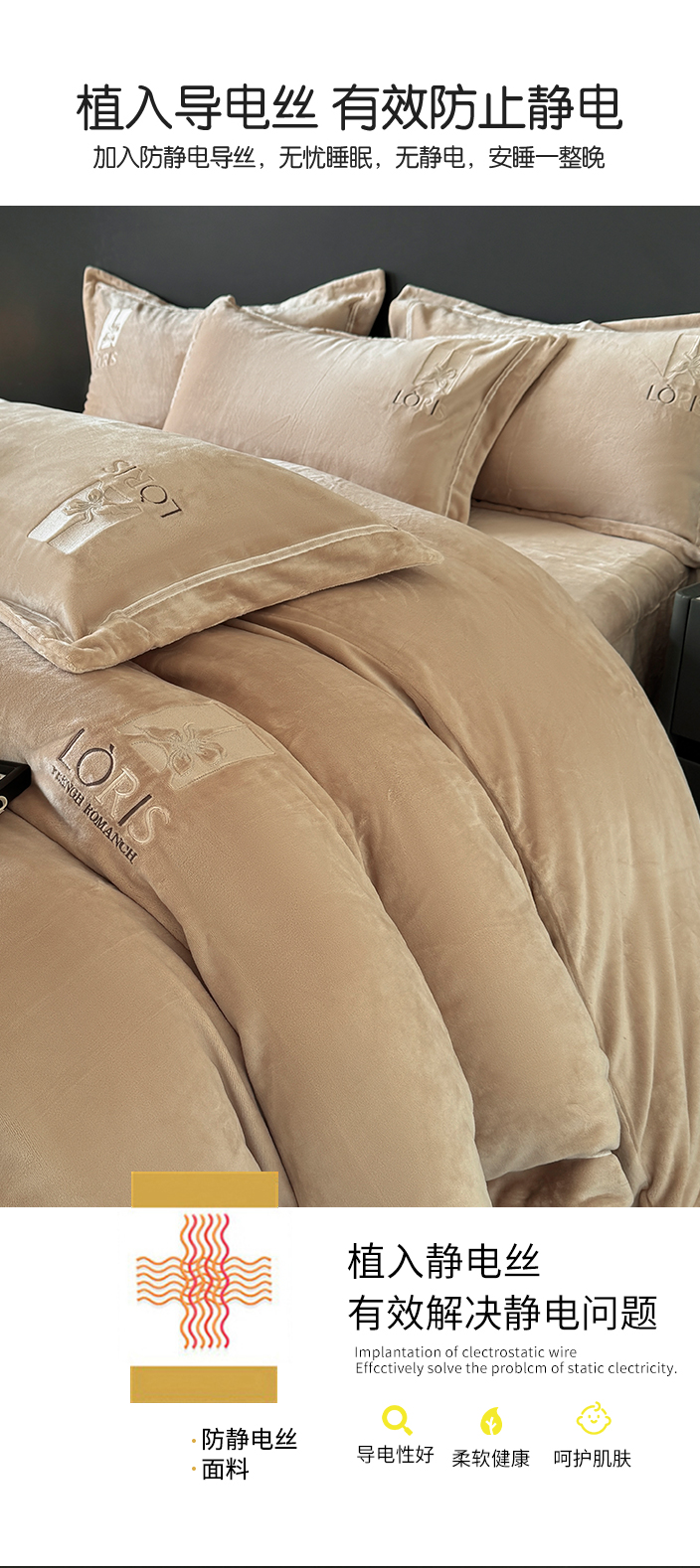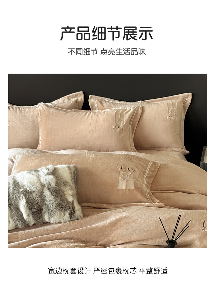 商品名称:宅家居 2025新款秋冬轻奢小香风刺绣全消光A类高克重牛奶绒四件套-艾菲尔 艾菲尔-卡其