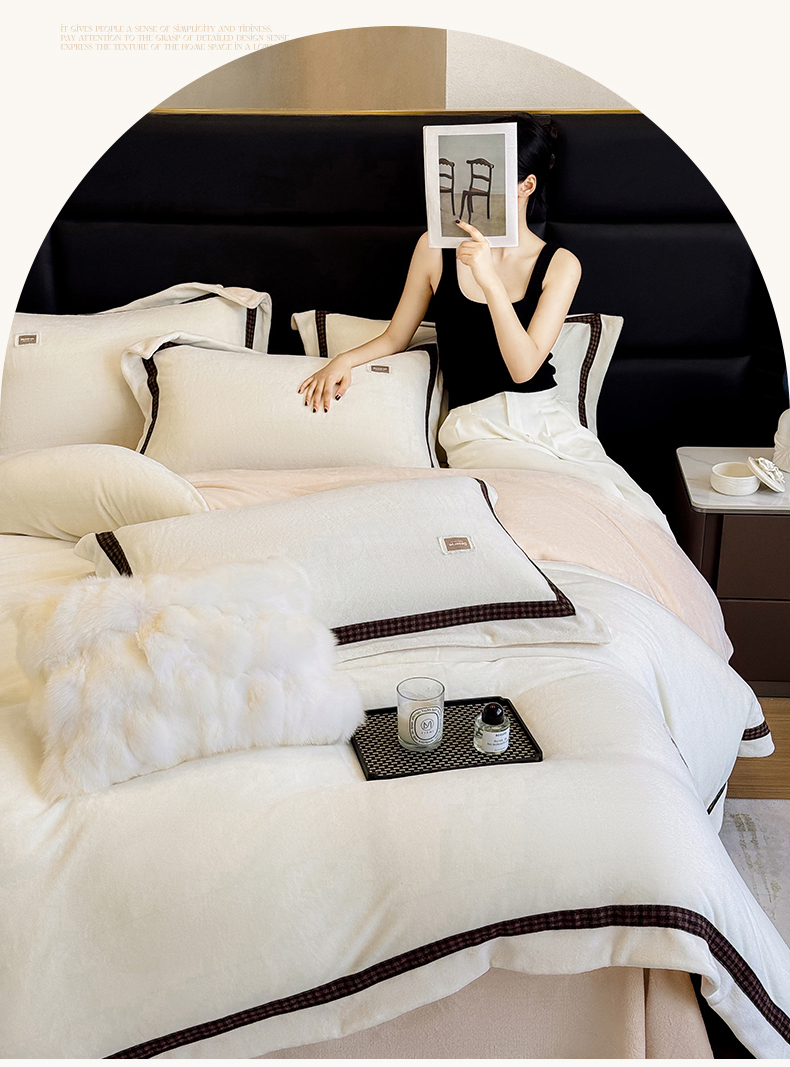商品名称:(总)金喜 2025新款230克全消光牛奶四件套雕花绒四件套宽边圆角织带工艺款四件套-卡夫