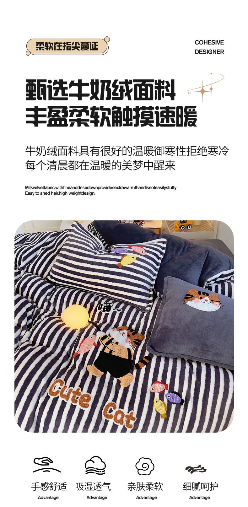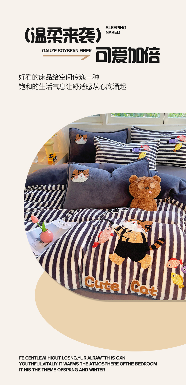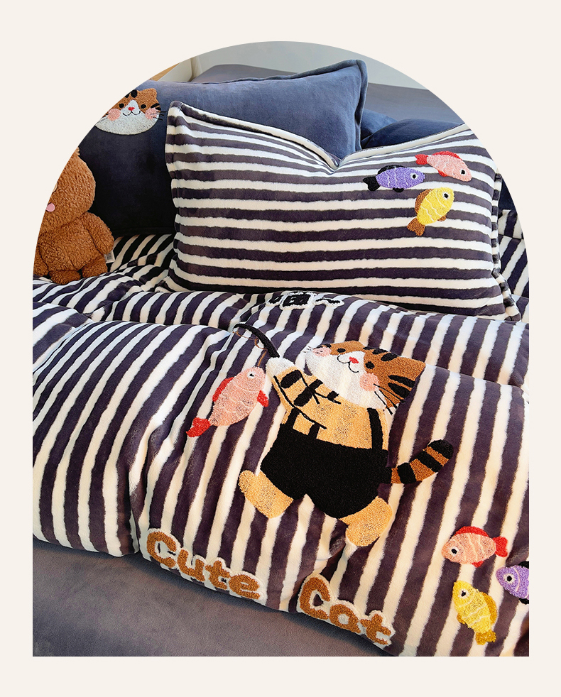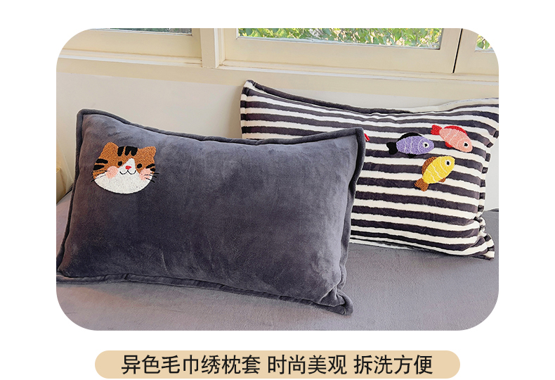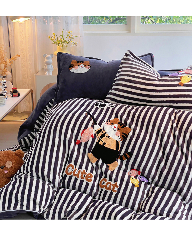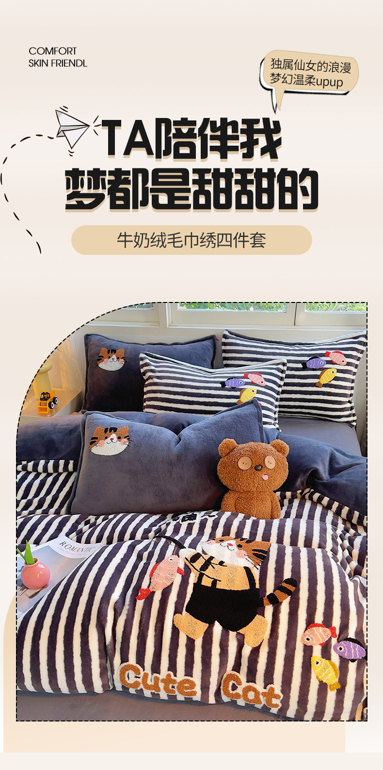 炫拼家纺 2025新款高克重牛奶绒毛巾绣卡通四件套-可孚系列 可孚-钓鱼的猫