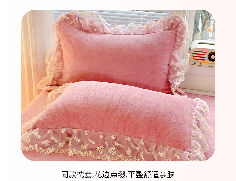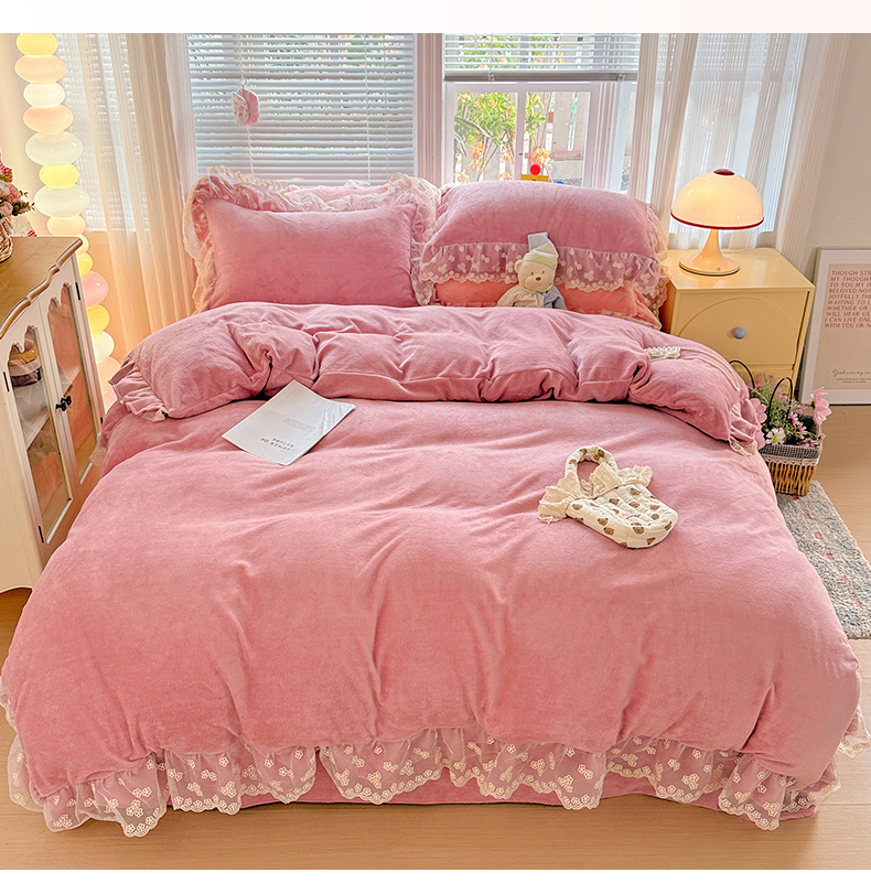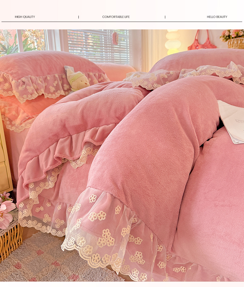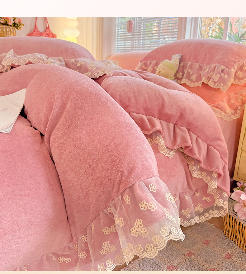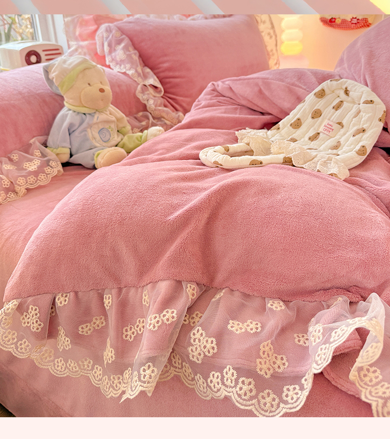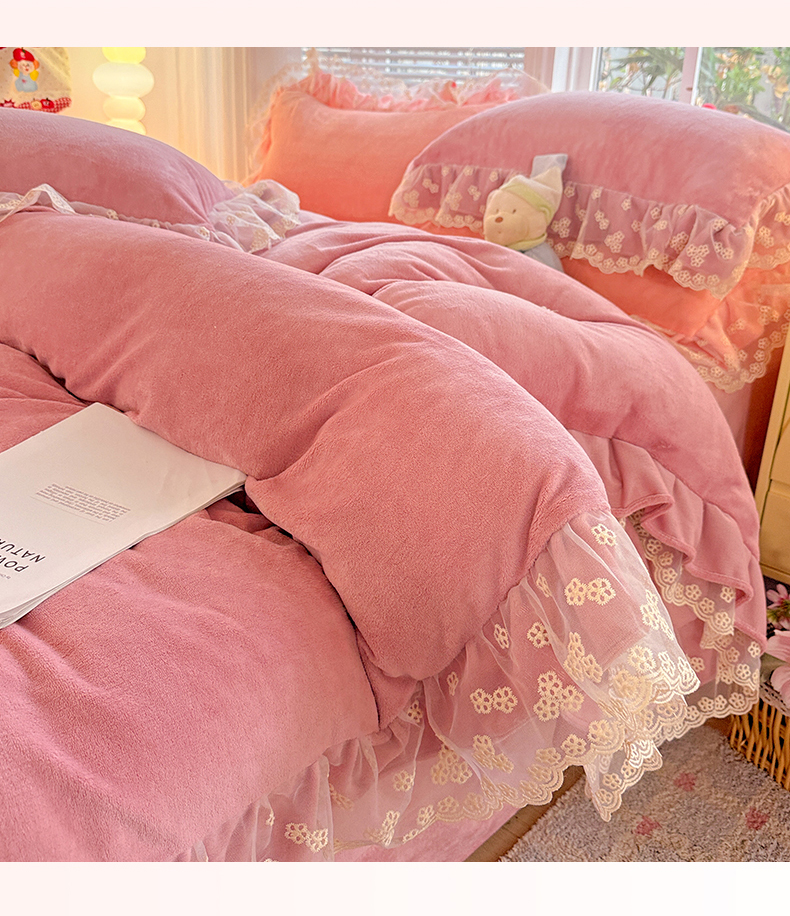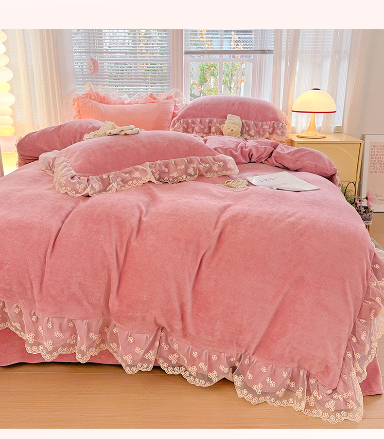 商品名称:鑫利来家纺 2025新款法式蕾丝花边牛奶绒四件套韩版花边加厚牛奶绒四件套 倾城-豆沙