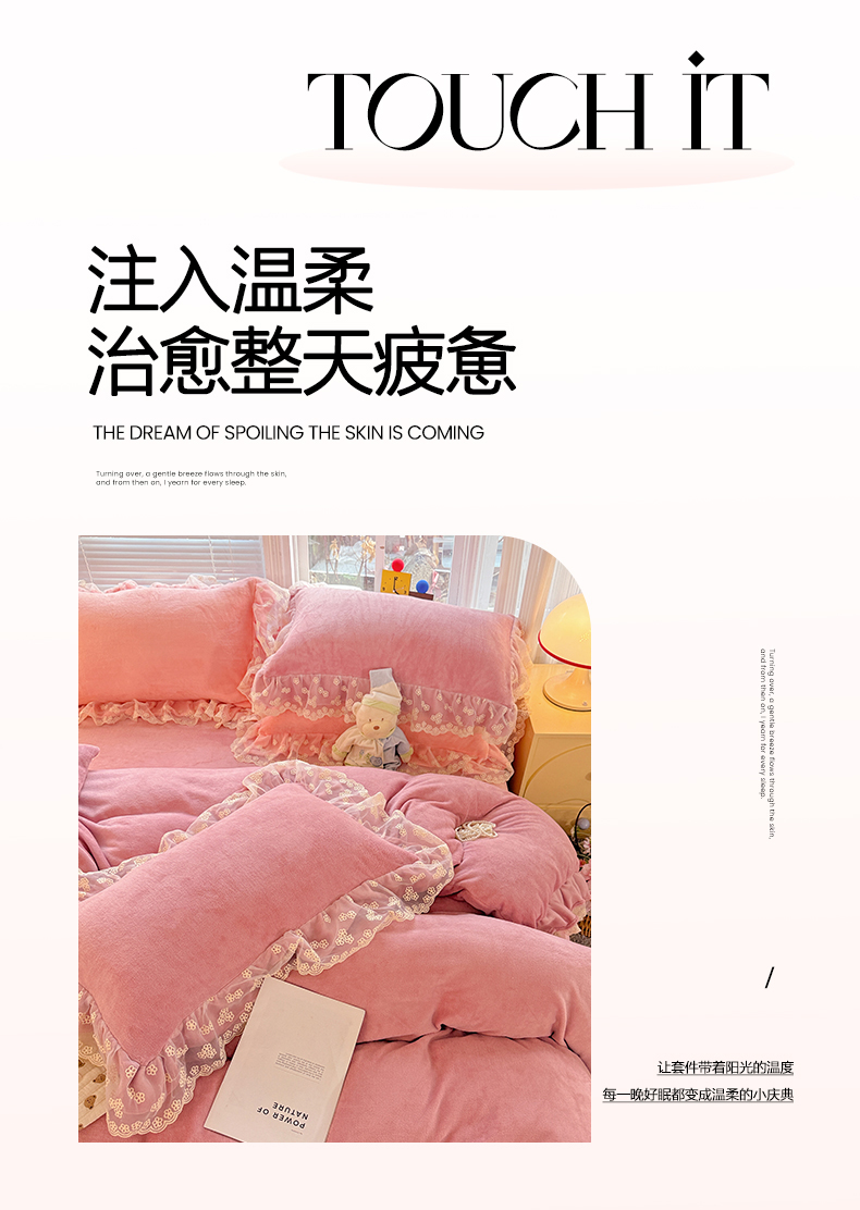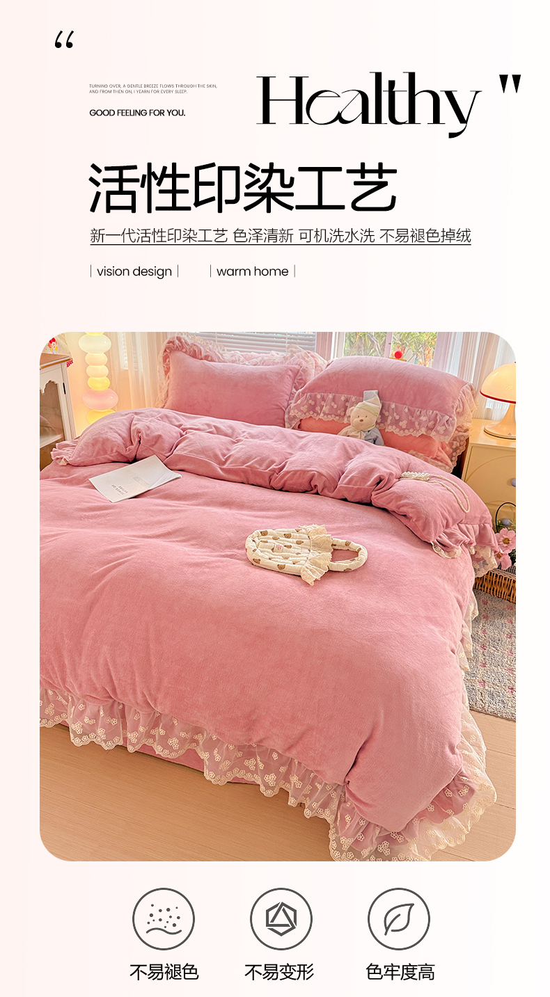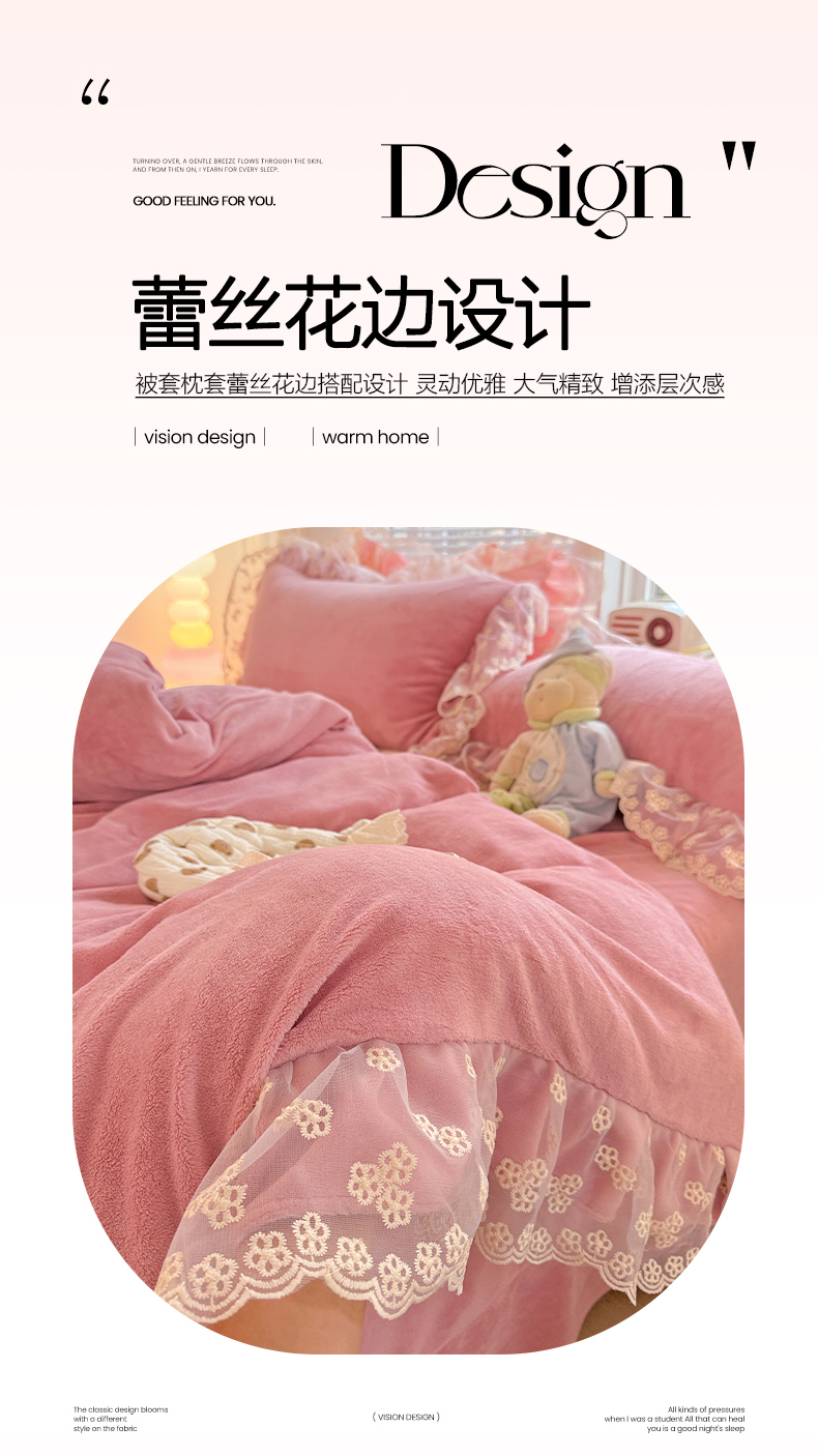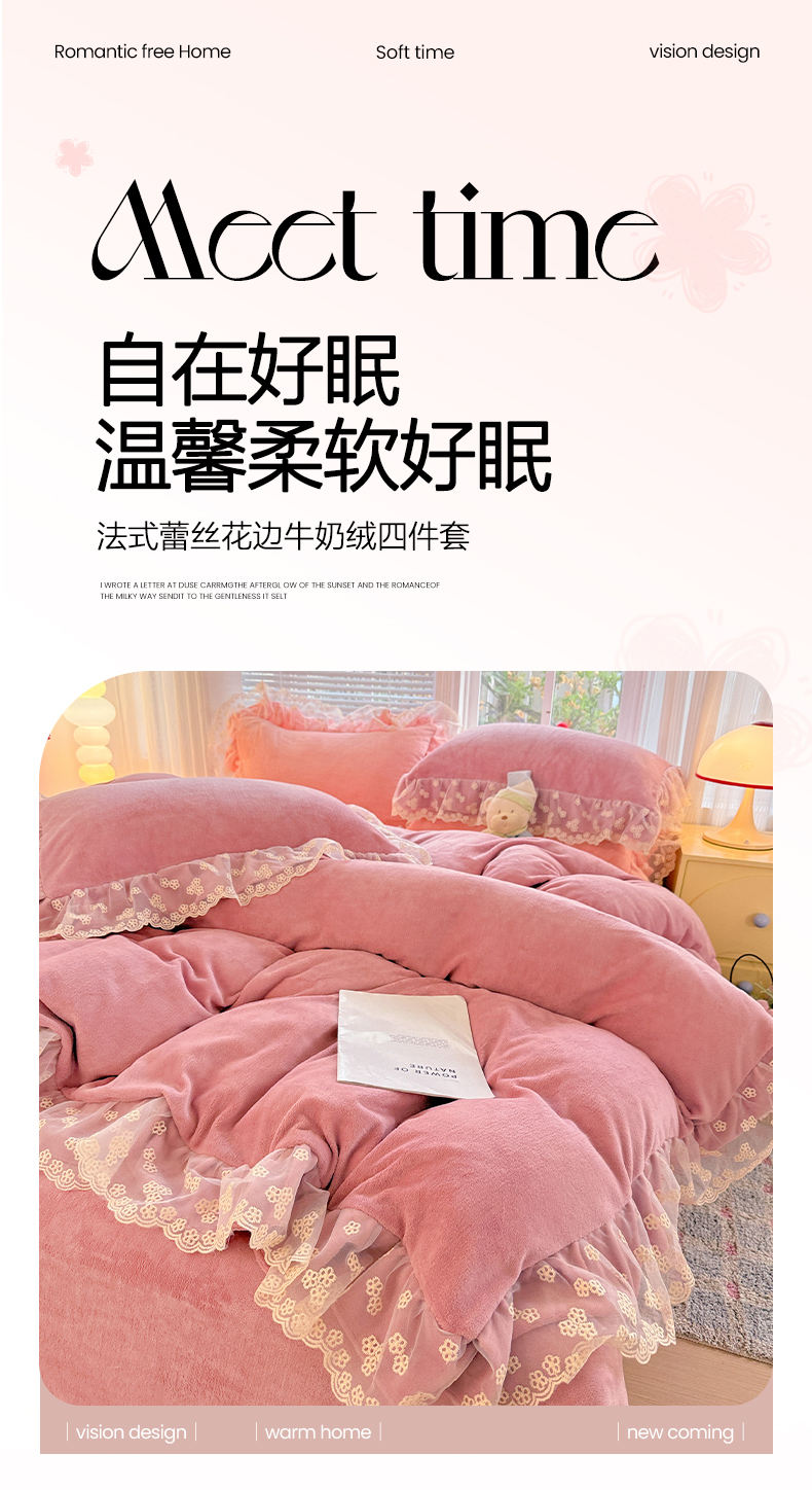 商品名称:鑫利来家纺 2025新款法式蕾丝花边牛奶绒四件套韩版花边加厚牛奶绒四件套 倾城-豆沙