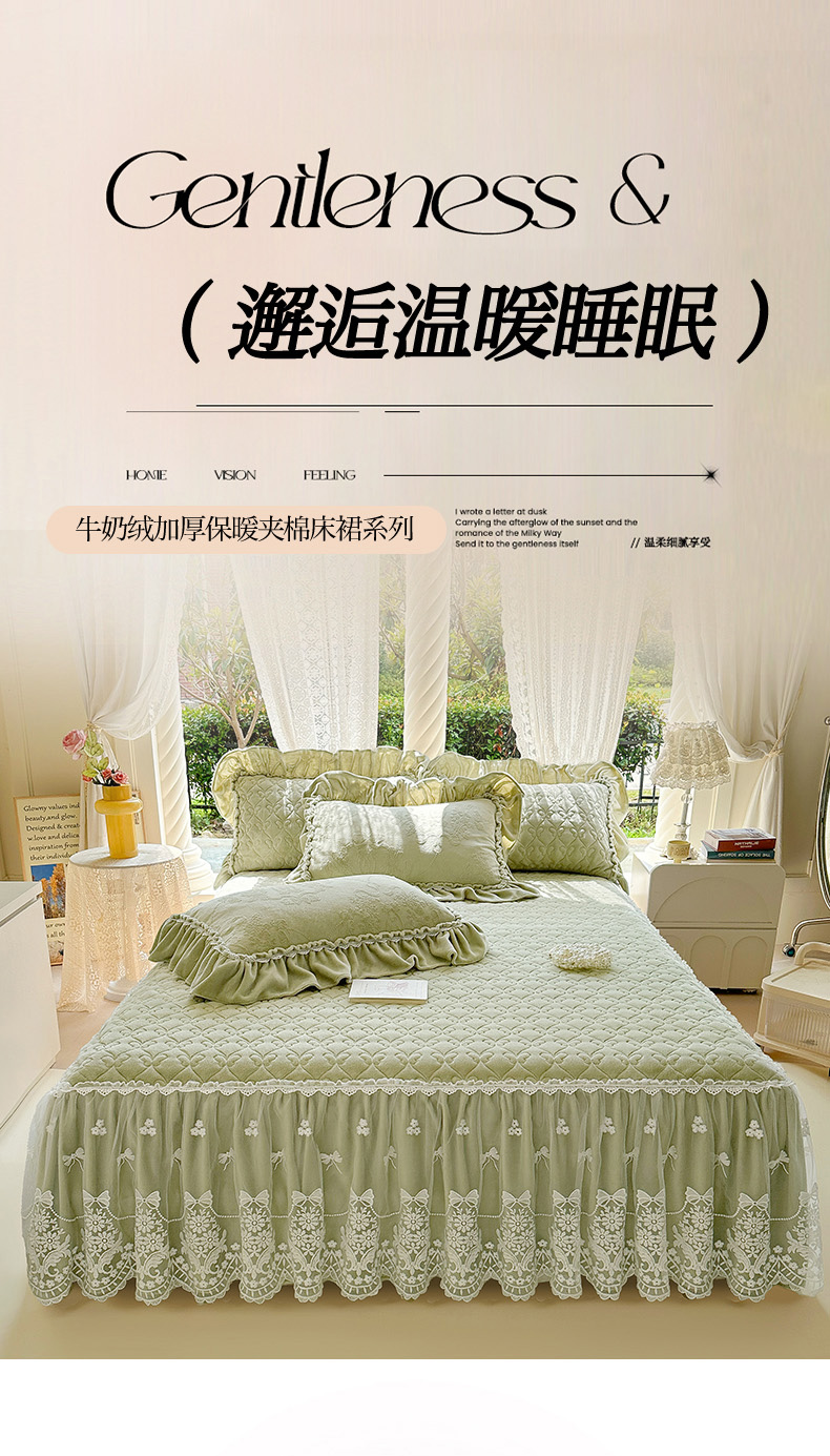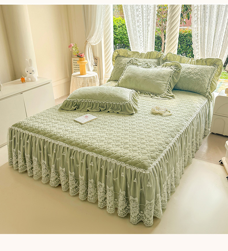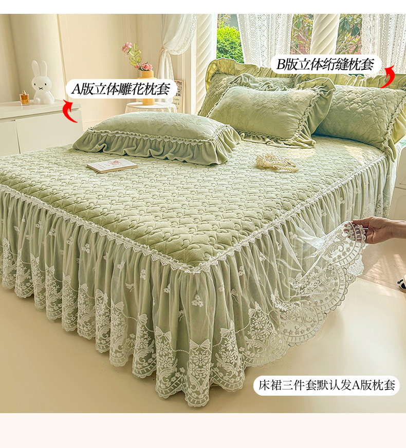 罗艺轩 【控价】2025新款立体雕花牛奶绒加厚保暖床裙款三件套-安琪儿 安琪儿-绿
