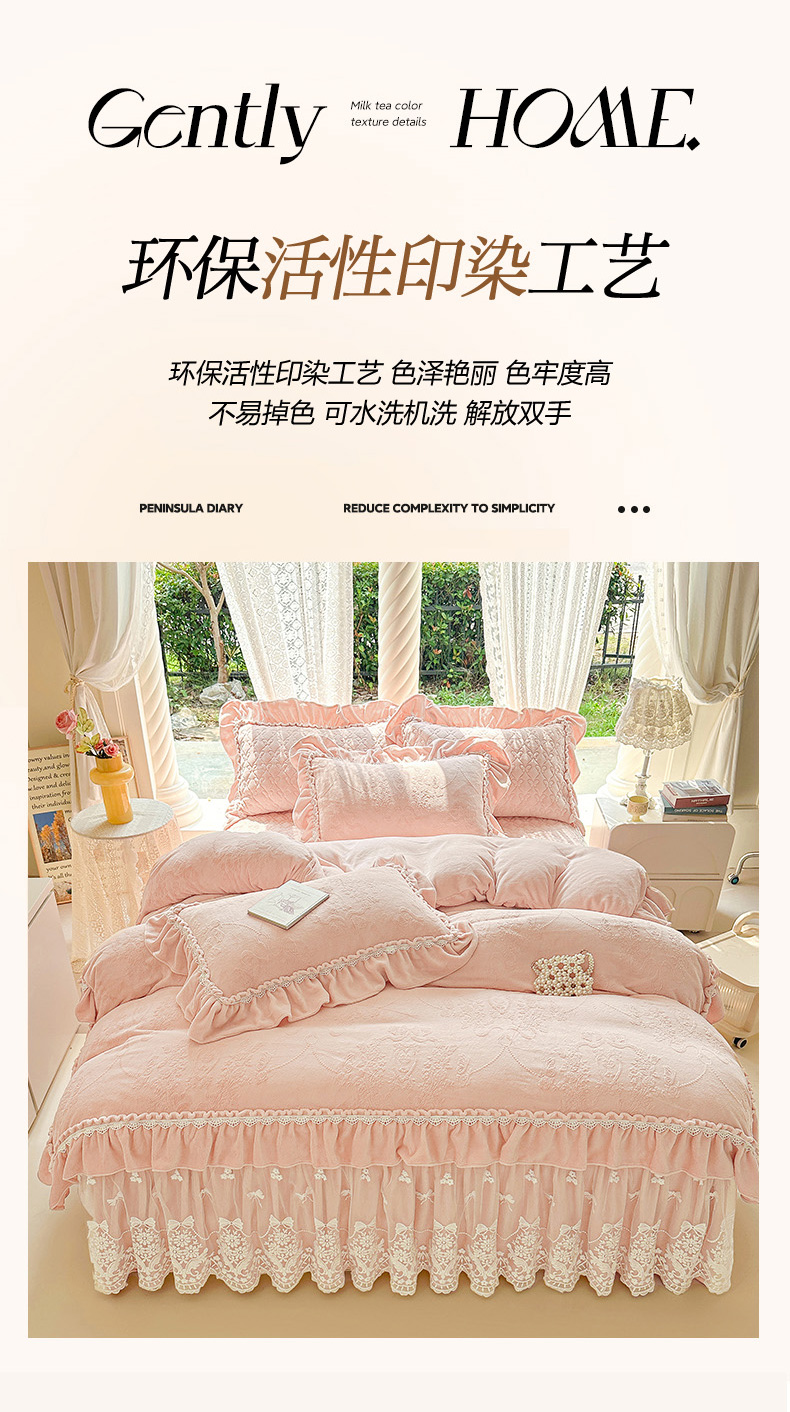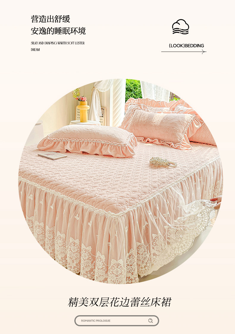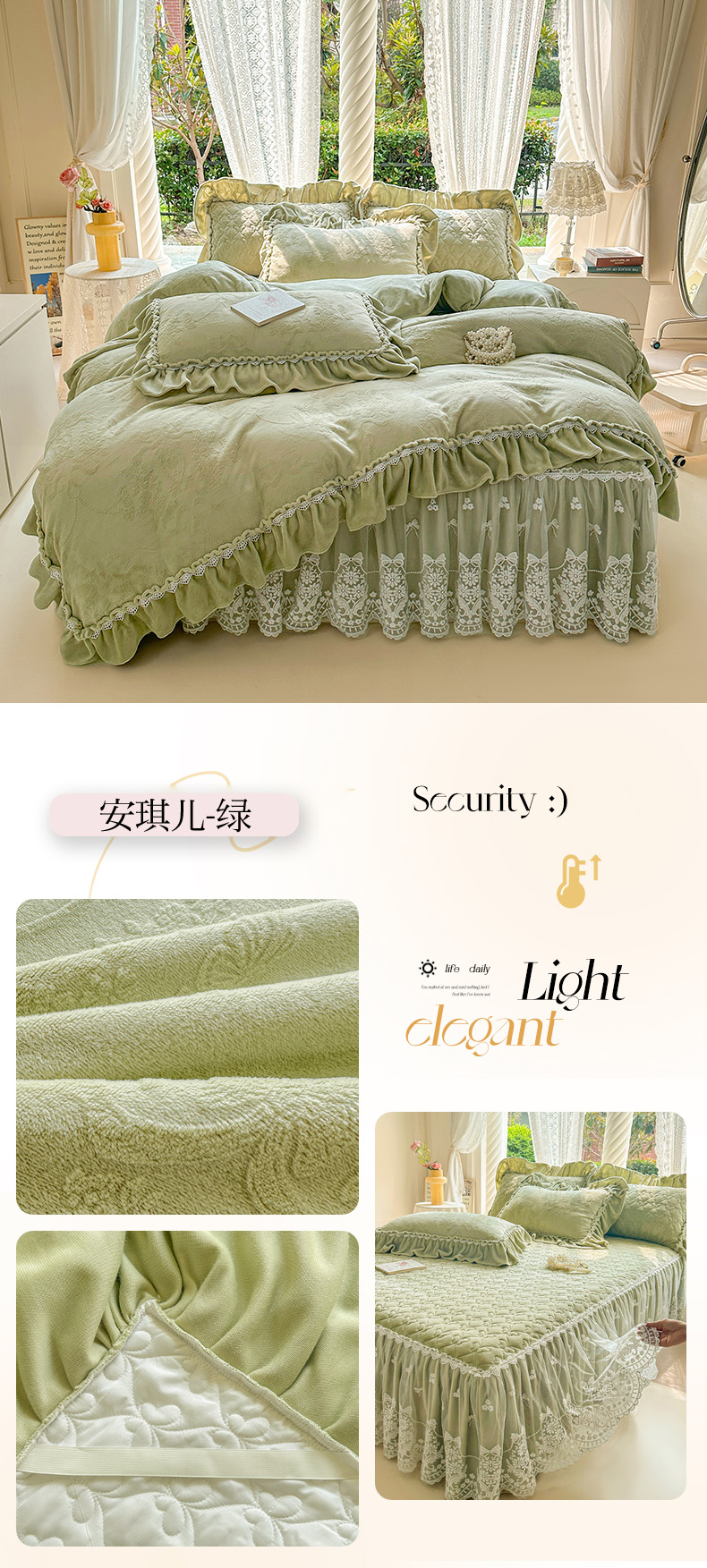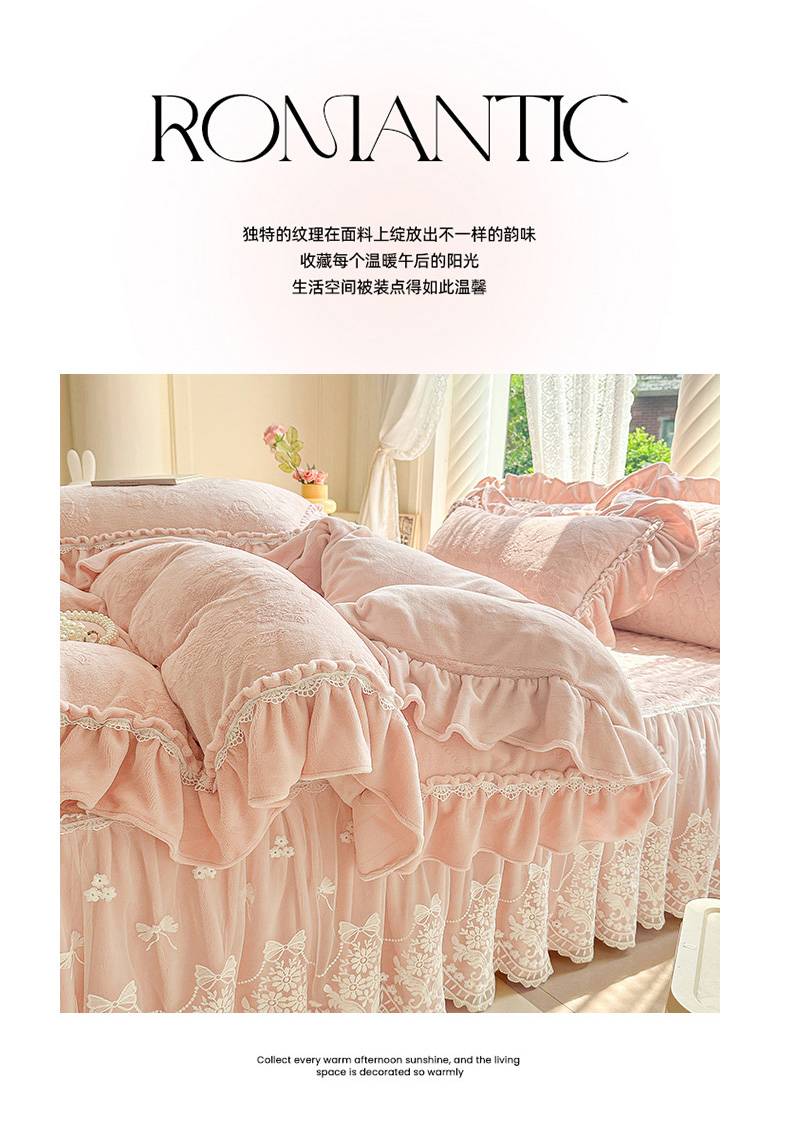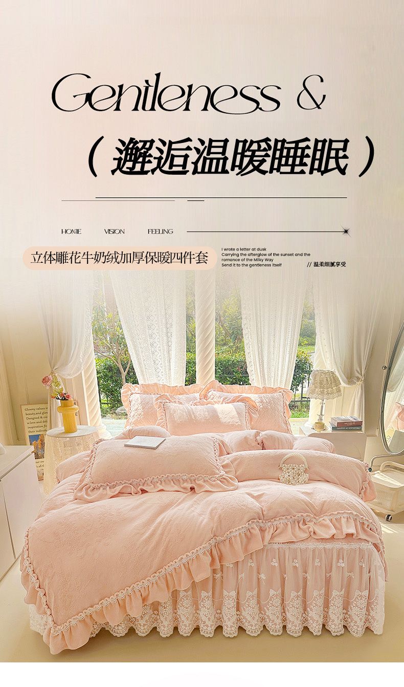 当前位置: 91家纺网 > 商品网购 > 床品套件 > 四件套 > 其它四件套 > 罗艺轩 【控价】2025新款立体雕花牛奶绒加厚保暖床裙款四件套-安琪儿 安琪儿-玉