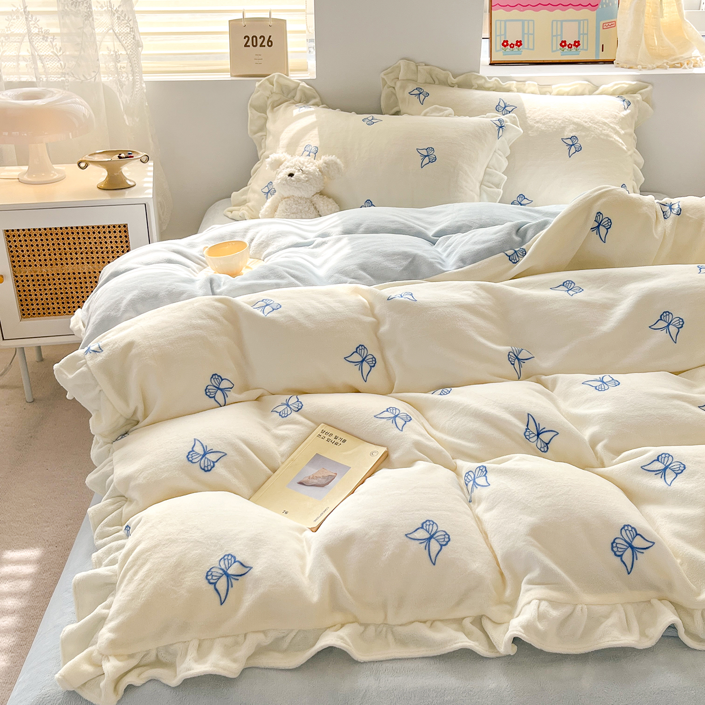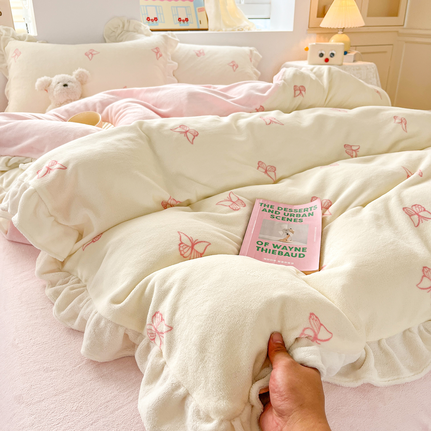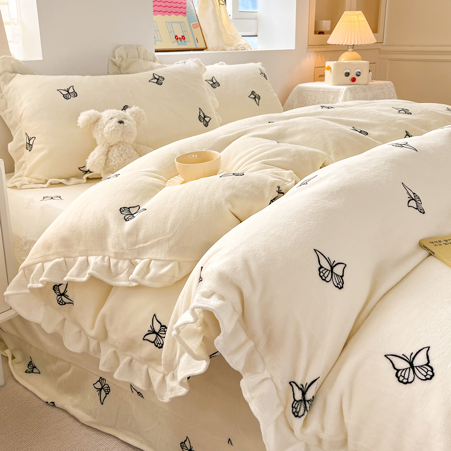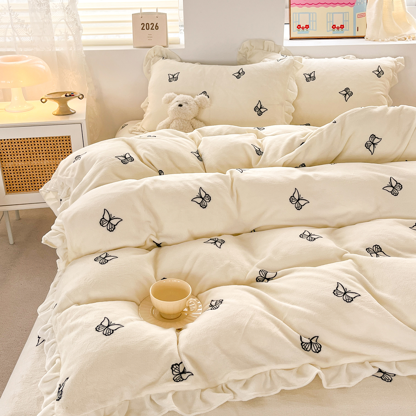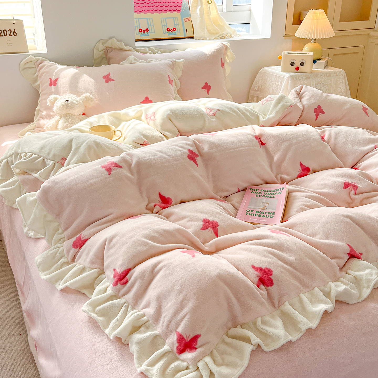 当前位置: 91家纺网 > 商品网购 > 床品套件 > 四件套 > 牛奶绒四件套 > 麦朵家居 2025新款10斤重床盖款花边牛奶绒四件套雕花绒法莱绒四件套兔兔绒四件套床笠三件套-梦蝶 梦蝶白粉