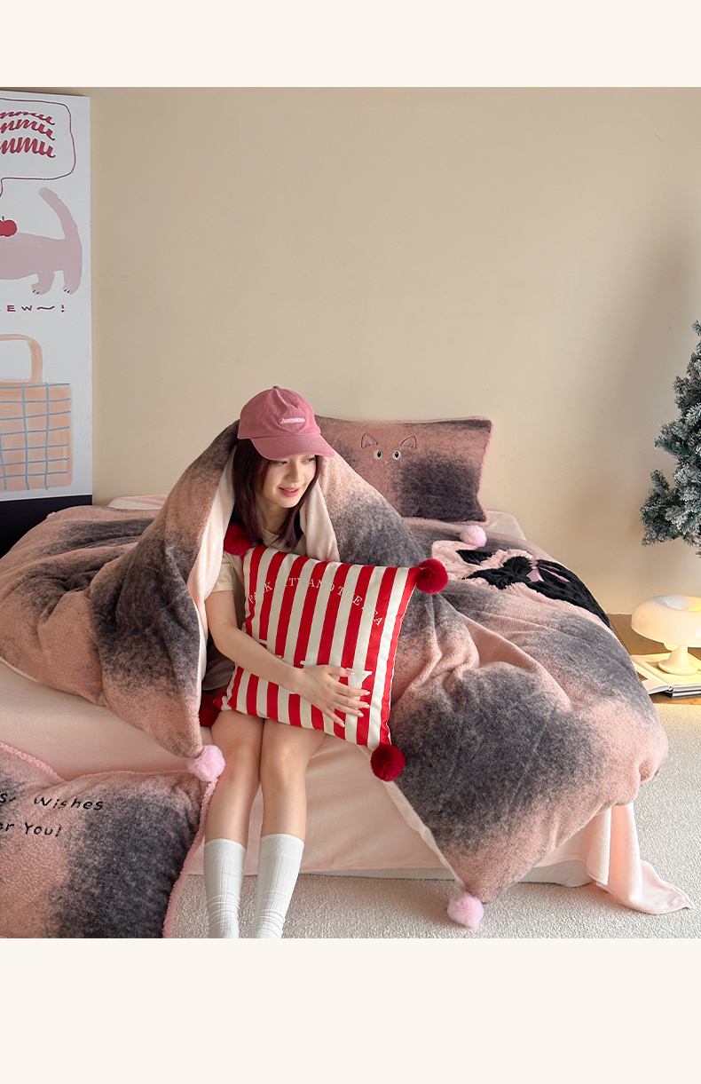 宇航家纺 2025新款仿羊毛仿羊绒牛奶绒复古风美拉德立体贴布绣花四件套 呆萌猫咪