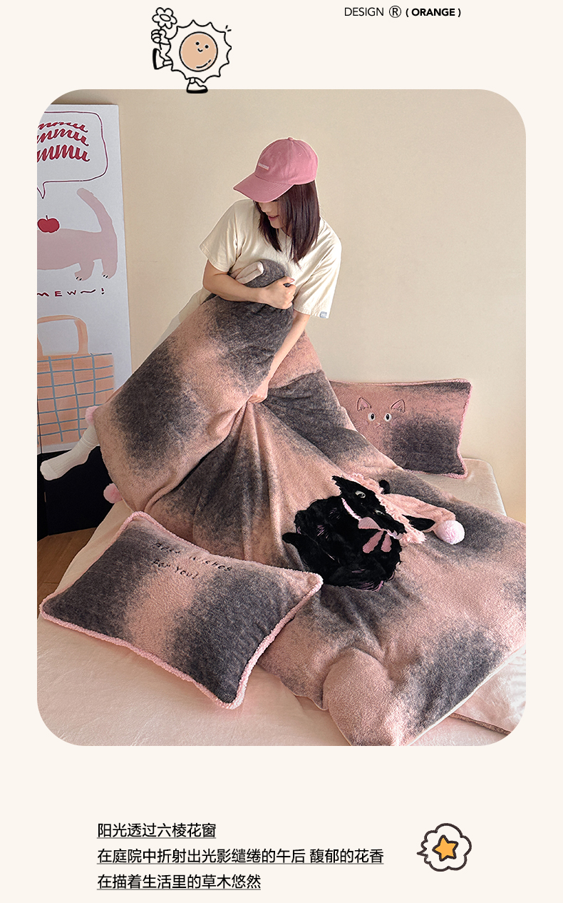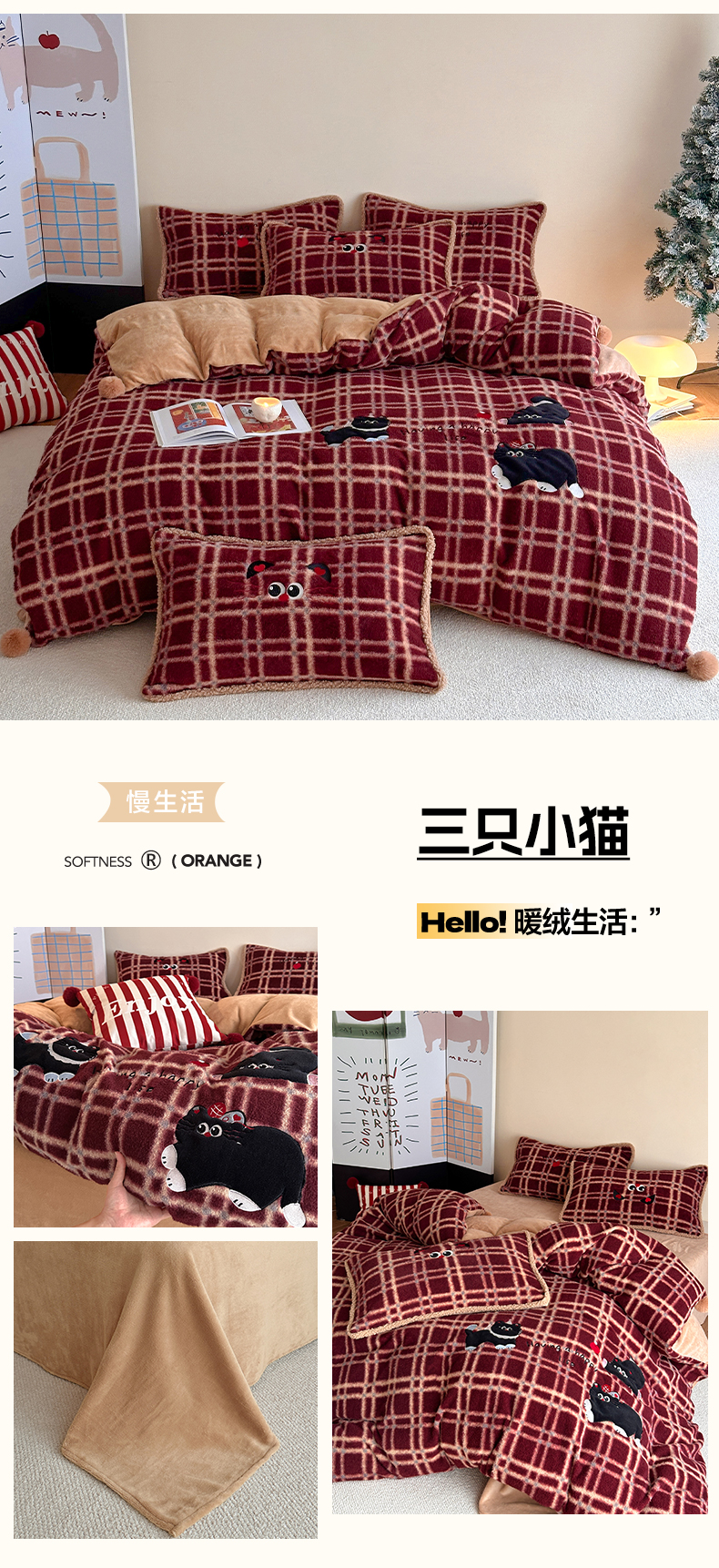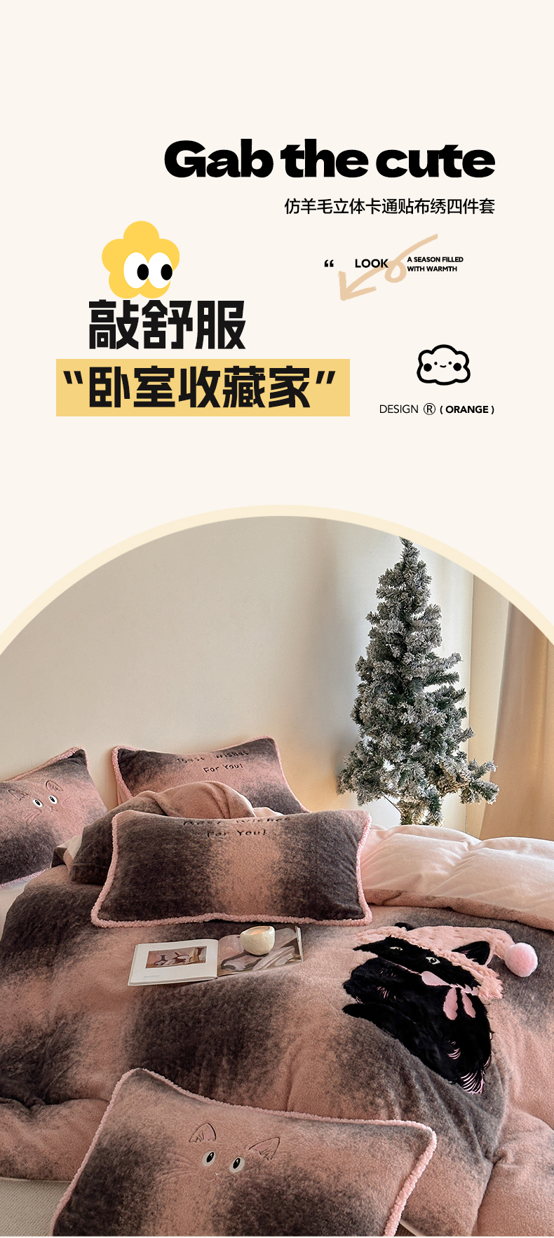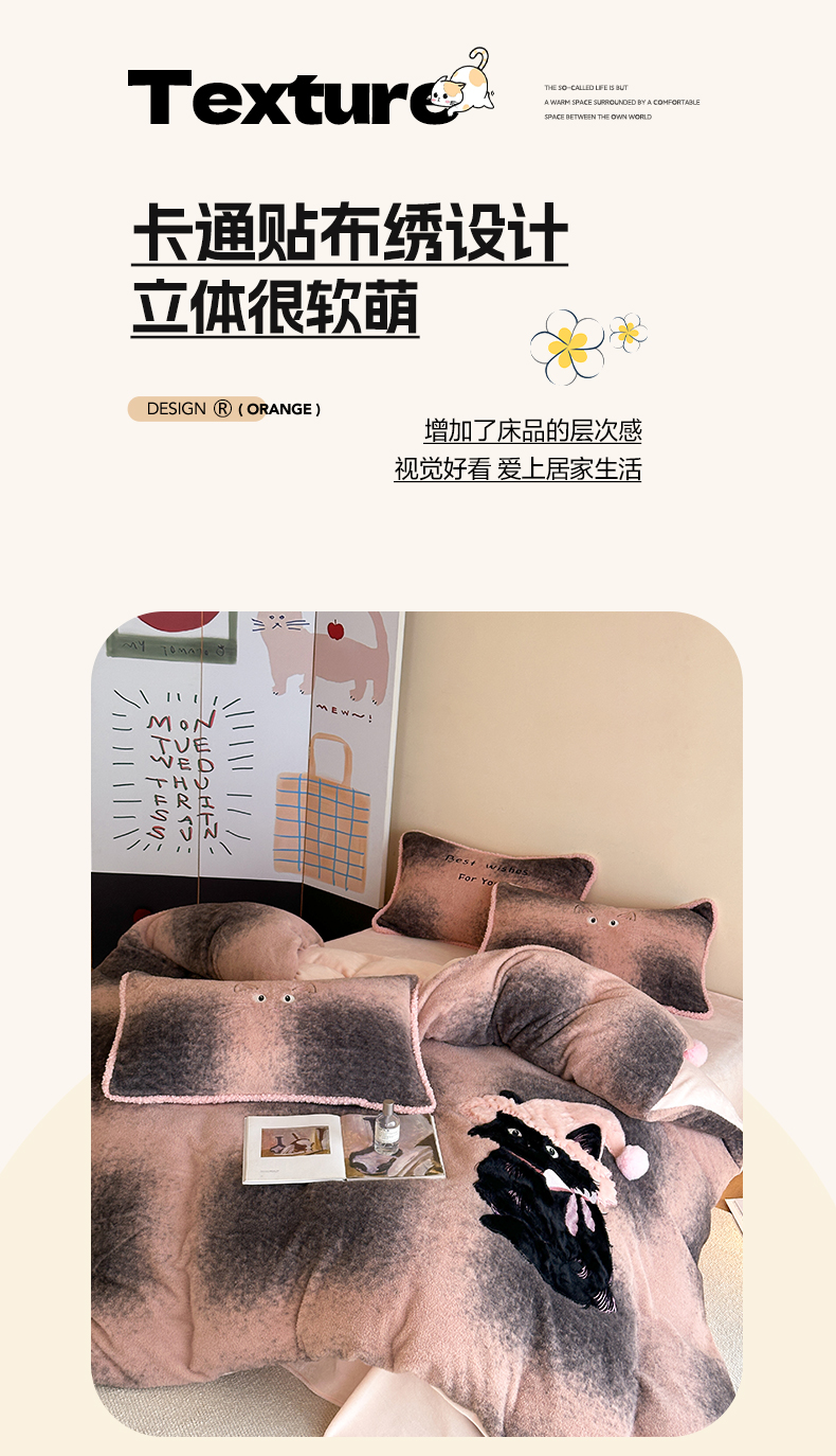 商品名称:宇航家纺 2025新款仿羊毛仿羊绒牛奶绒复古风美拉德立体贴布绣花四件套 呆萌猫咪