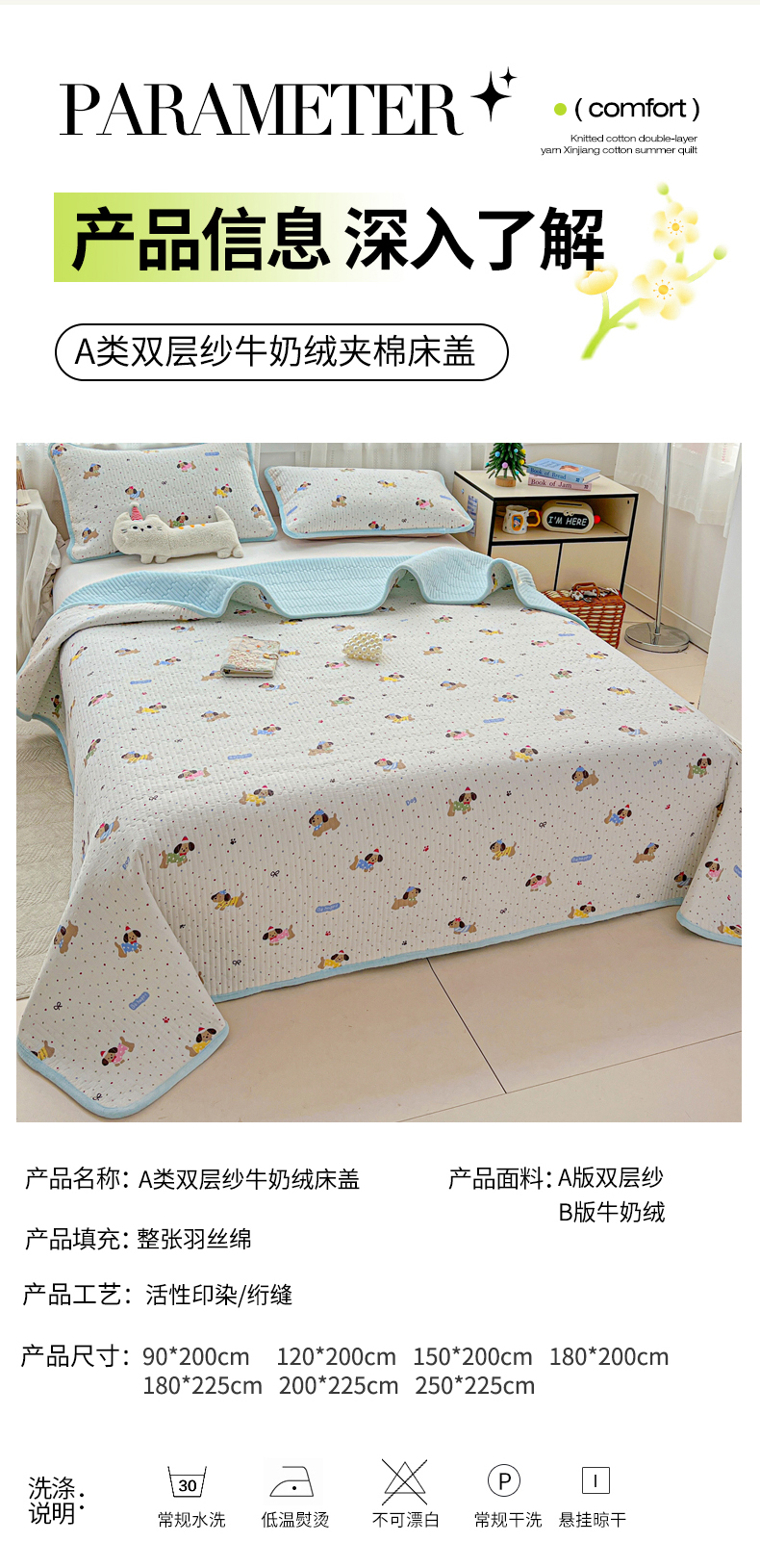 • 91家纺网 家纺一手货源 找家纺 恒尚居 2025新款双层纱牛奶绒床盖双面两用夹棉床单床垫-秋冬款 四季通用 波点狗狗【A双层纱-B牛奶绒】