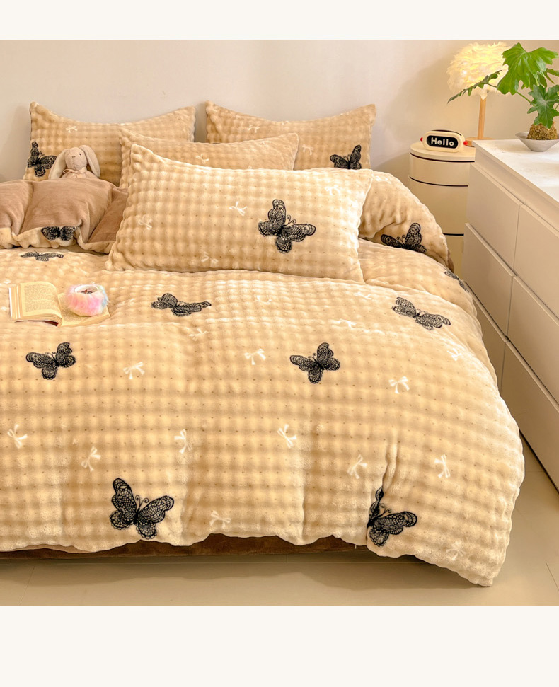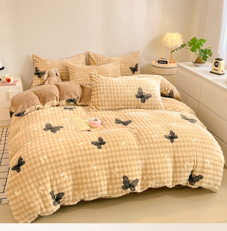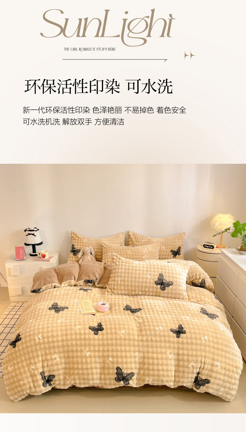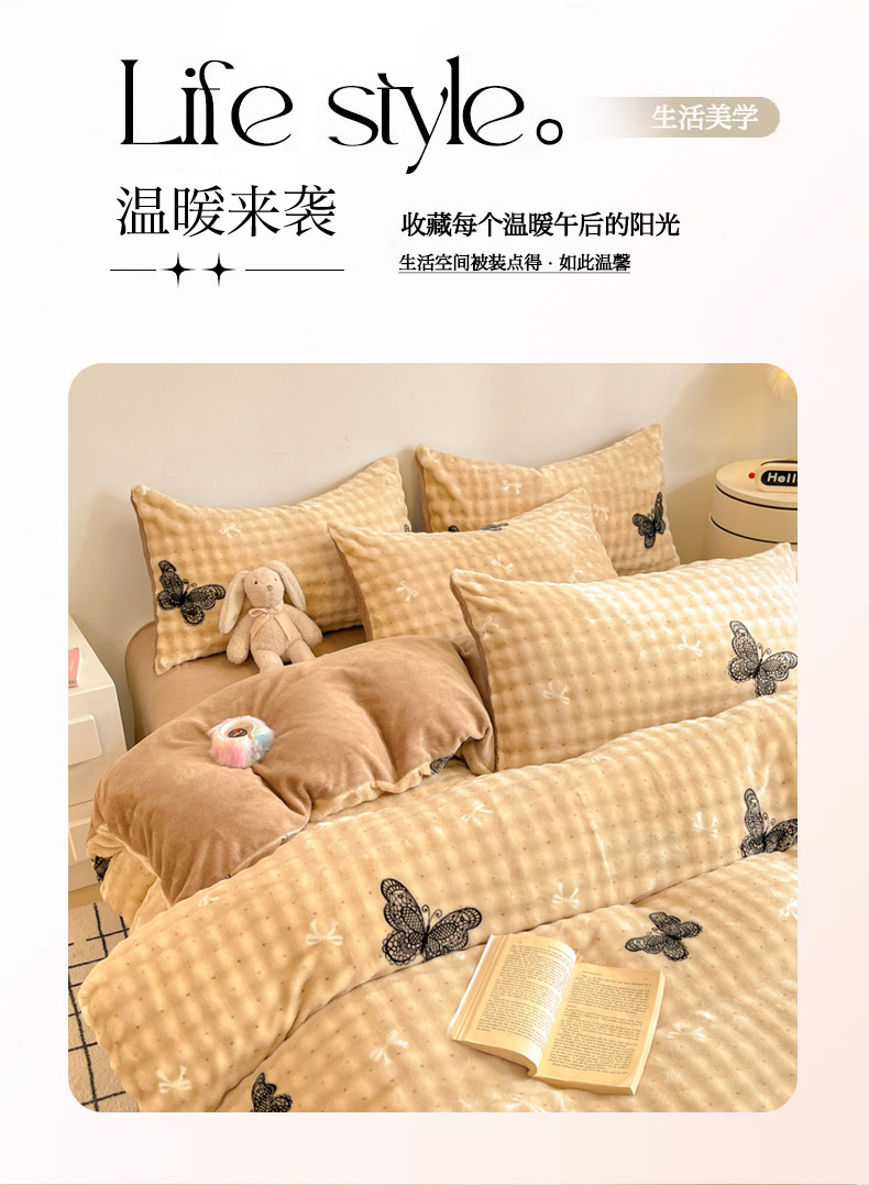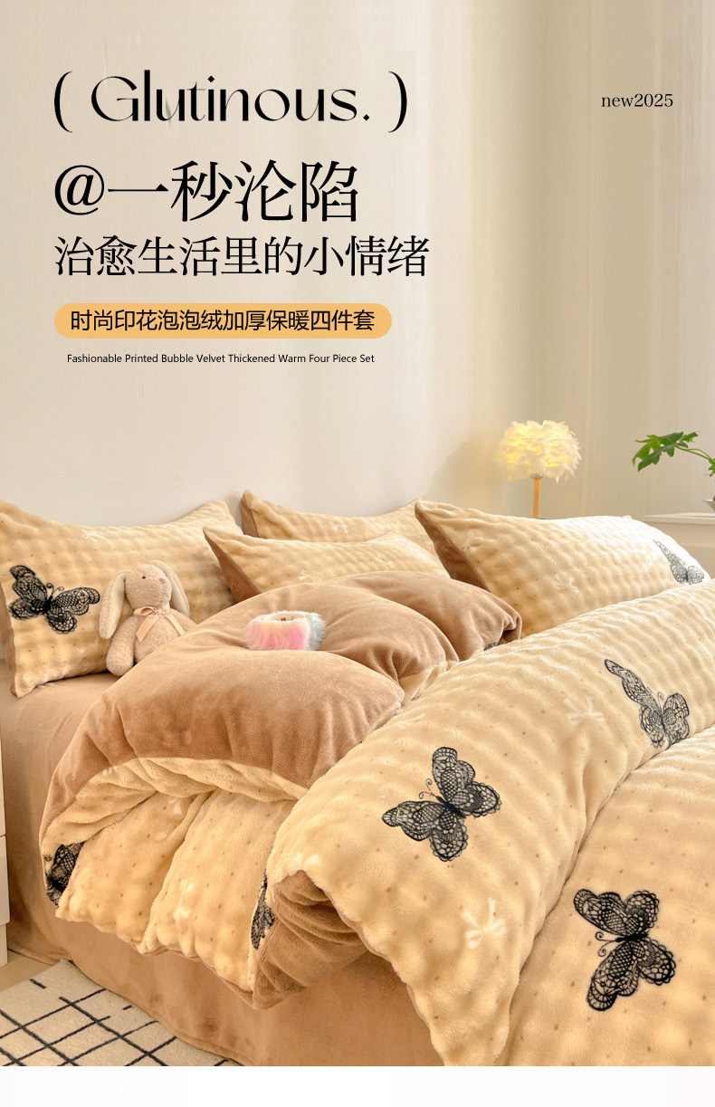 柒月家居 2025新款时尚印花泡泡绒加厚保暖四件套套件 棕色蝴蝶