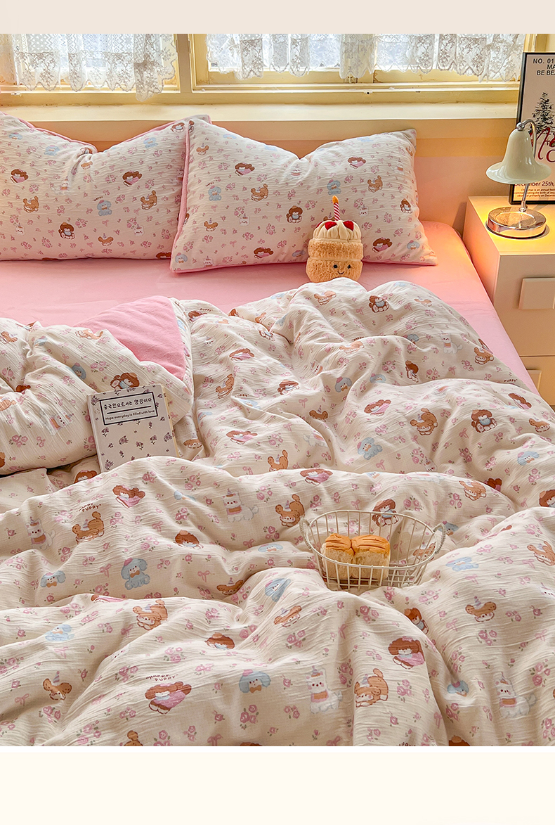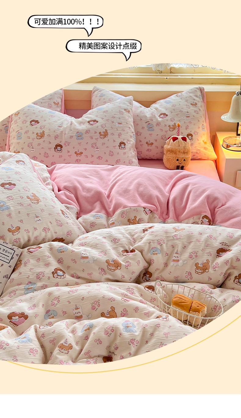(总)玉海棠家纺 2025新款云感提花双层纱印花系列四件套-场景一,布丁狗,格格西高地,蓝色爱心,米奇,诺言兔兔,晴天,芝士奶酪,春风里