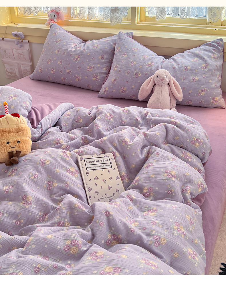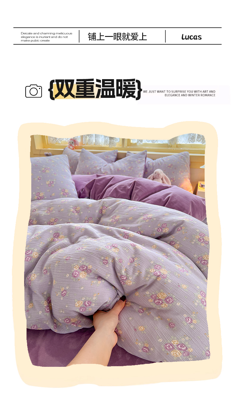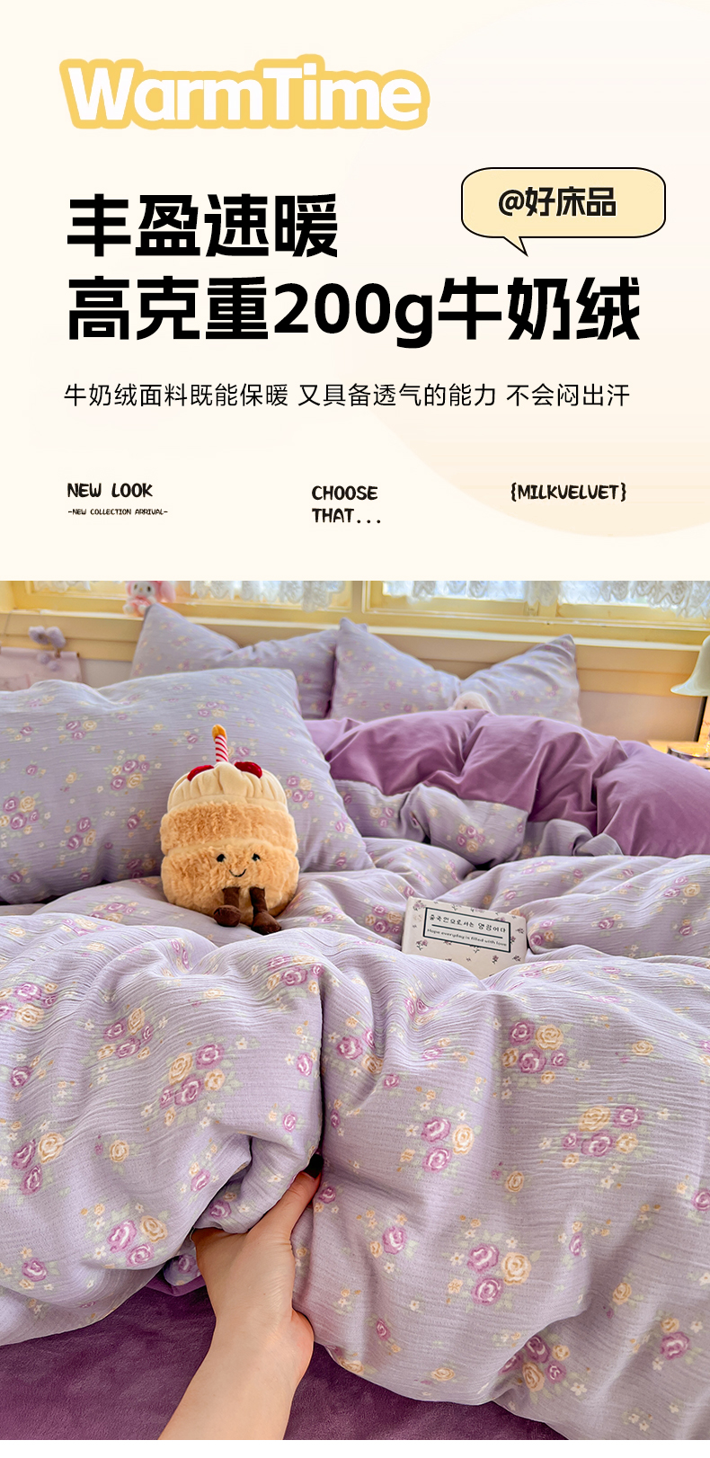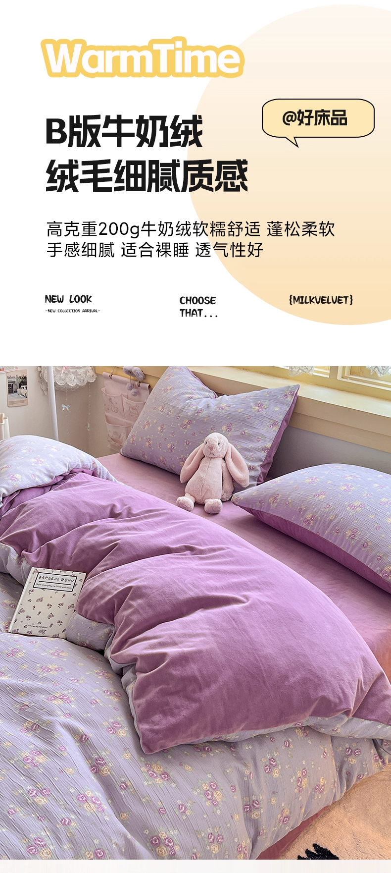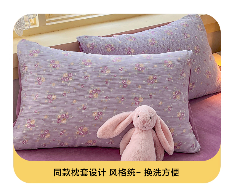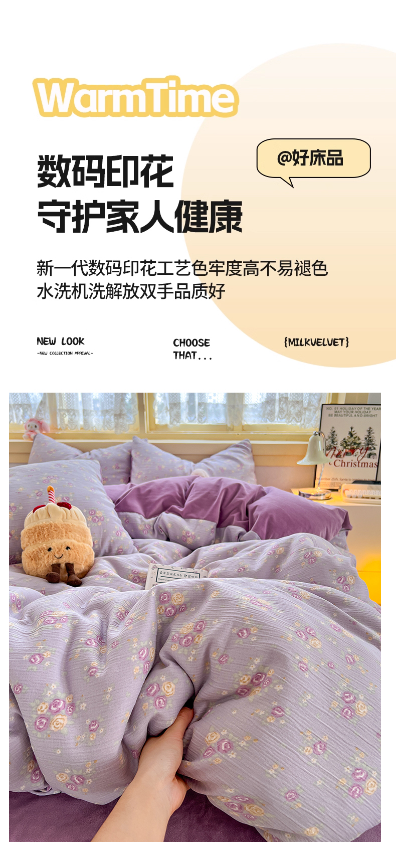 商品名称:玉海棠家纺 2025新款A版三层纱B版牛奶绒四件套系列 紫萱