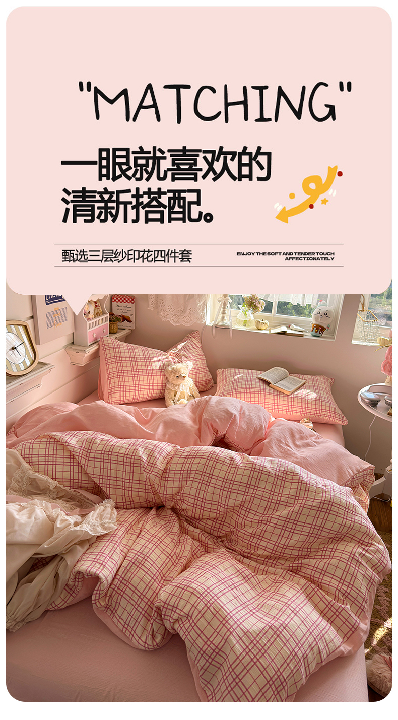 当前位置: 91家纺网 > 商品网购 > 床品套件 > 四件套 > 其它四件套 > 玉海棠家纺 2025新款甄选三层纱印花四件套 梅森粉