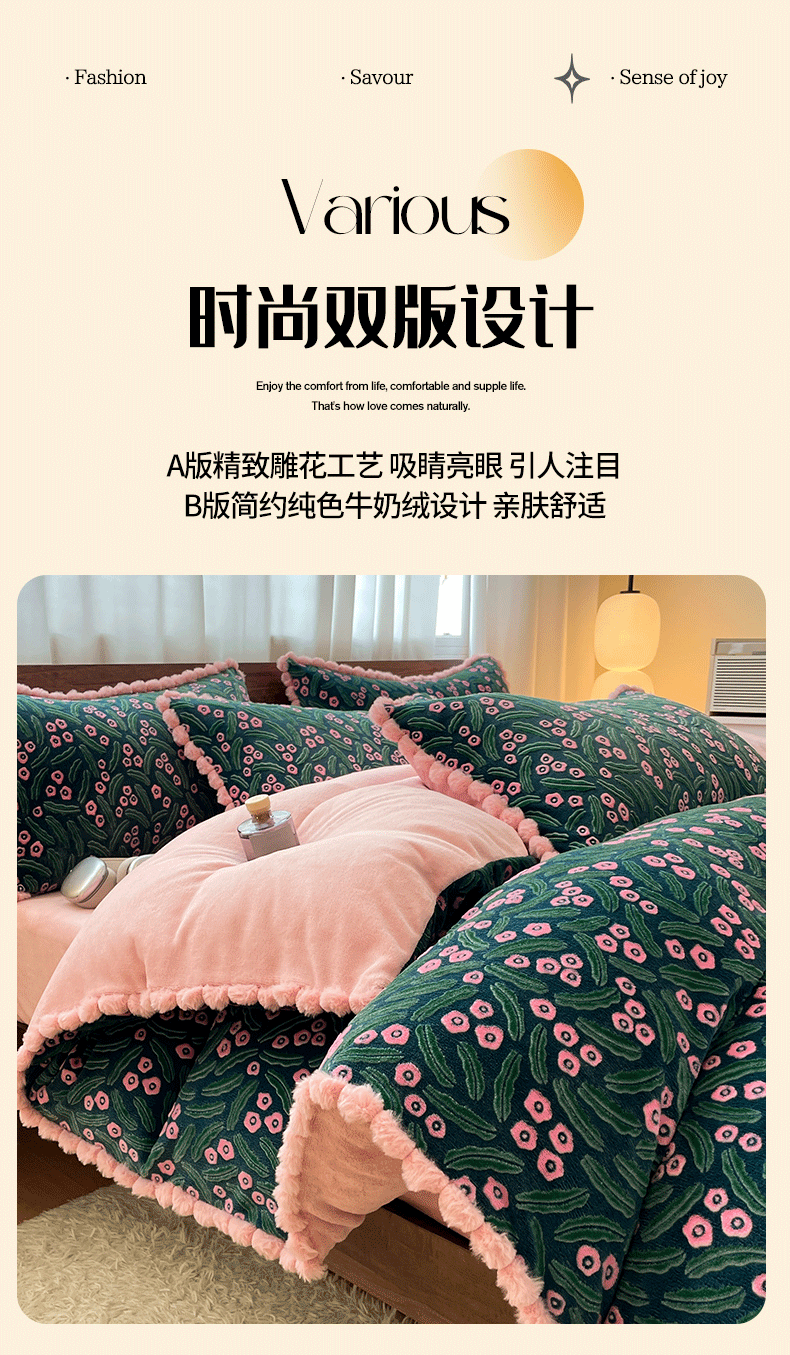 商品名称:羚羊语家纺 2025新款230克全消光雕花绒牛奶绒兔毛球四件套轻奢风立体着色烂花牛奶绒提花加厚保暖床单床笠三件套 蜜绒绒-月华韵