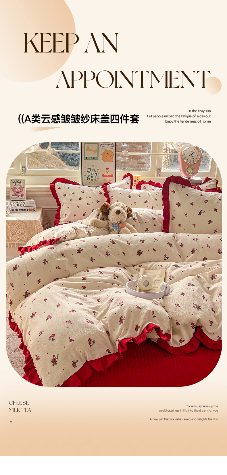 (总)美梦家纺 2026春夏新款云感皱皱纱床盖四件套,玫瑰园,芭比兔,波点咖,椿庭序,见花则喜,蜡笔画,葡萄多多,俏皮狗,苏槿,星眠云野,枝语花繁,竹歆花语