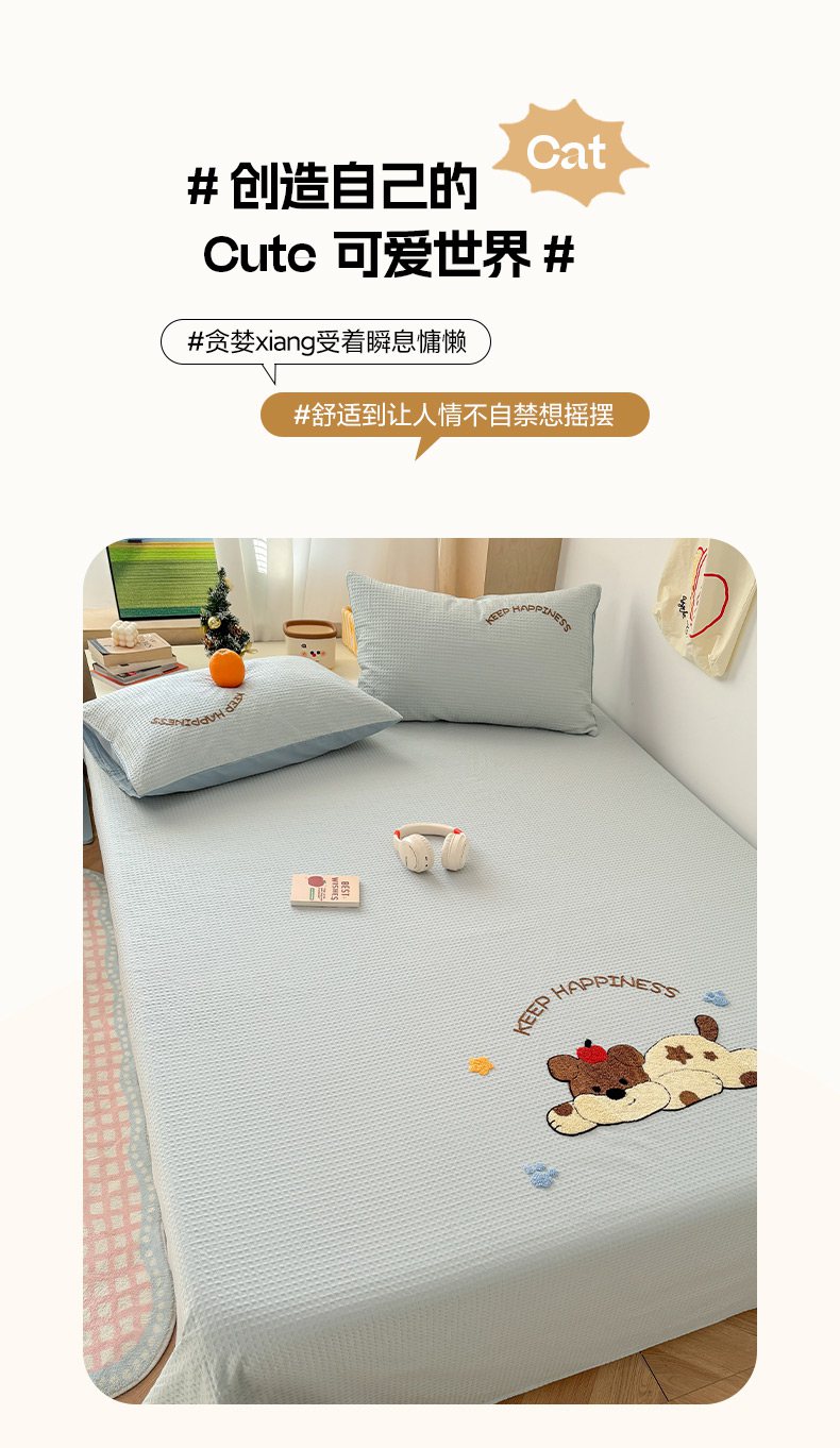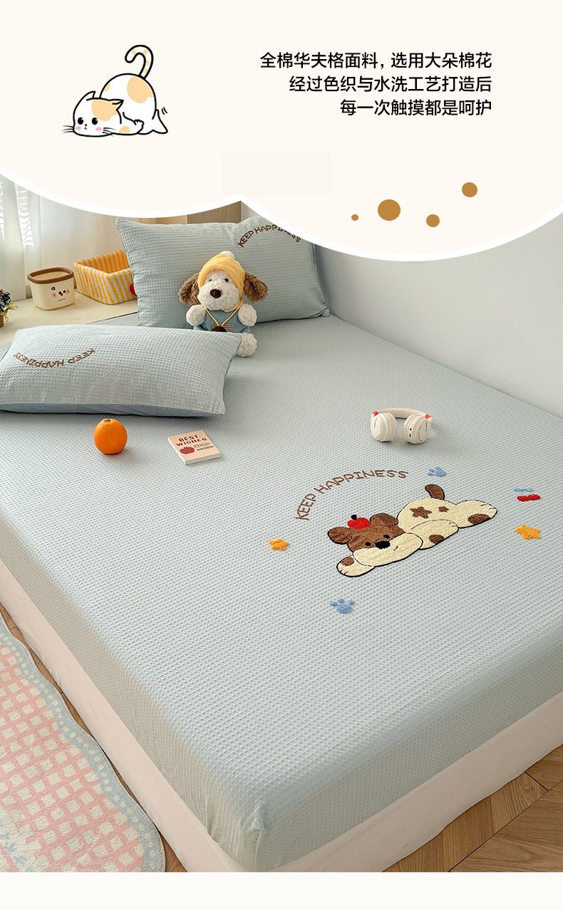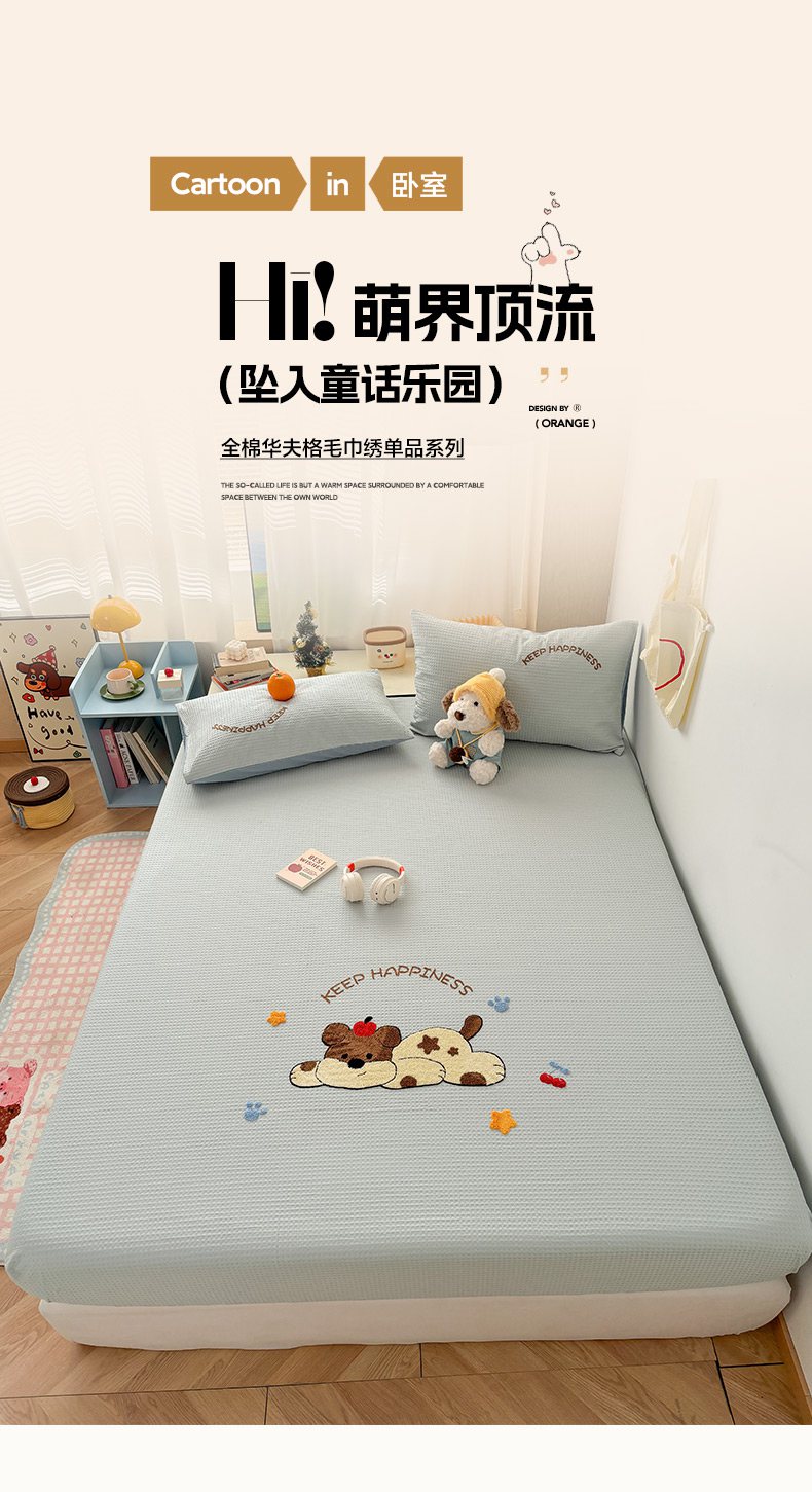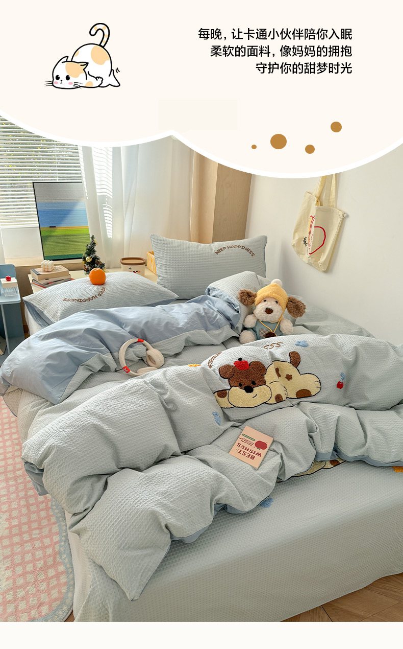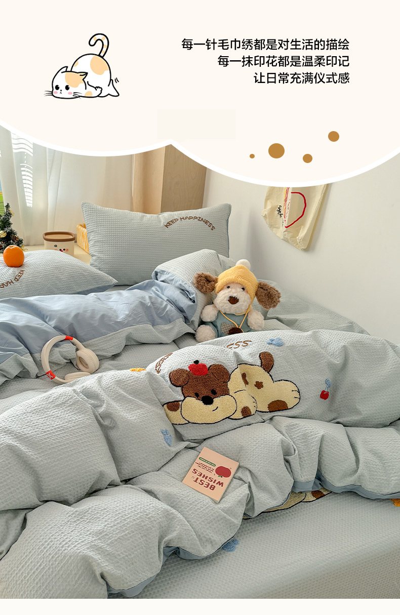 当前位置: 91家纺网 > 商品网购 > 床品套件 > 四件套 > 全棉普通四件套 > 雅居纺家纺 2026新款全棉华夫格毛巾绣单品系列 蓝色趴趴狗