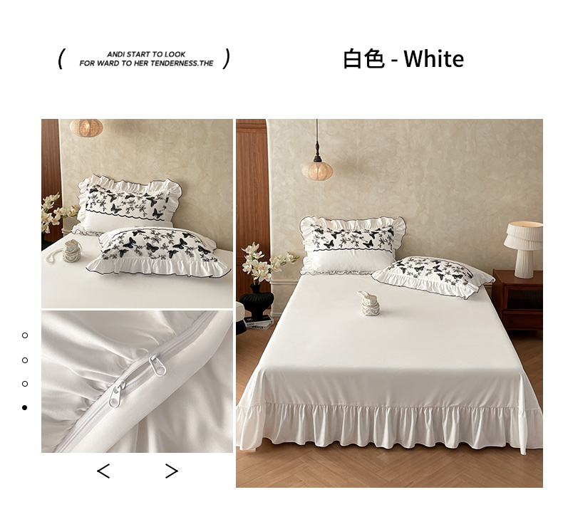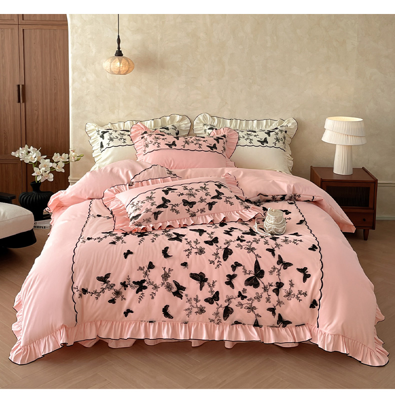 当前位置: 91家纺网 > 商品网购 > 床品套件 > 四件套 > 其它四件套 > (总)乐卧家居 2026新款130克磨毛法式宫廷感浪漫精致刺绣丝黑蝴蝶荷边四件套-蝶梦