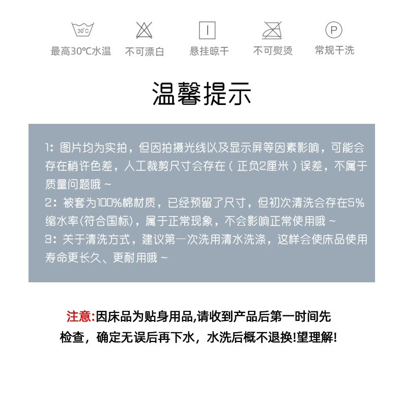 3、通州区市场监督局友情提醒,近期涉及到床上用品不褪色不掉毛不缩水的投诉和以世界知名品牌图案为面料的床品举报较多。请各商家自检自查,对照整改或进行下架处理。