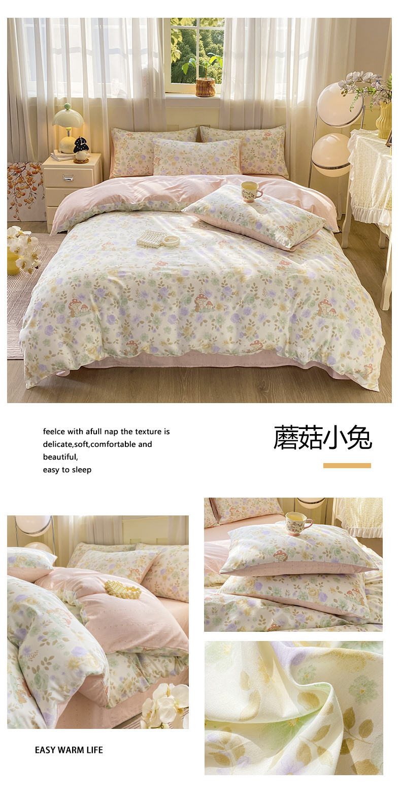 当前位置: 91家纺网 > 商品网购 > 床品套件 > 四件套 > 全棉普通四件套 > 红日子纺织品 2026新款小清新12868全棉纯棉学生卡通款四件套 蘑菇小兔