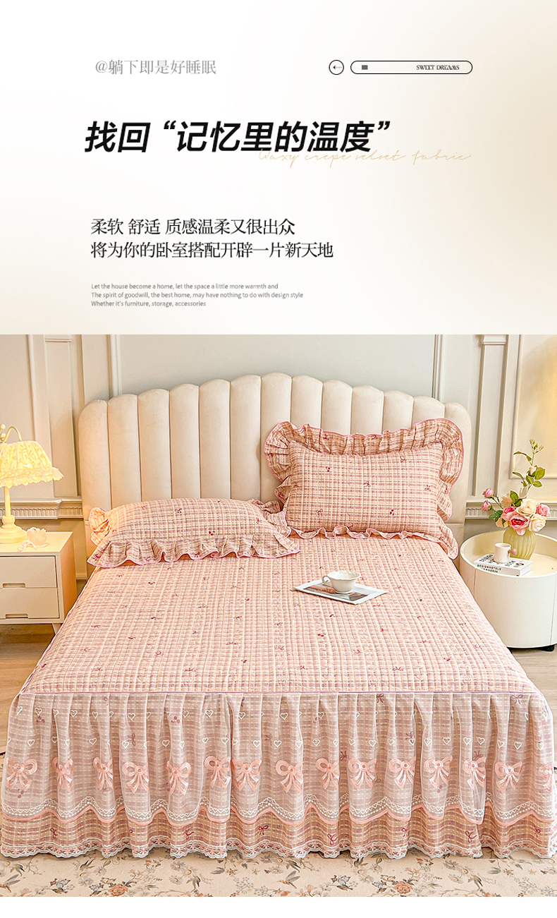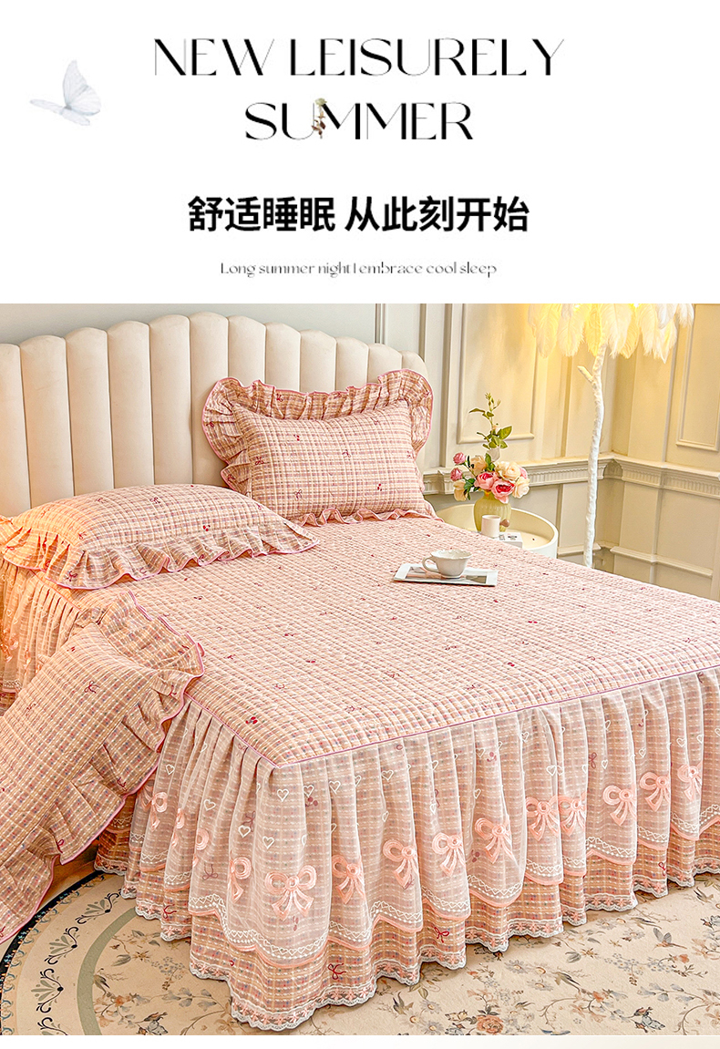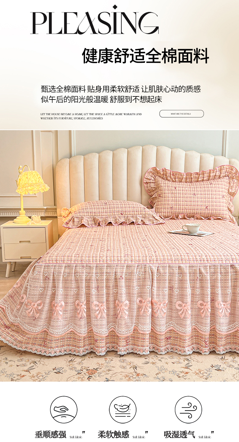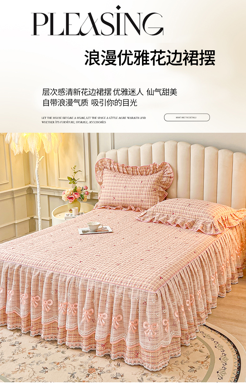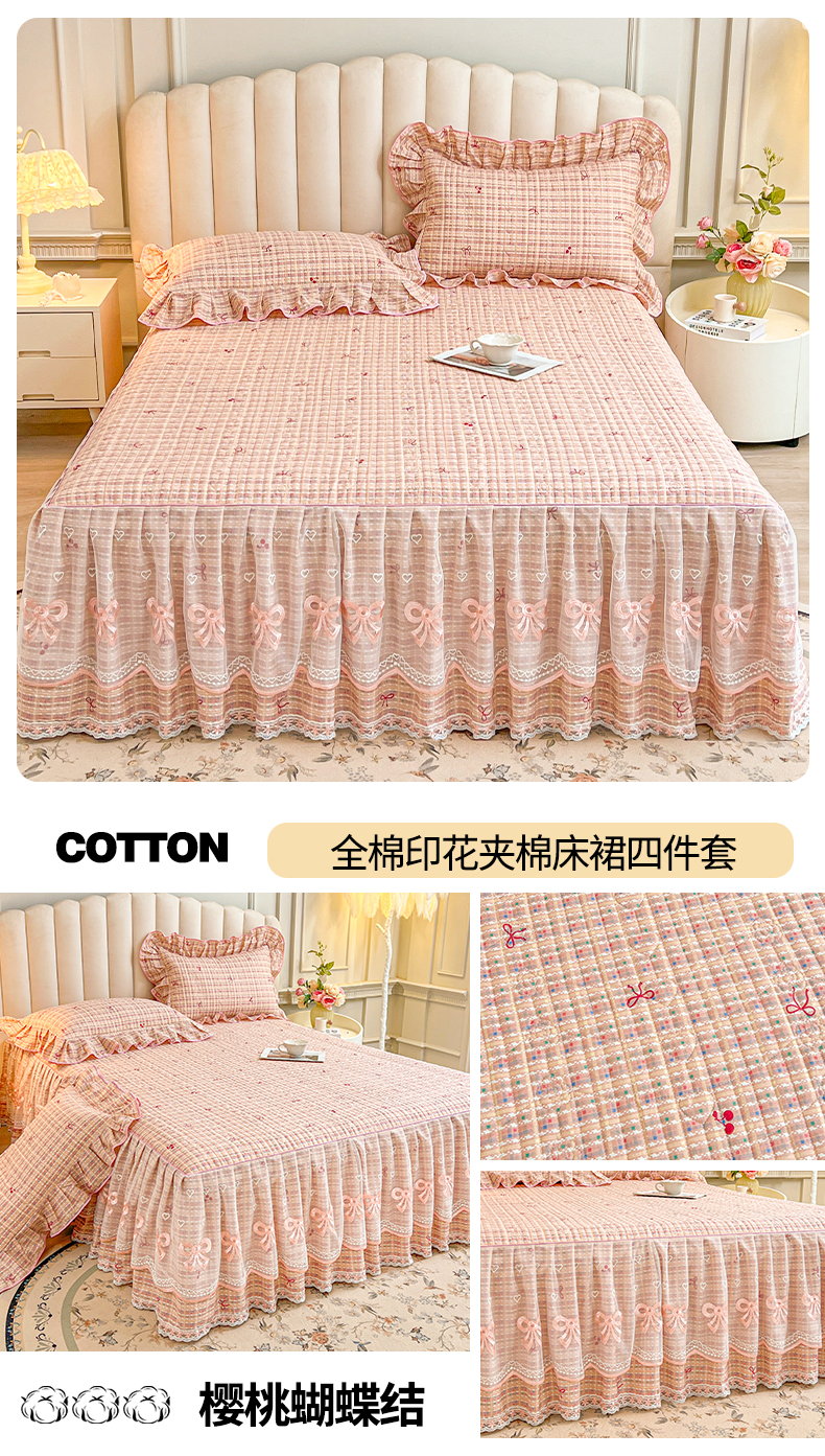 当前位置: 91家纺网 > 商品网购 > 床品套件 > 三件套 > 宜凡家纺 2026新款全棉公主风夹棉床裙三件套 樱桃蝴蝶结