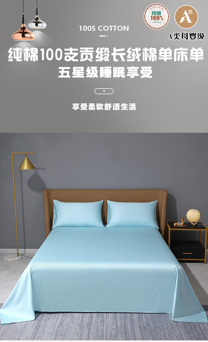 晶缦家纺 2026新全棉A类纯棉100支贡缎长绒棉纯色多规格单床单 床单单件-绮云系列 绮云-浅天蓝