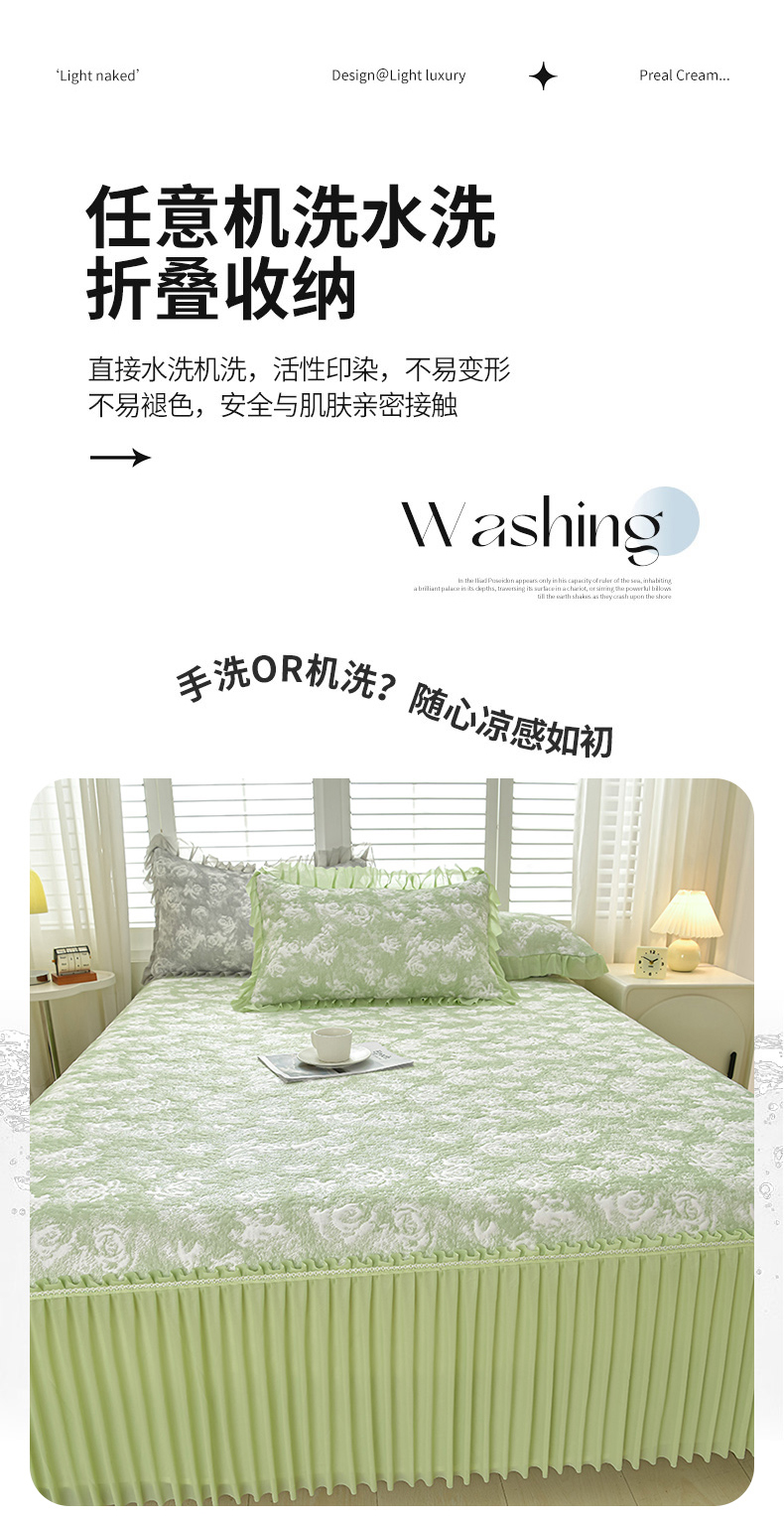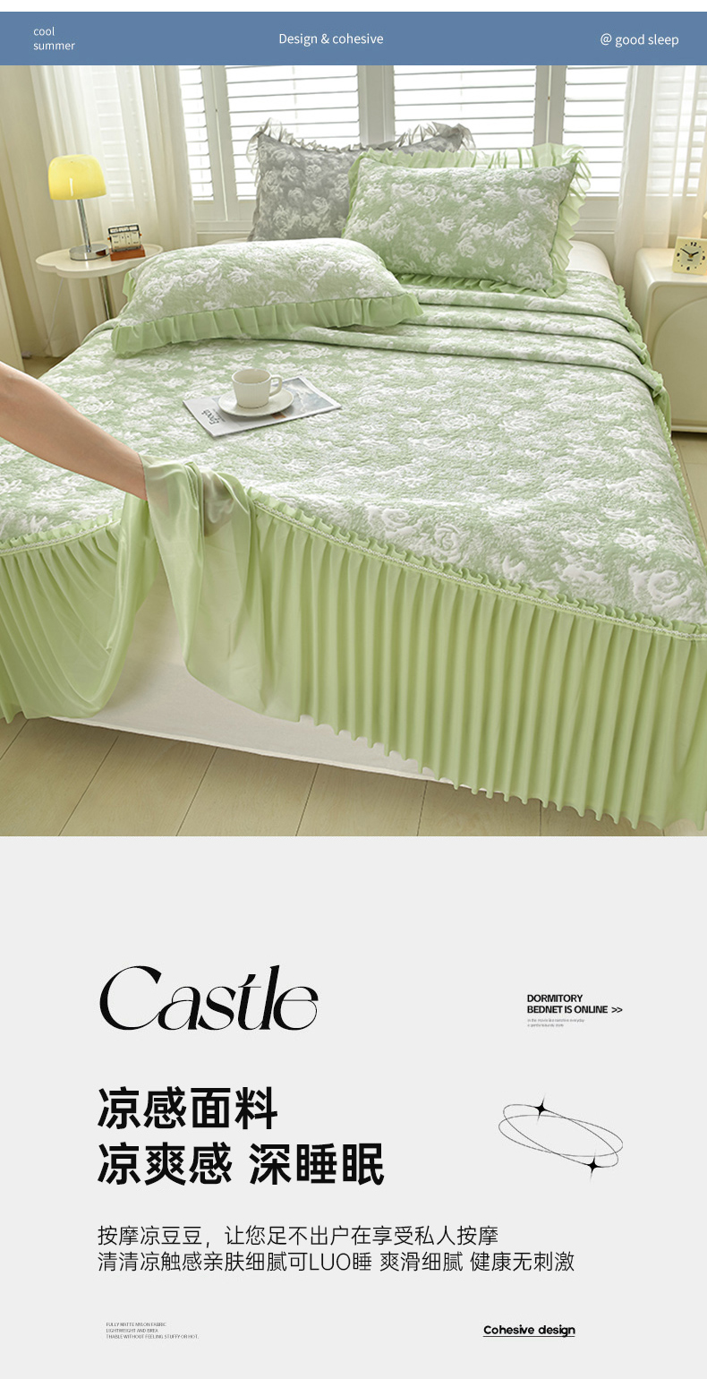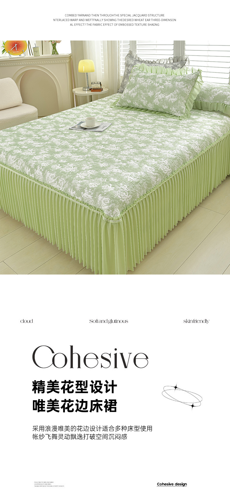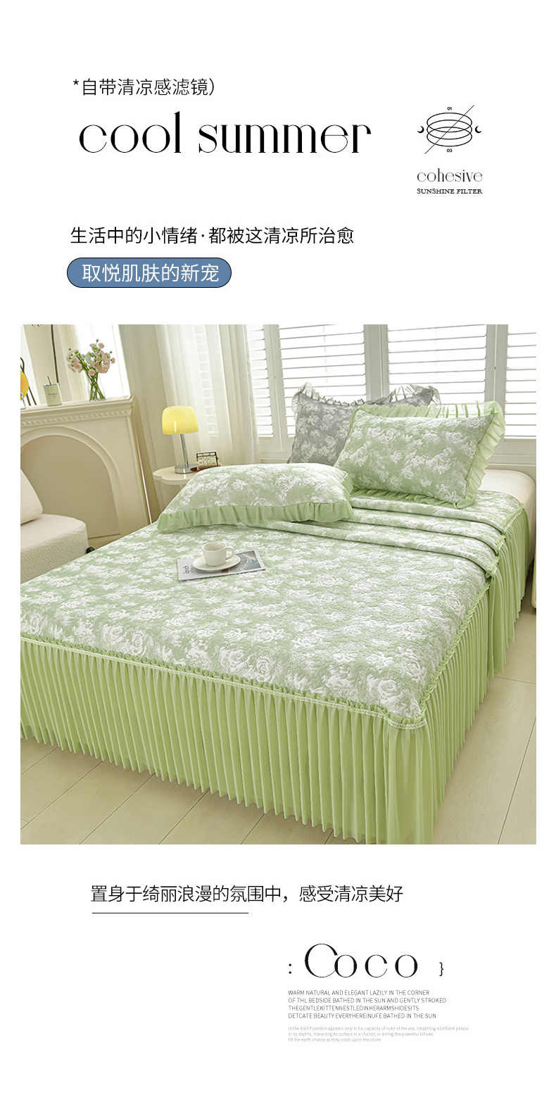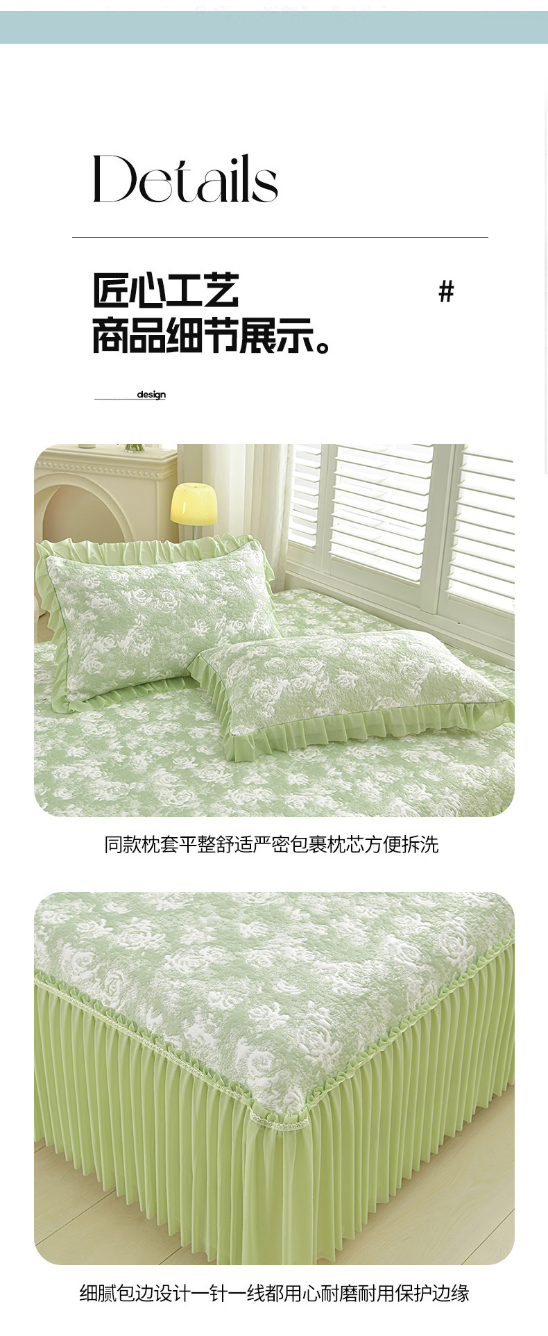 畅畅家纺 2026春夏新款聚乙烯中分子双面提花高克重凉感冰感凉豆豆床裙三件套-经典玫瑰 经典玫瑰-绿