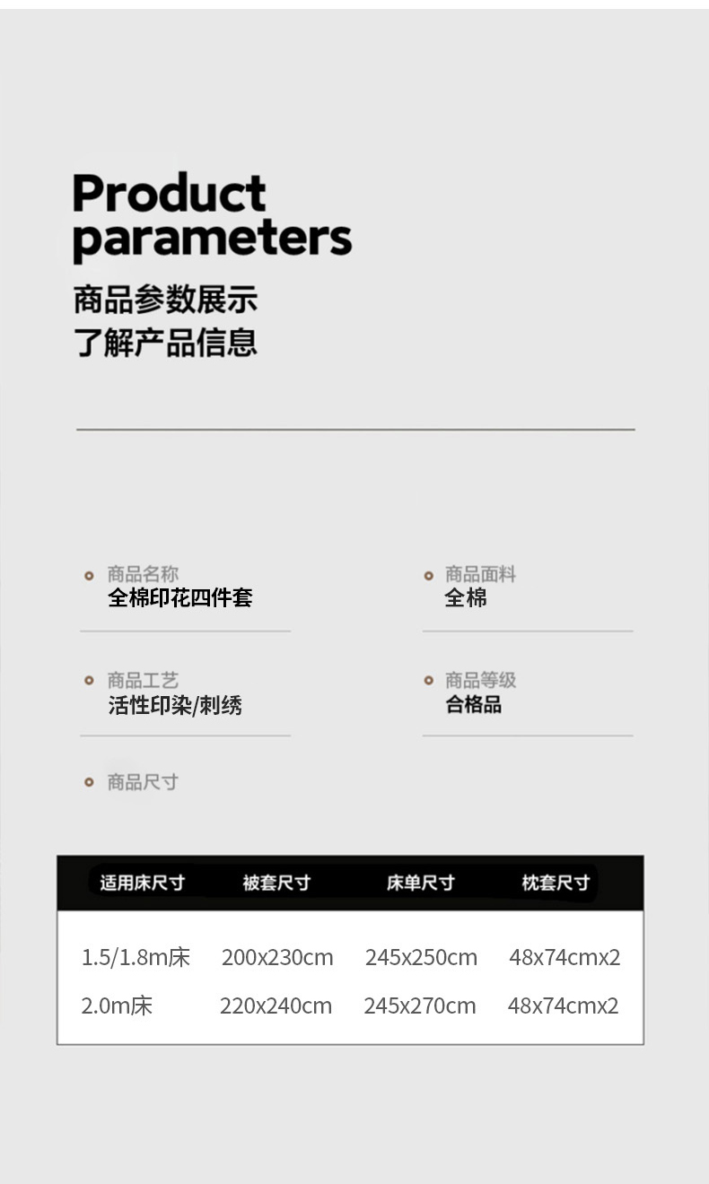 1.8m床单款四件套(被套200*230cm床单245*250cm枕套48*74cm*2) | ¥85.00 |