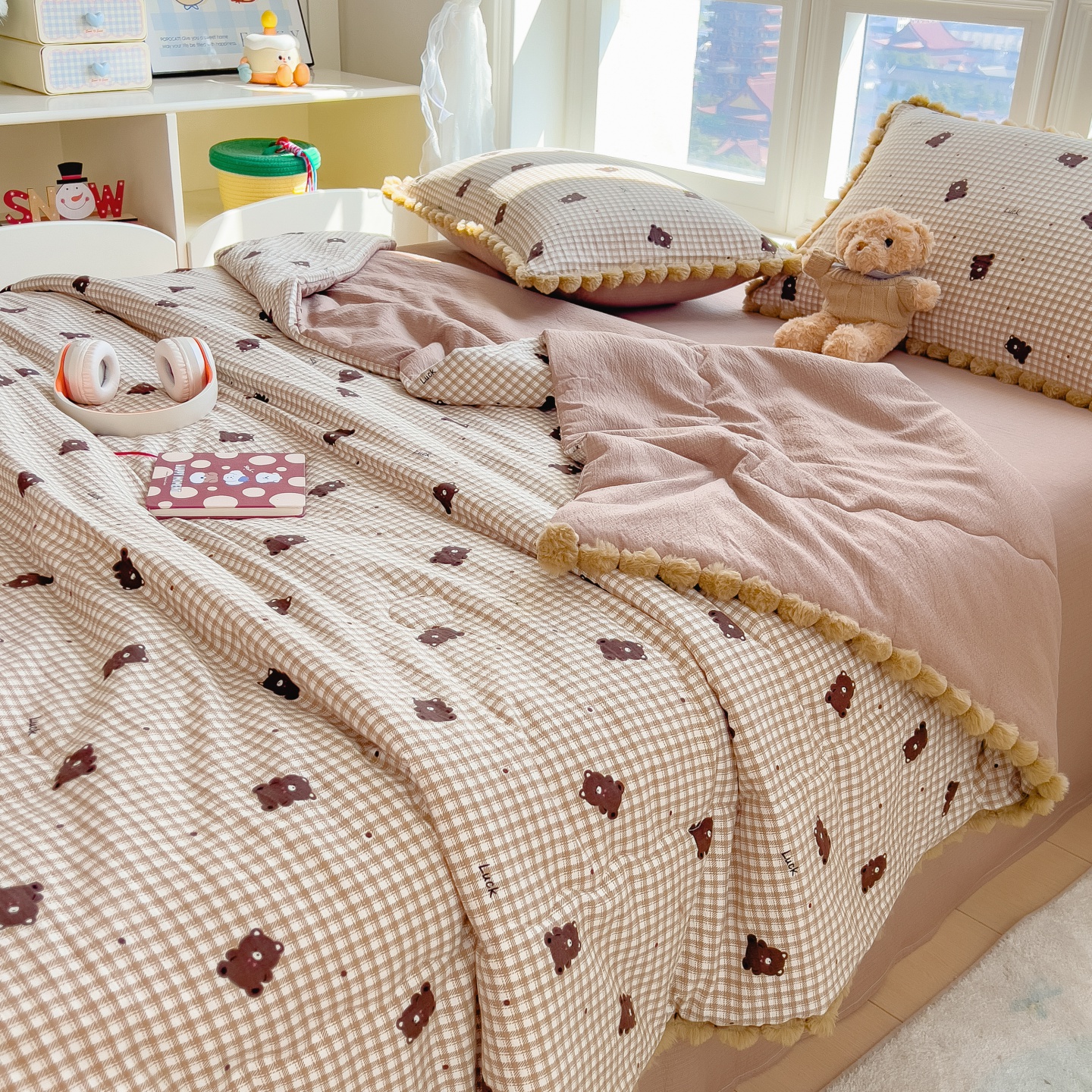 • 91家纺网 家纺一手货源 找家纺 (总)梵克保罗 2026春夏新款10A抗菌毛球花边皱皱纱夏被单夏被空调被夏被四件套,花乡小熊,蓝星狗,乐趣,萌兔花园,沐春,素锦纹,雾格马