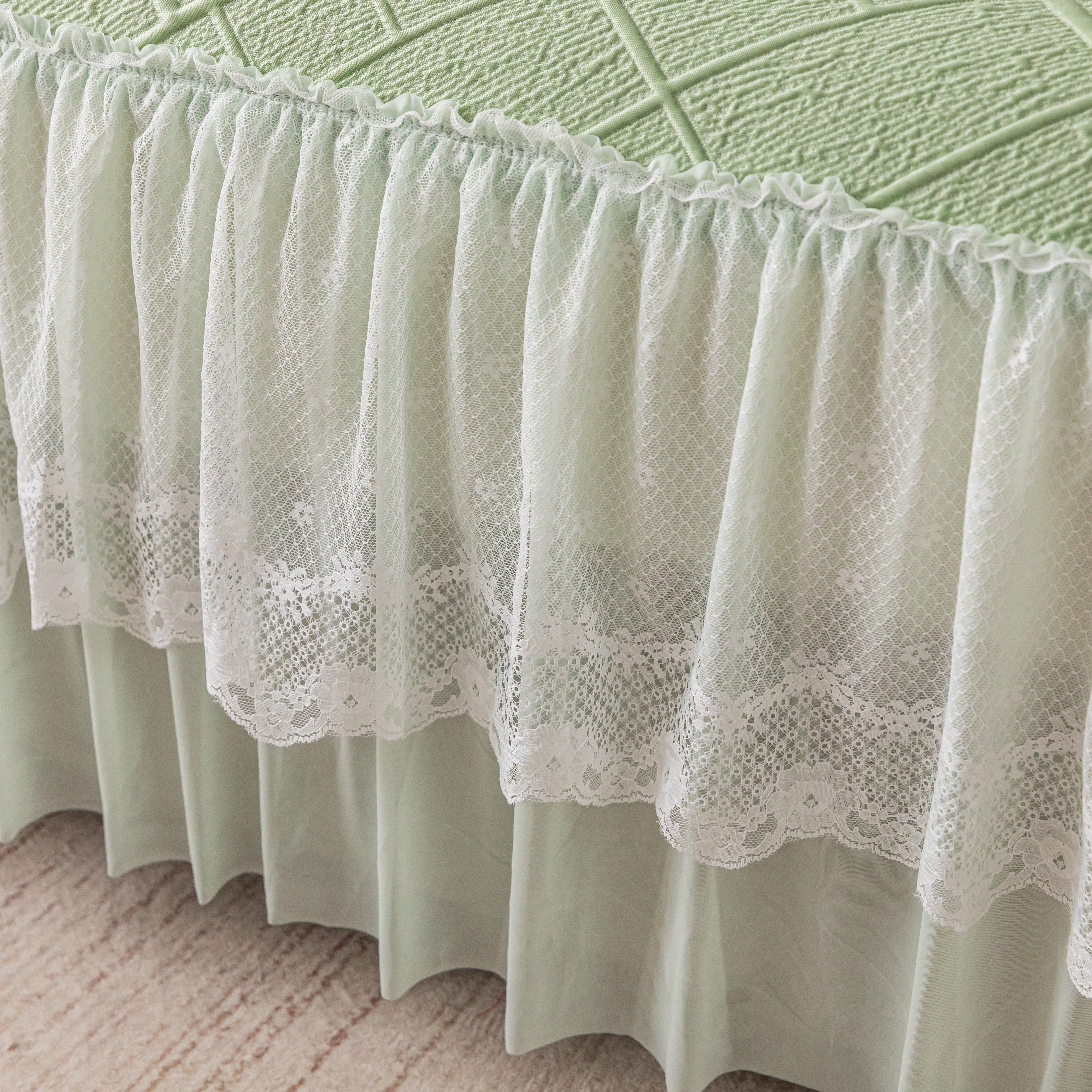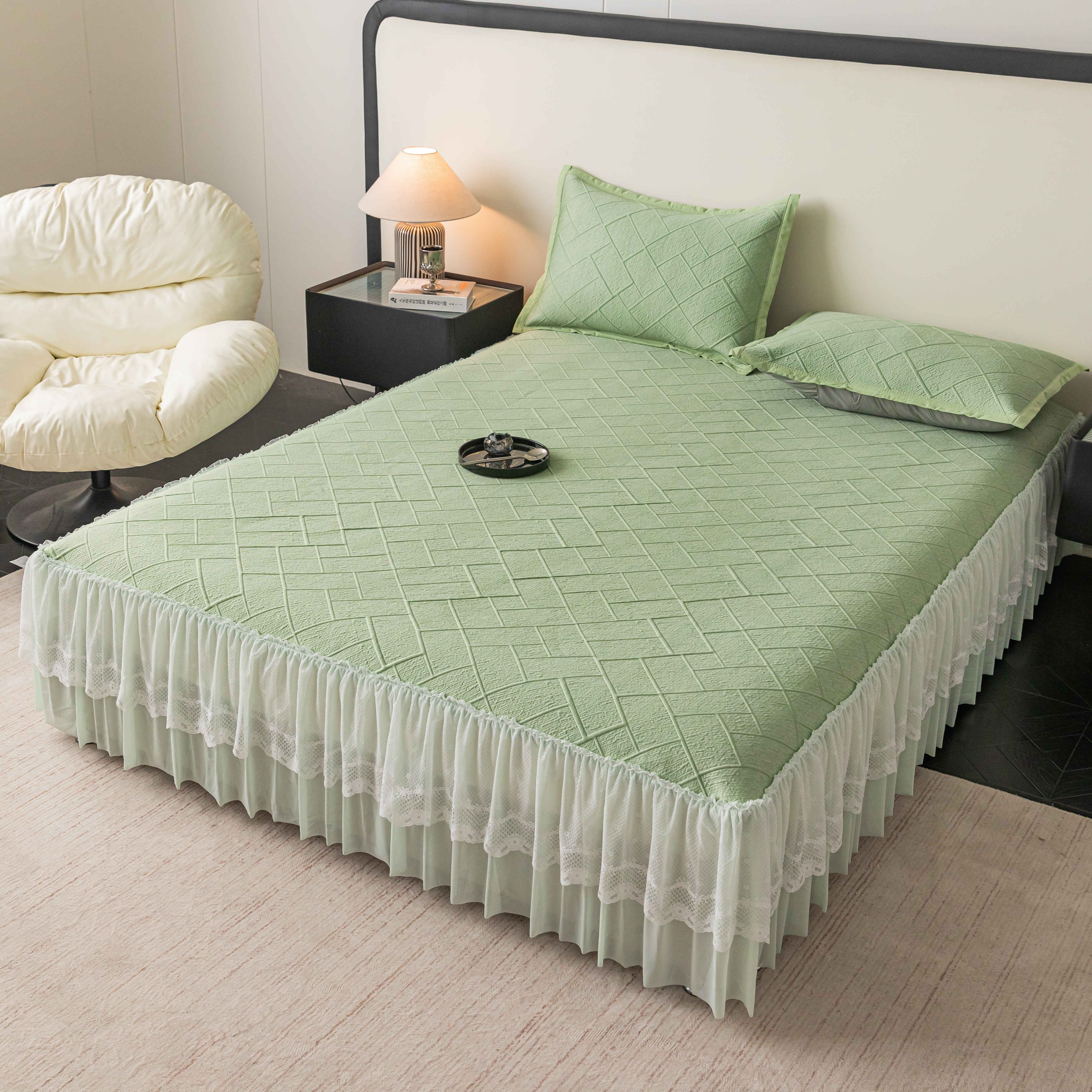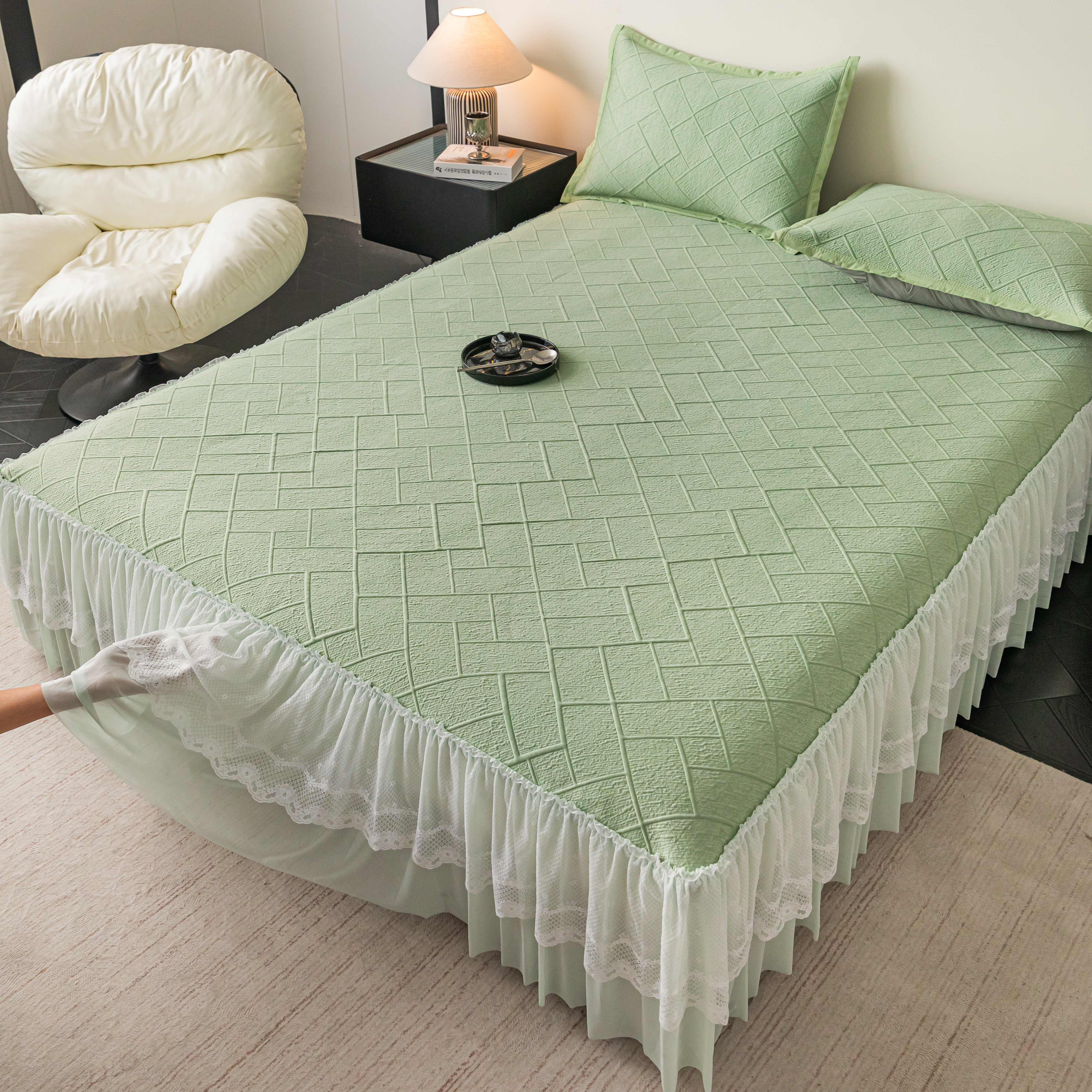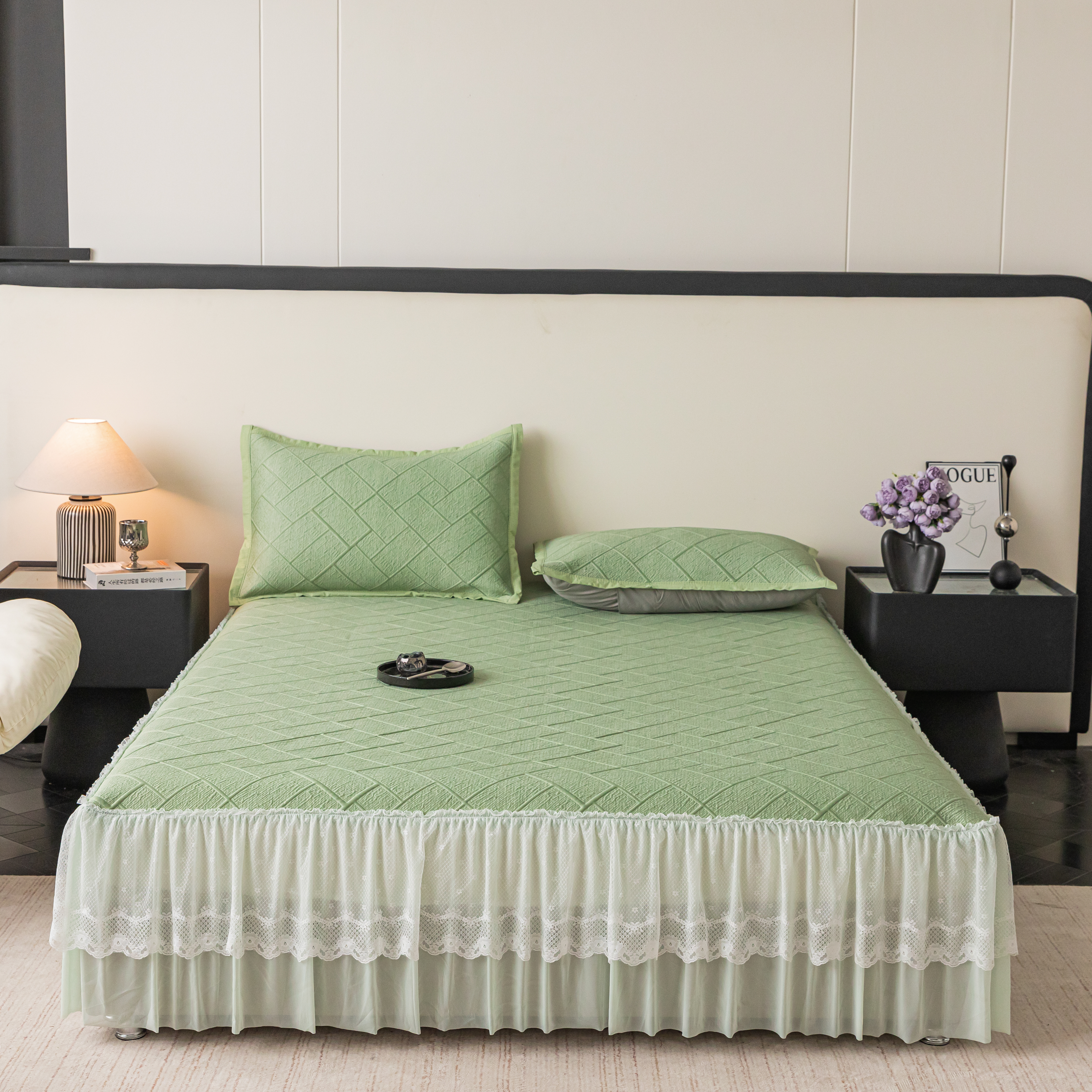 (总)栩裕纺织 2026新款全棉双层纱棉花边榻榻米炕盖款,波点粉,波点灰,波点绿,波点米,波点杏,波点紫,组合图仅供参考