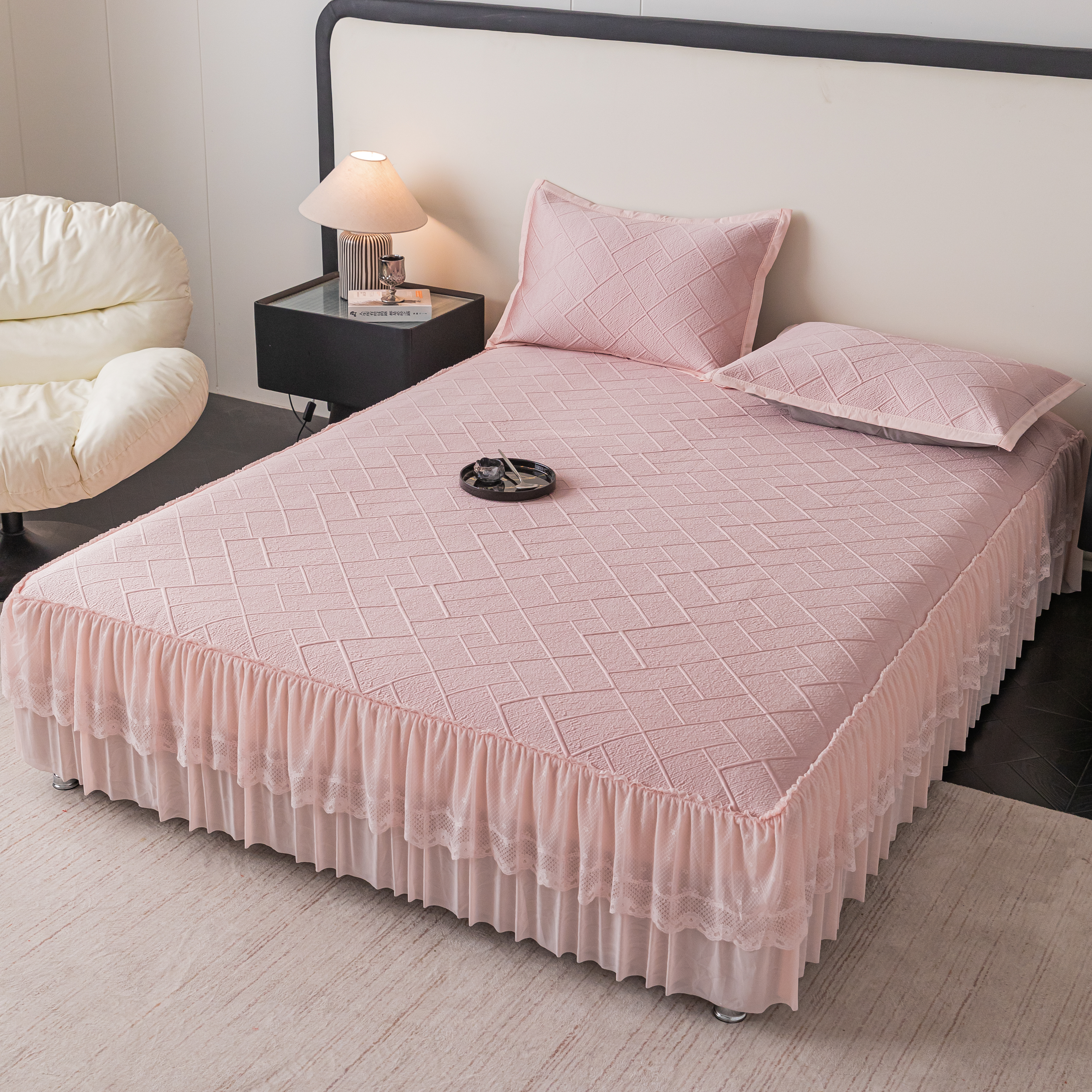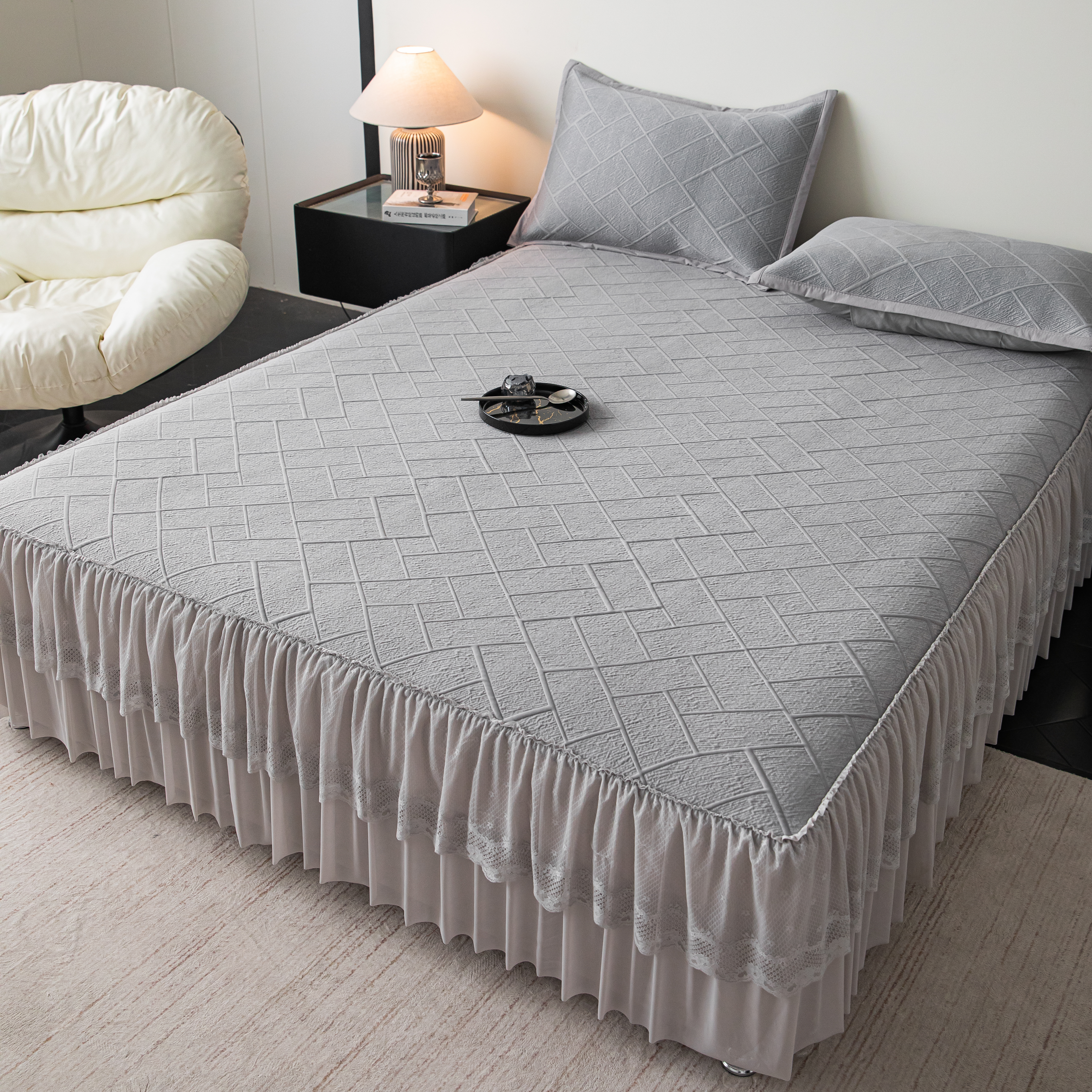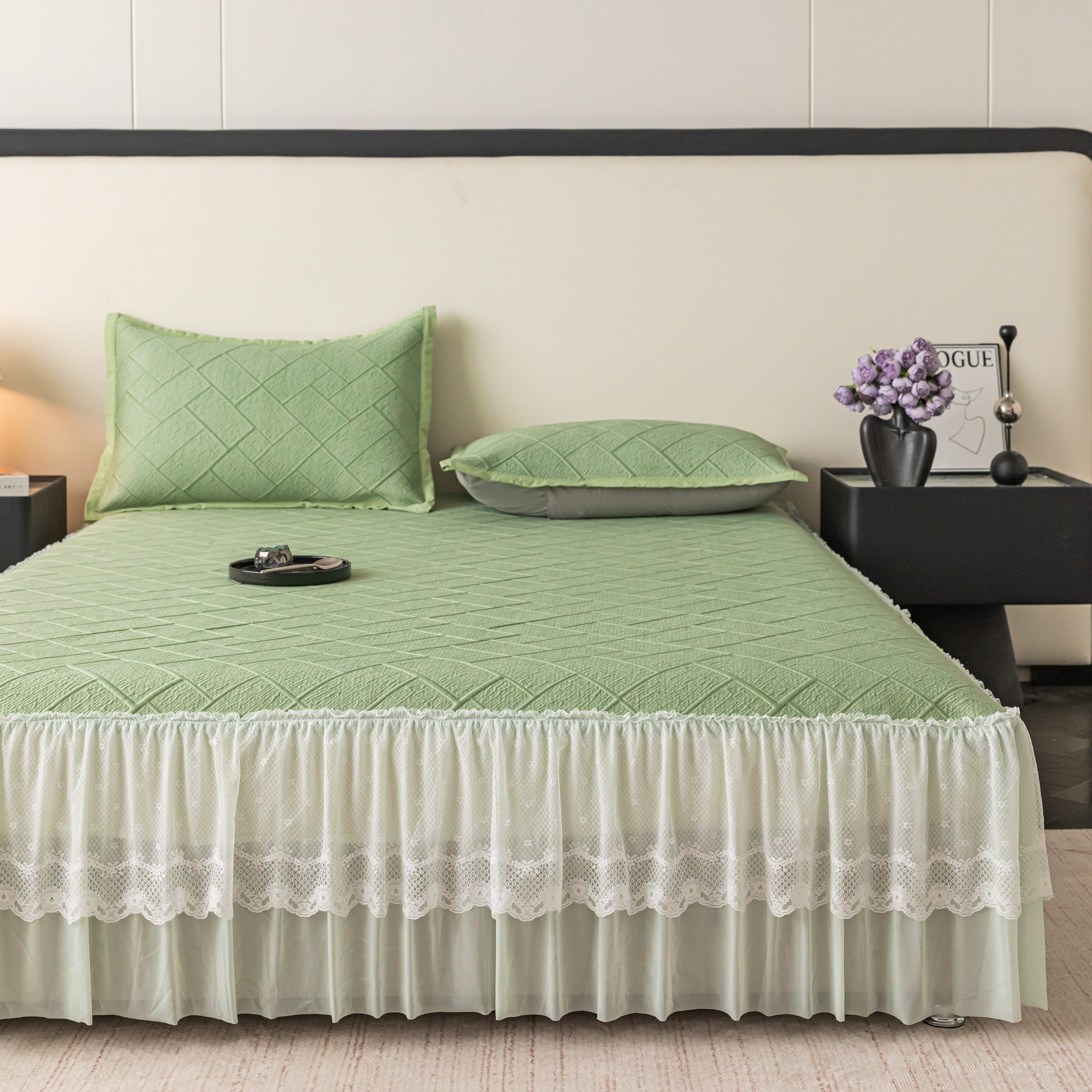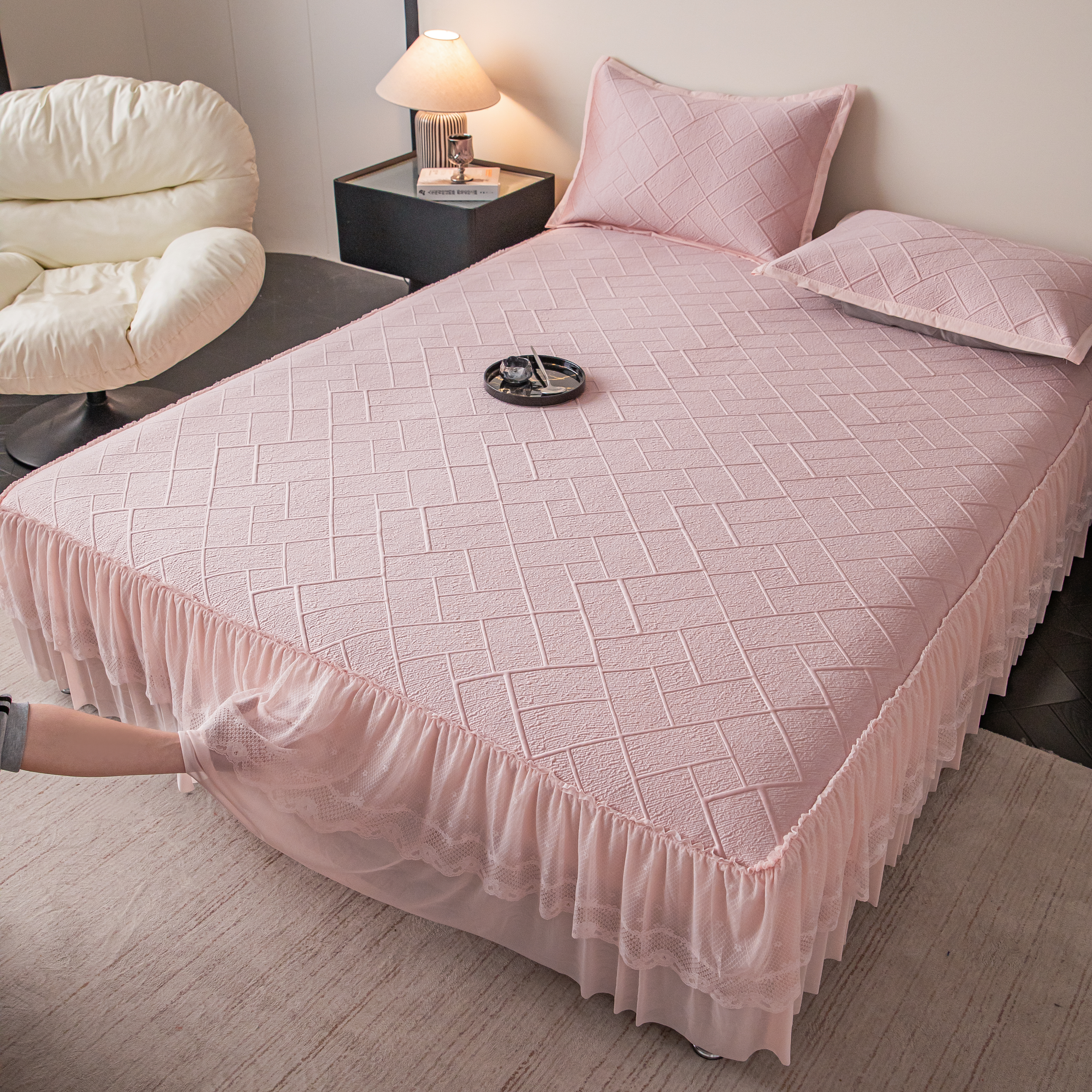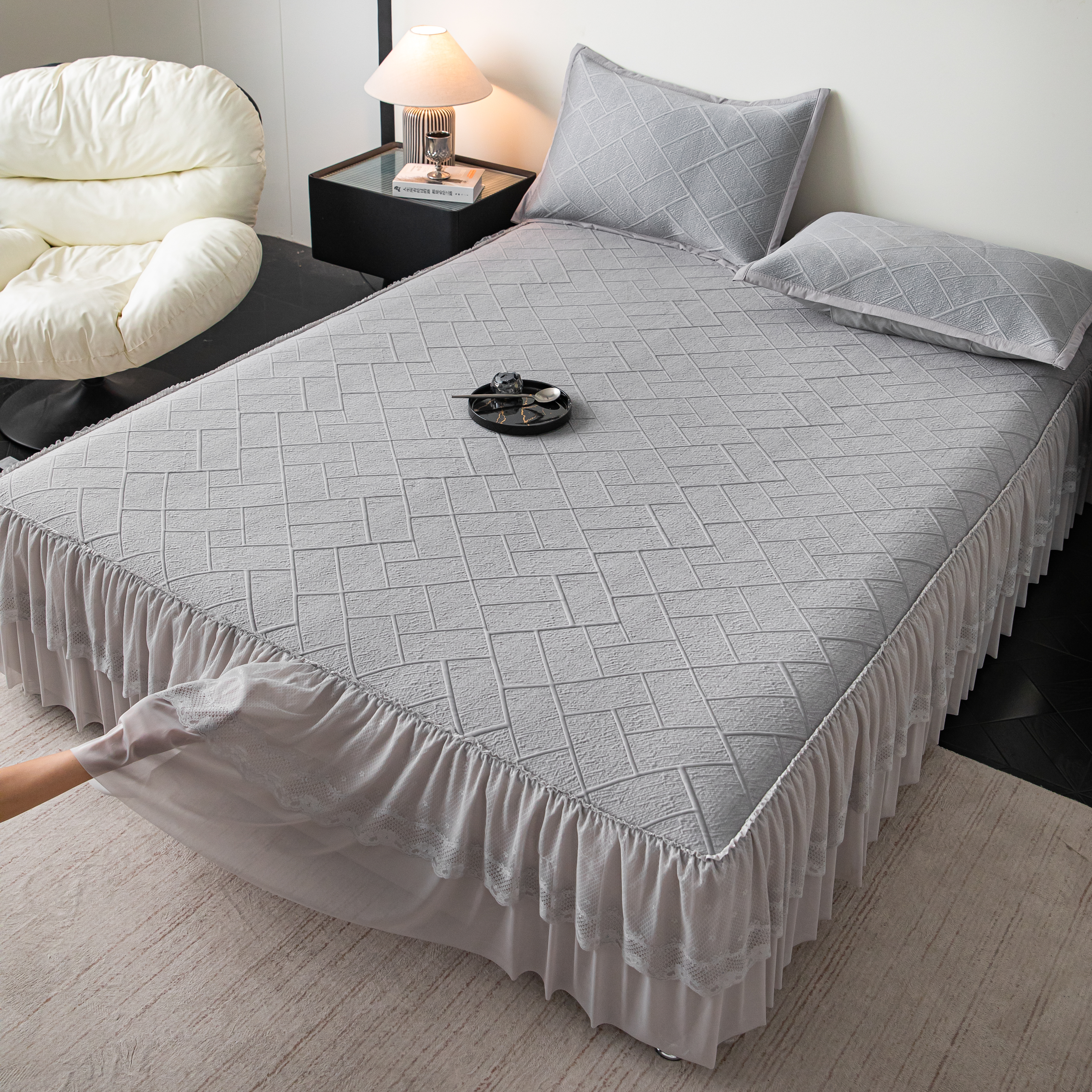 (总)栩裕纺织 2026新款全棉双层纱棉花边榻榻米炕盖款,波点粉,波点灰,波点绿,波点米,波点杏,波点紫,组合图仅供参考