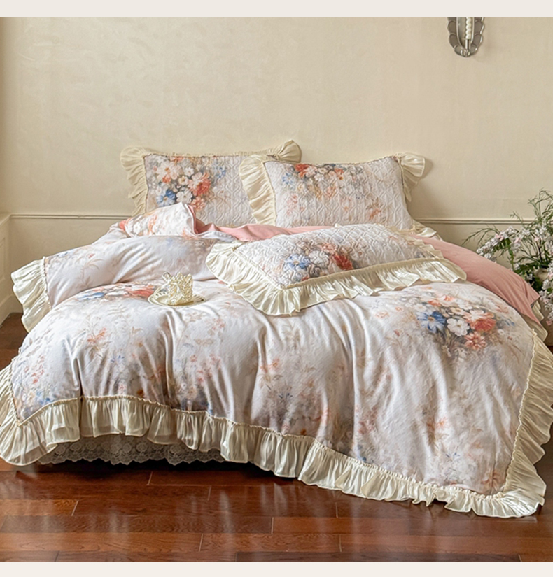 (总)花香四季家纺 2026新款法式天丝棉蕾丝雪纺仙女风夹棉床裙款四件套,赫本-粉色,赫本-米白色