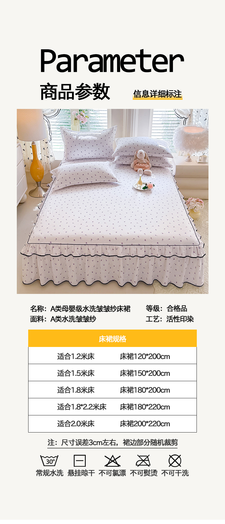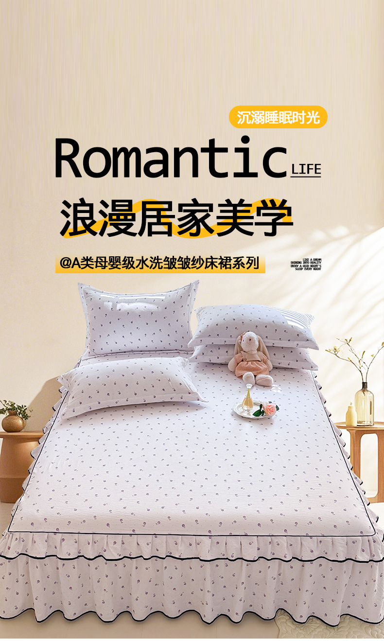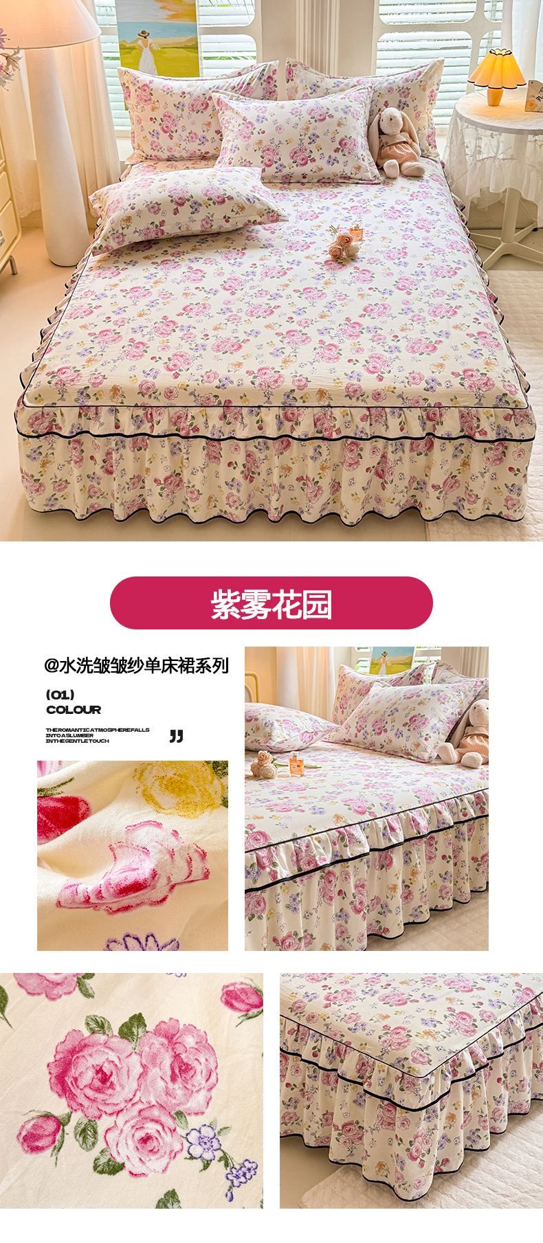• 91家纺网 家纺一手货源 找家纺 优家居 2026新款A类水洗棉床裙单件三件套皱皱纱韩版公主风花边床罩直播爆款外贸定制 一口葡萄